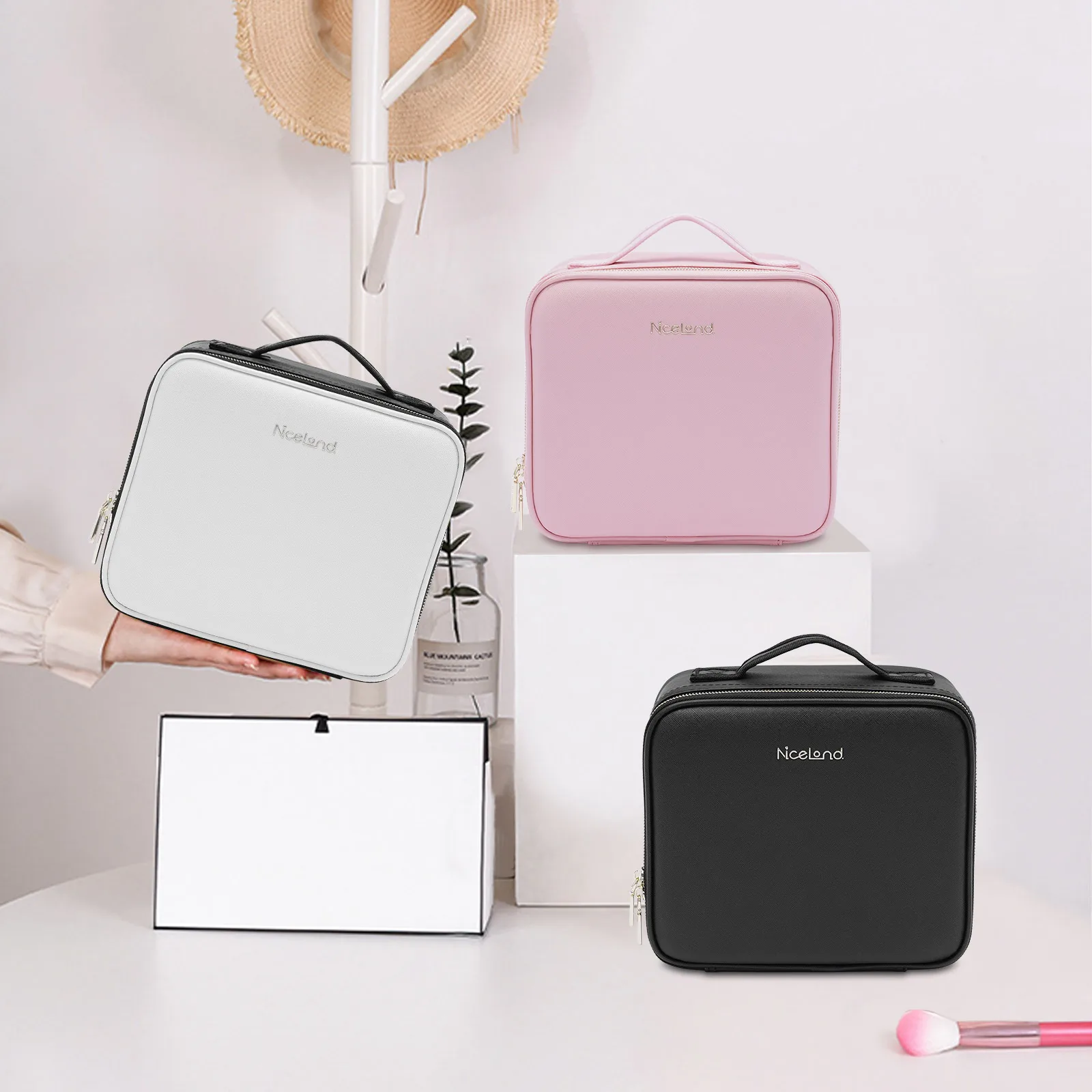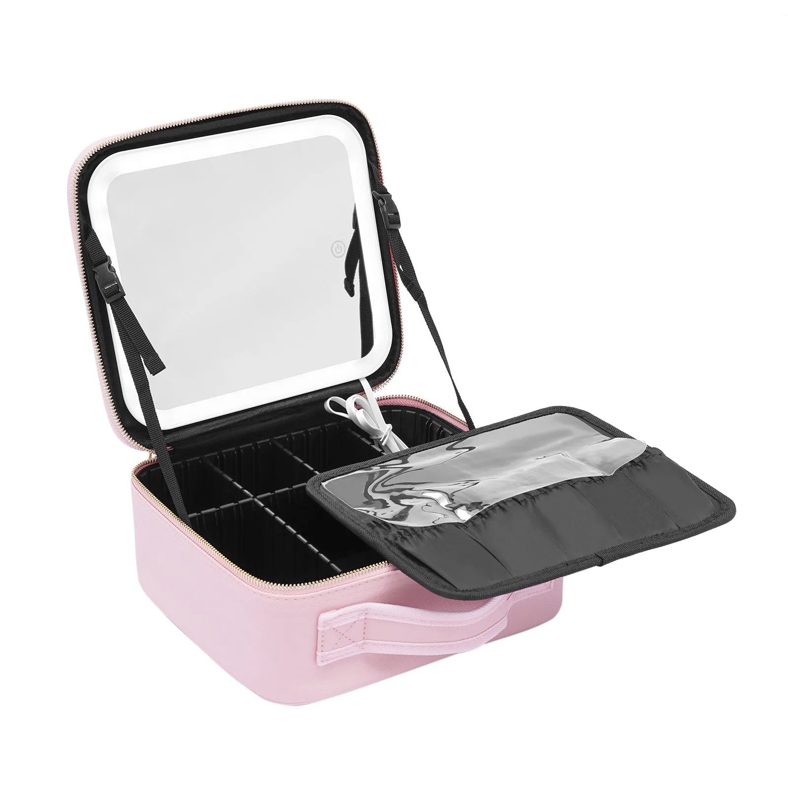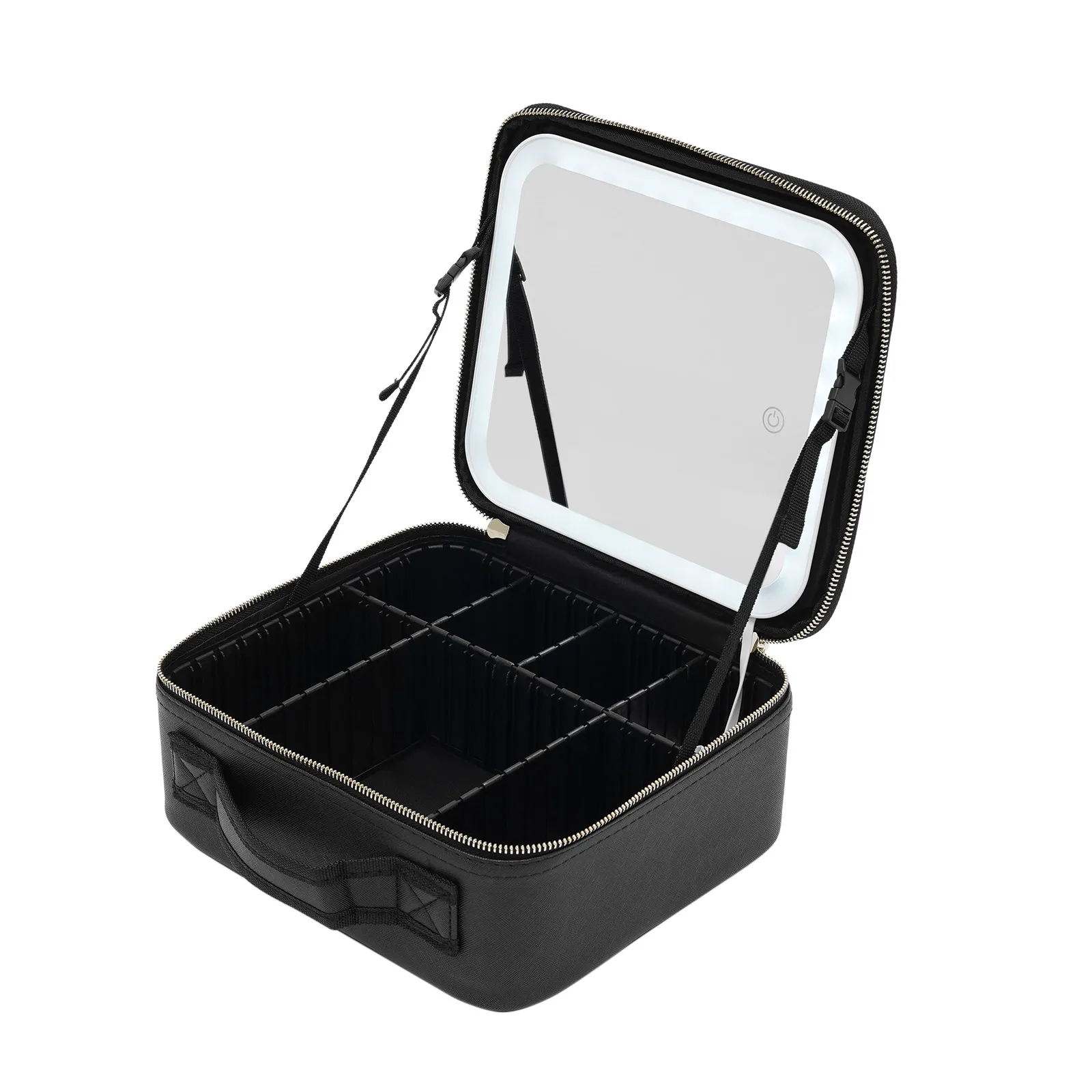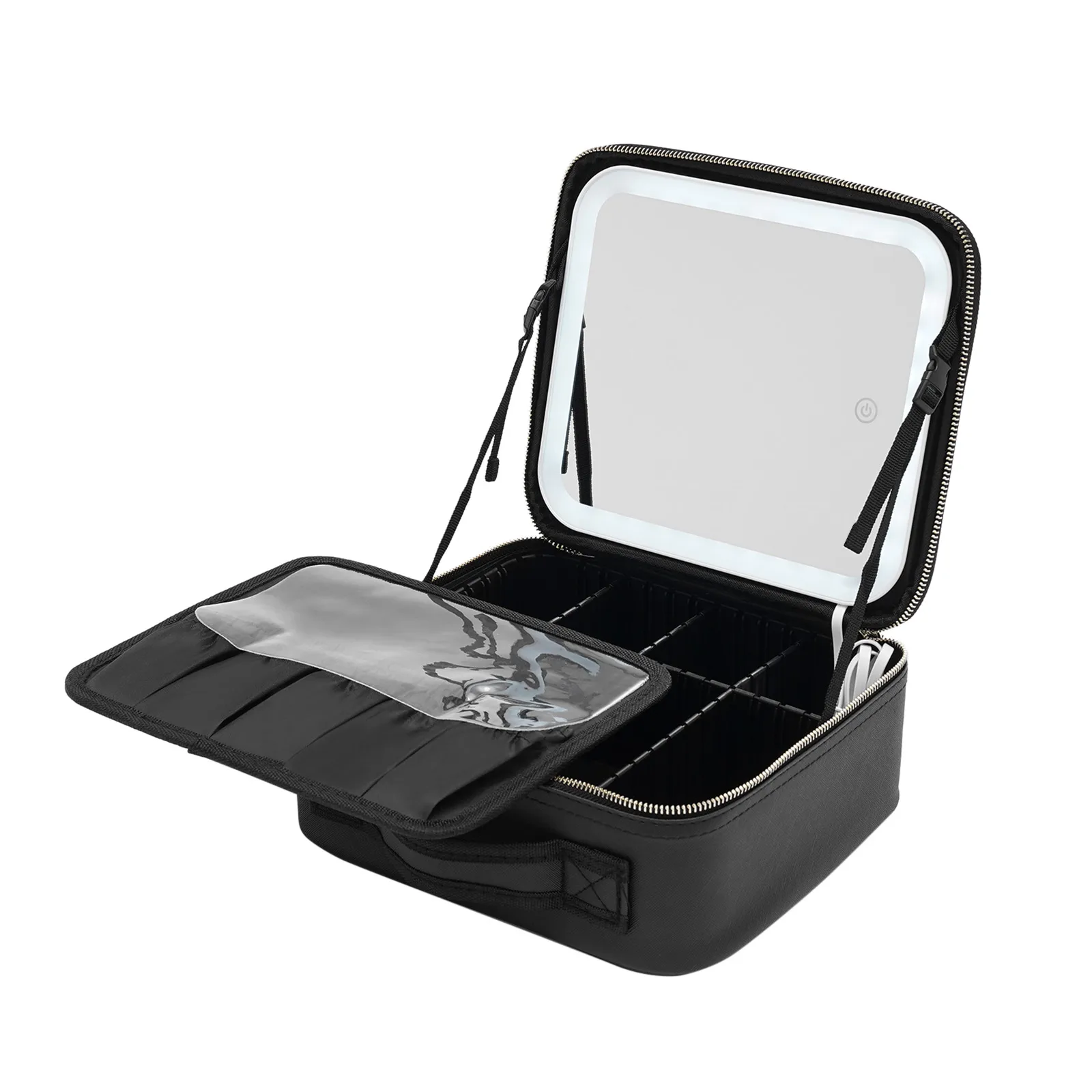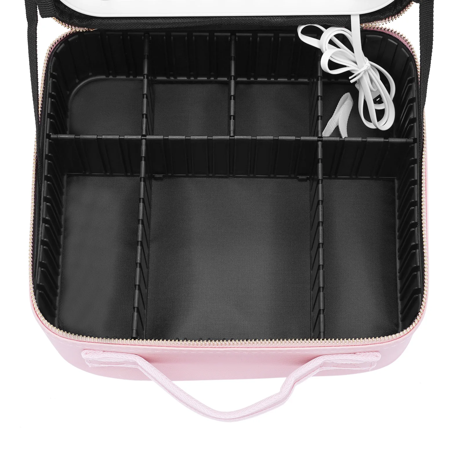Questa borsa per cosmetici viene fornita con 3 luci LED dimmerabili e uno specchio, rendendo una vanità portatile autonoma.Con 7 divisori di diverse dimensioni possono accumulare flessivamente i tuoi cosmetici di diverse dimensioni.La tasca centrale portaoggetti con elastici è per riporre pennelli per il trucco.Quindi consente di dire addio al deposito intordito.