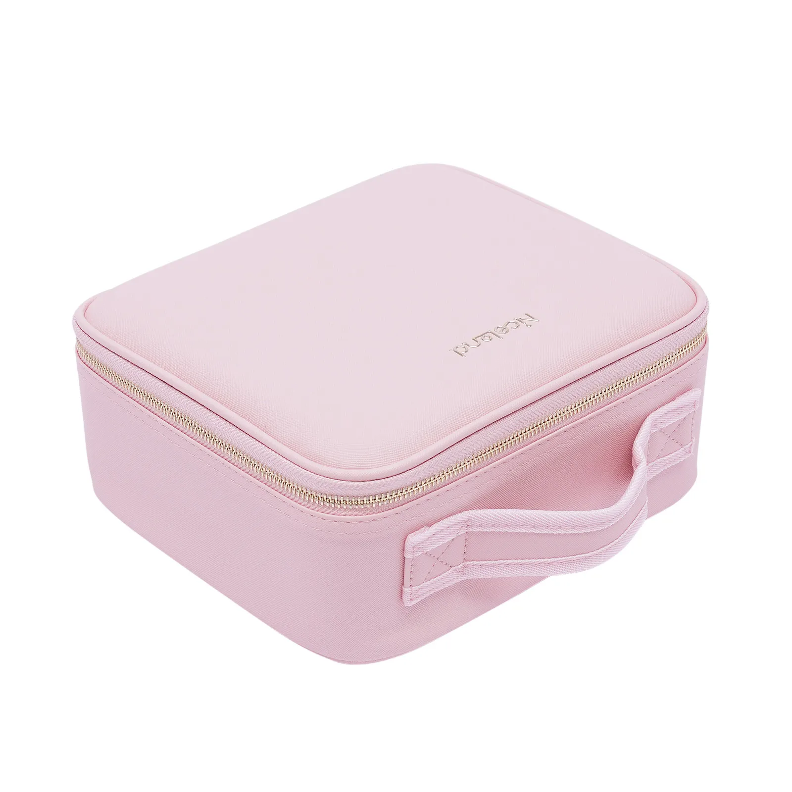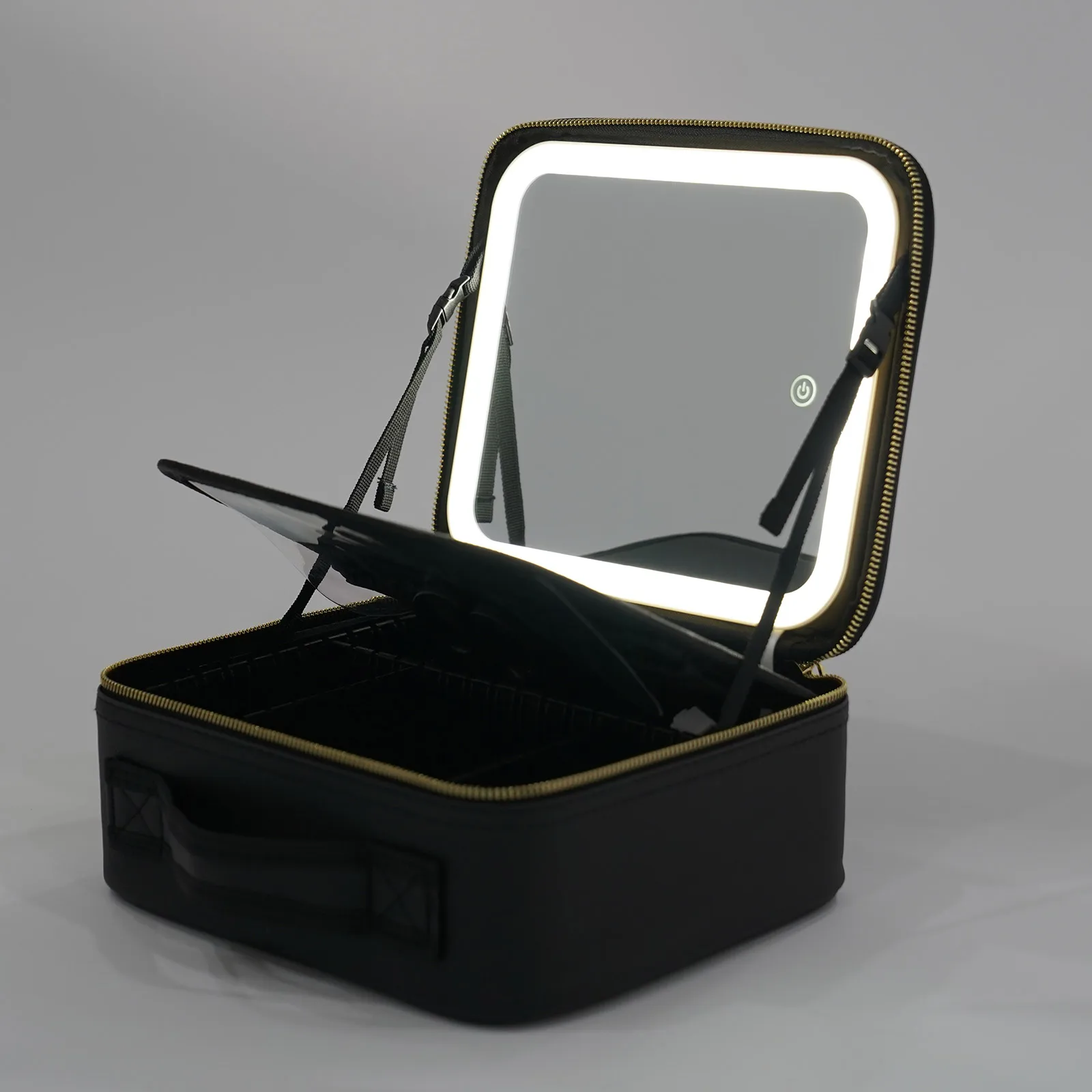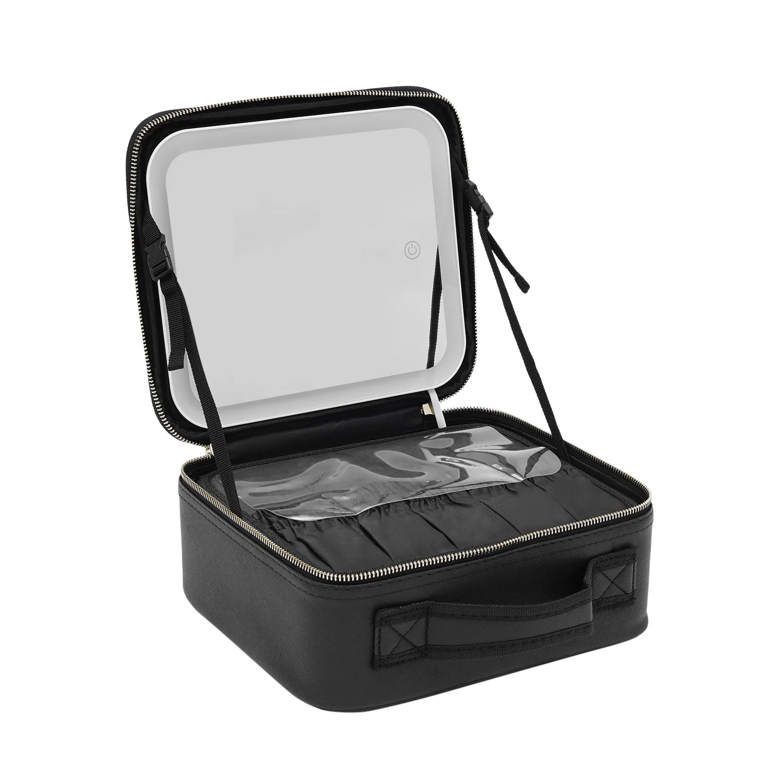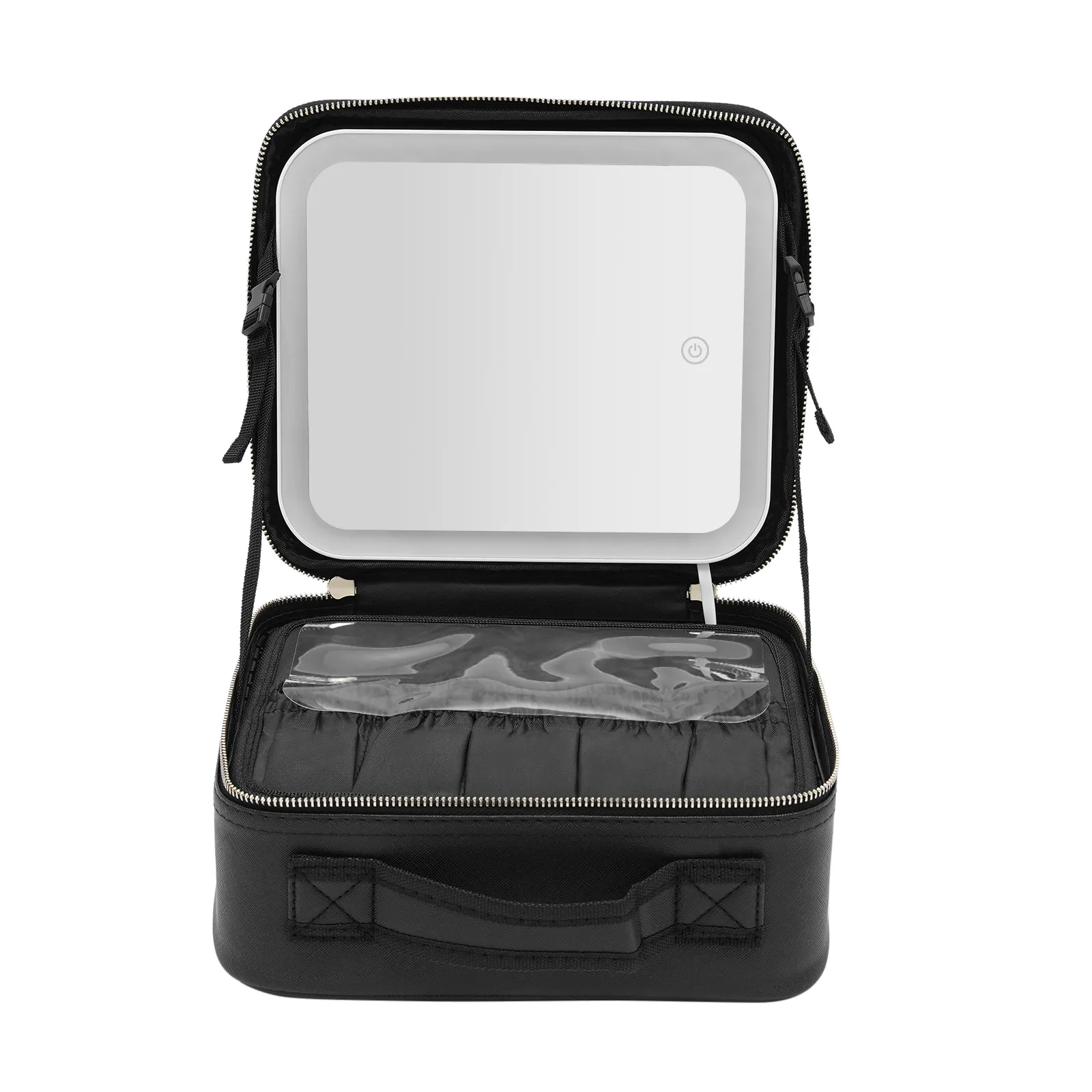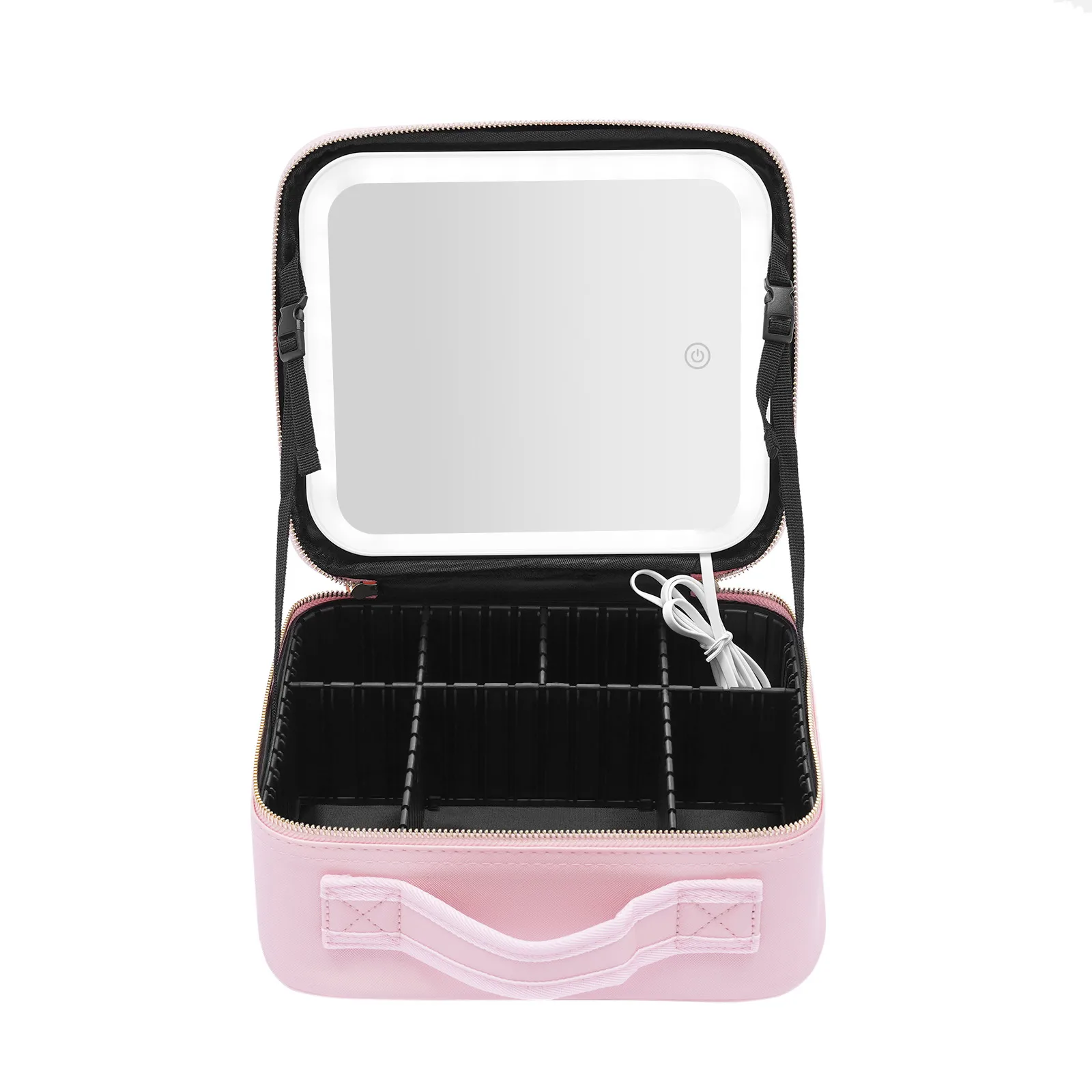 Questa borsa per cosmetici viene fornita con 3 luci LED dimmerabili e uno specchio, rendendo una vanità portatile autonoma.Con 7 divisori di diverse dimensioni possono accumulare flessivamente i tuoi cosmetici di diverse dimensioni.La tasca centrale portaoggetti con elastici è per riporre pennelli per il trucco.Quindi consente di dire addio al deposito intordito.