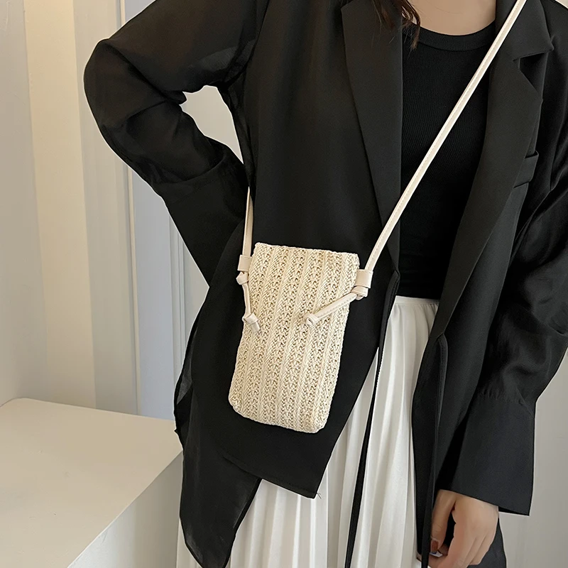 Borsa per telefono a tracolla piccola moda scavata in tinta unita da donna Borsa a tracolla intrecciata in paglia leggera intrecciata