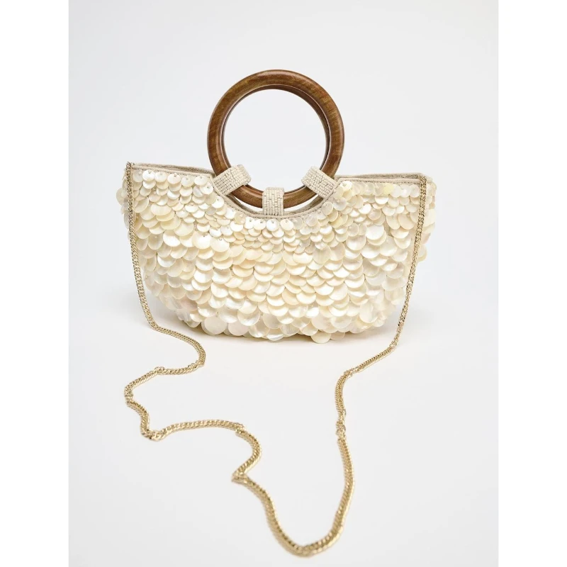 Borse con applicazioni in finto madre per donna 2025 nuove manici superiori circolari doppi a forma di mezzaluna e tracolla a catena rimovibile