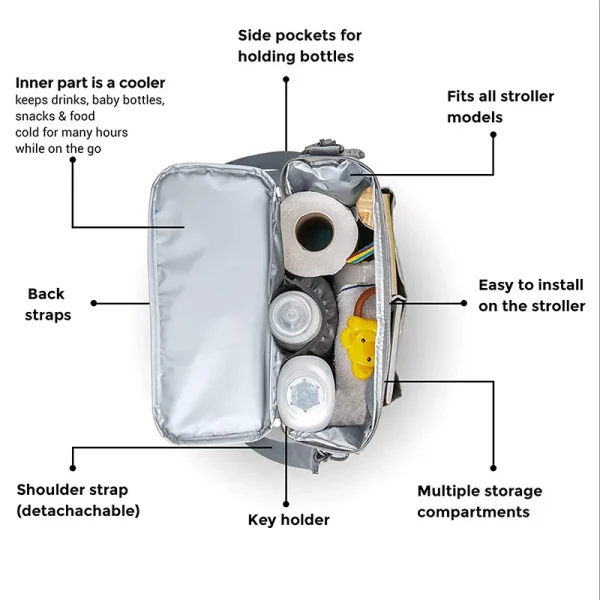 La borsa organizer offre una praticità senza pari che rende la vita quotidiana una brezza. Design universale per adattarsi alla maggior parte delle marche di passeggini Il cavalletto attacca tutti i manubri del passeggino Borsa organizer per passeggino facilmente agganciata a qualsiasi stoller, per un’esperienza senza cuciture Tasca e 5 tasche con funzioni diverse Capacità sufficiente per riporre tutto ciò di cui hai bisogno: Pannolini per bambini, cibo, vestiti, bevande, snack, libri, giocattoli, chiavi, telefono, ecc. Garantire che tutti gli articoli siano gestiti e accessibili. Cinghie posteriori Tracolla staccabile Borsa Messenger manico superiore Puoi scegliere il modo più conveniente per ogni situazione