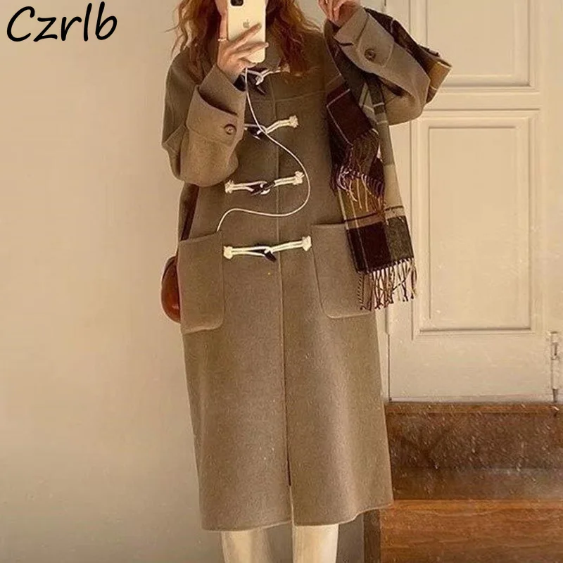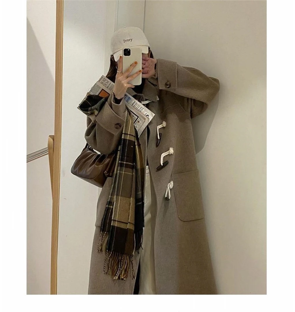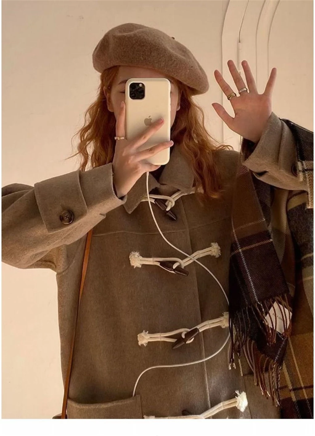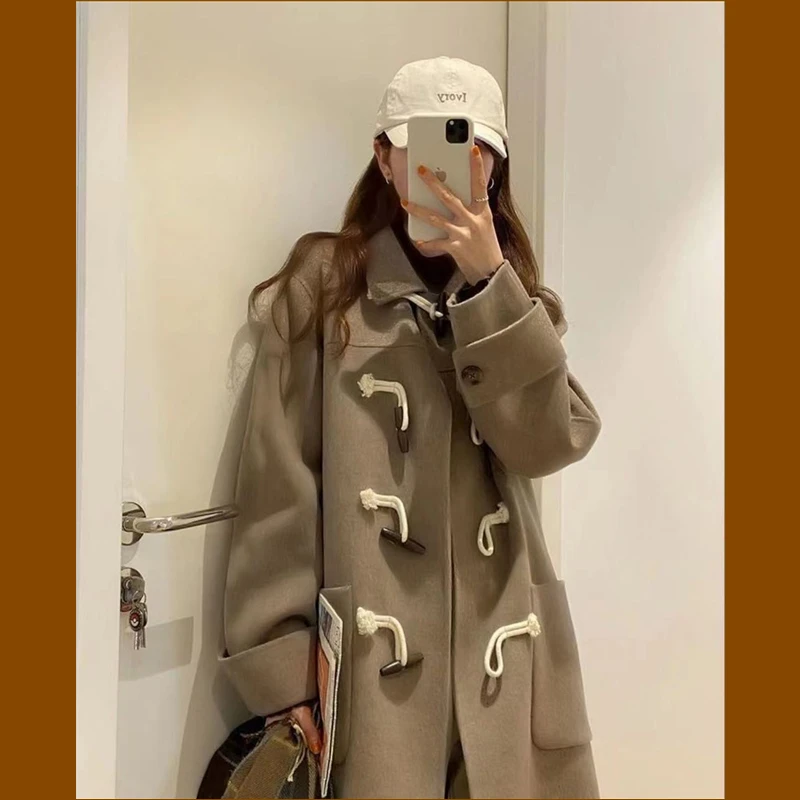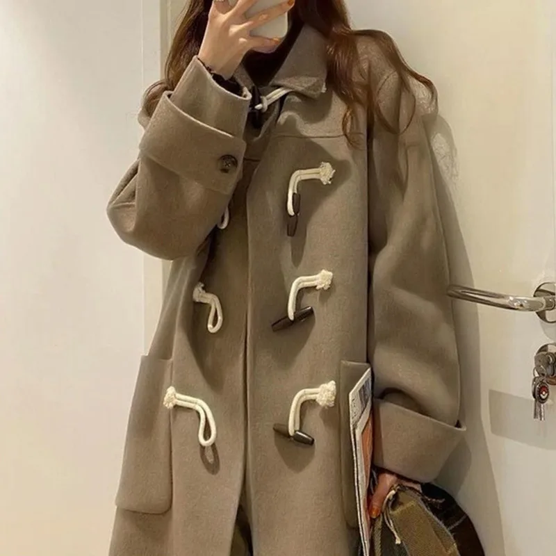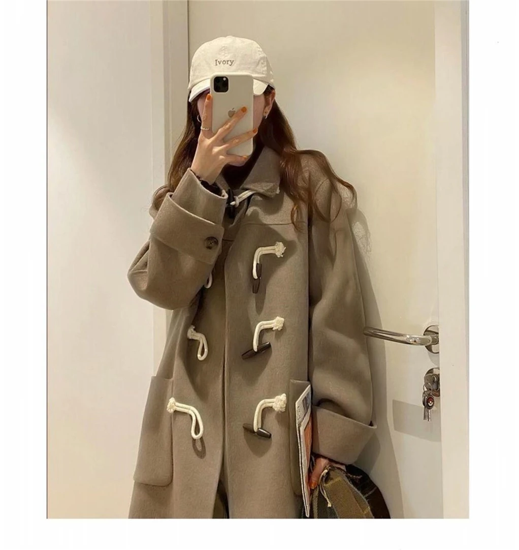 Bottone in corno Misto tweed Donna Semplice ed elegante Cappotto autunno inverno Streetwear High Street Addensare Nuovo All-match Outwear Estetico
