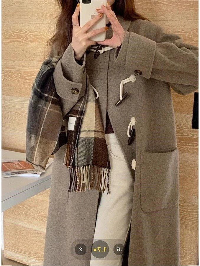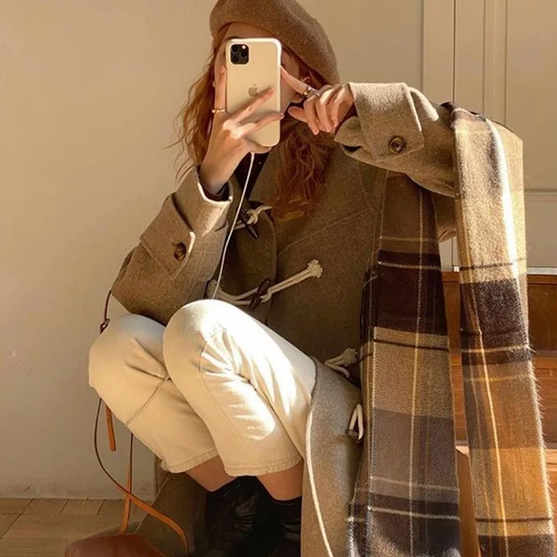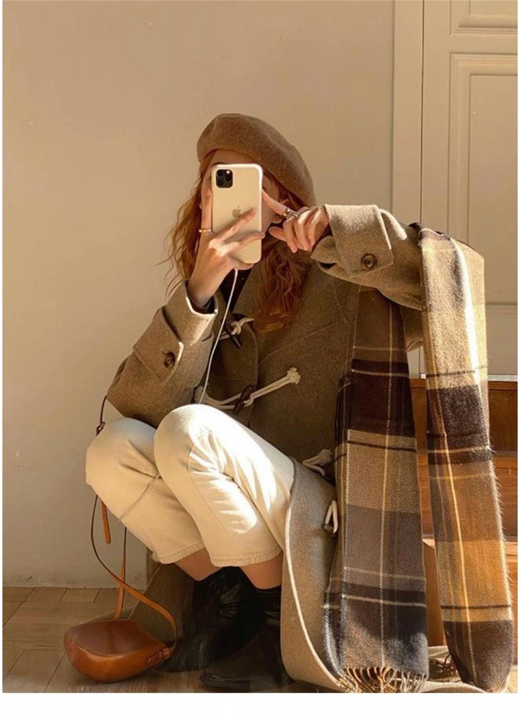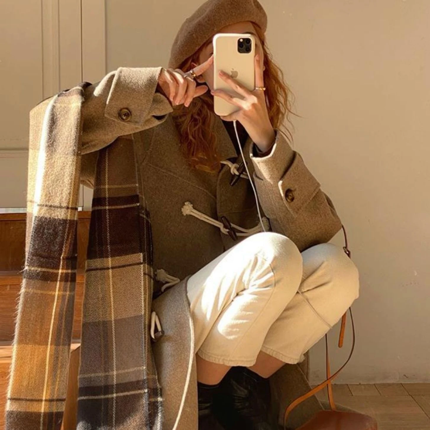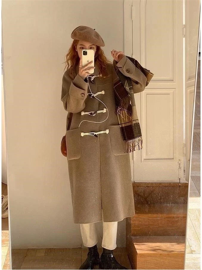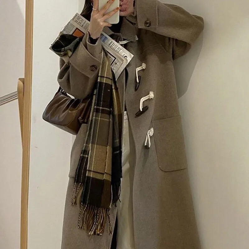 Bottone in corno Misto tweed Donna Semplice ed elegante Cappotto autunno inverno Streetwear High Street Addensare Nuovo All-match Outwear Estetico