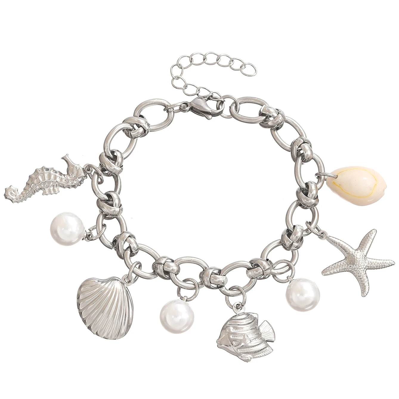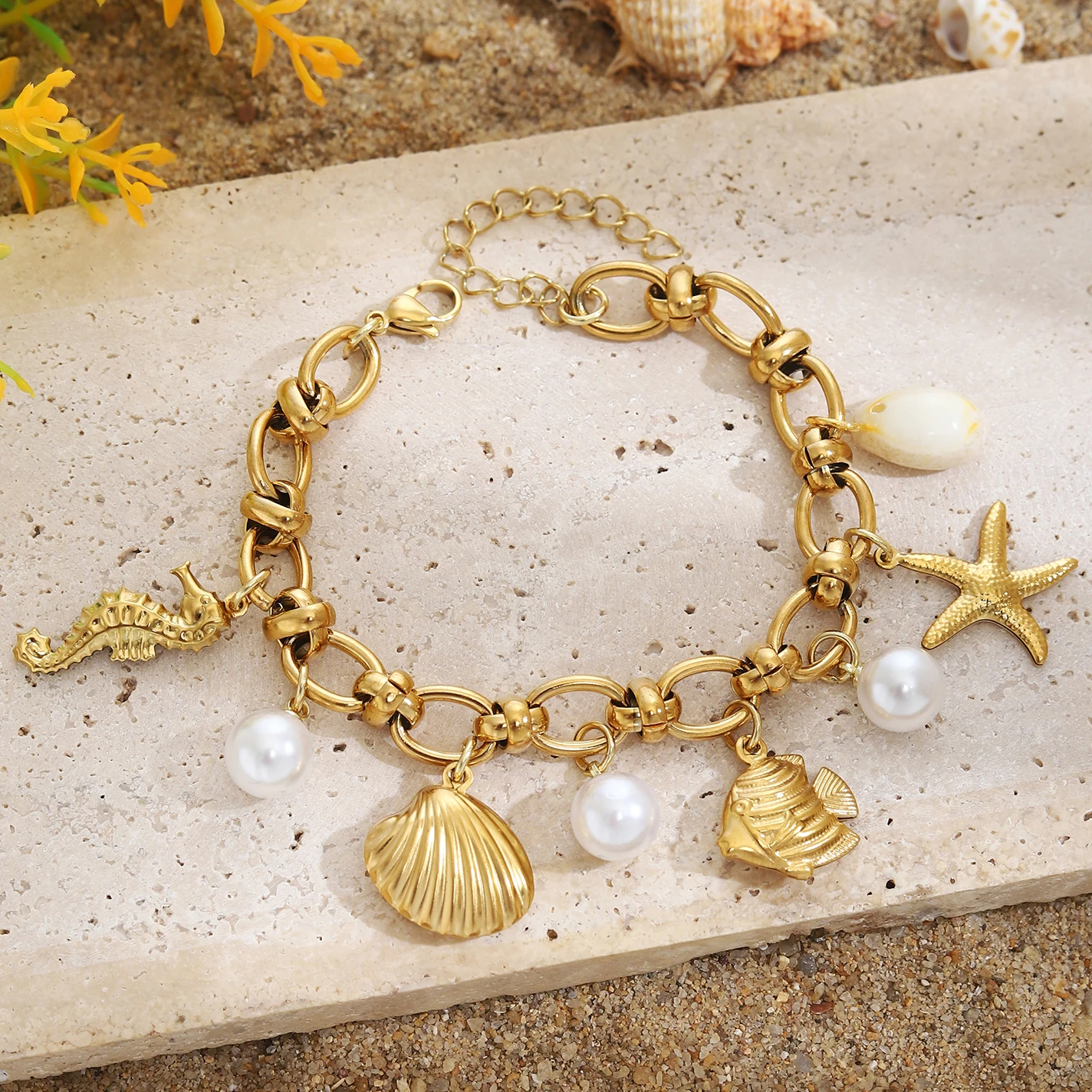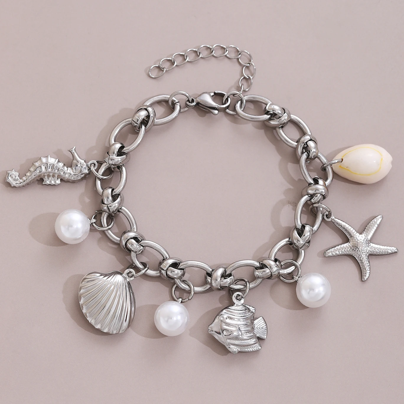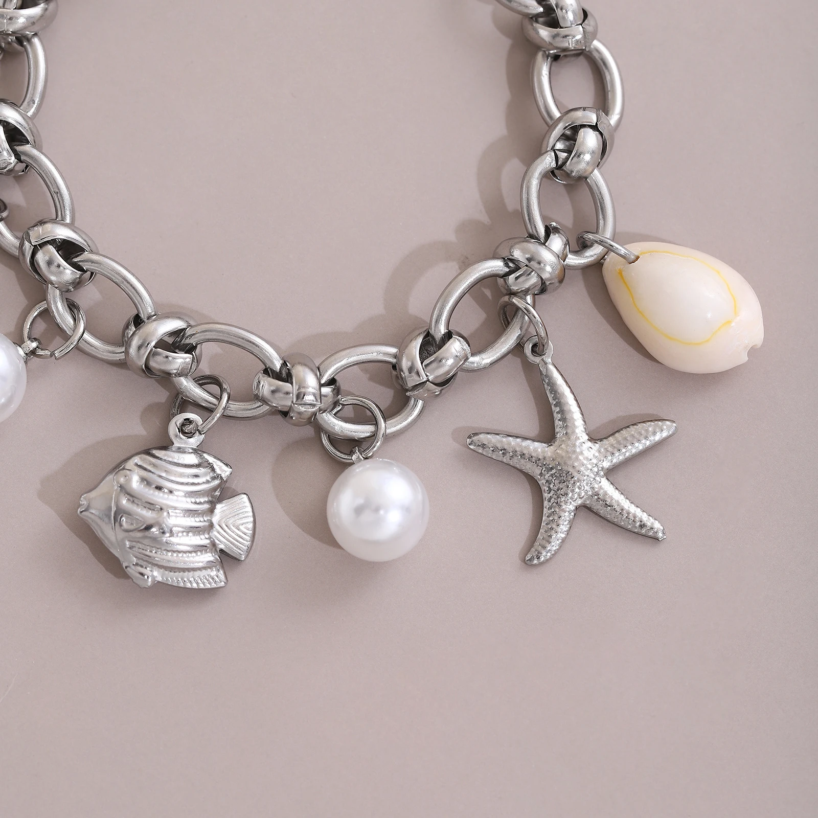 Caratteristiche intricate ciondoli marini (cavalluccio marino, stella marina, conchiglia) e perle lucenti, evocando la tranquillità dei paesaggi costieri.
