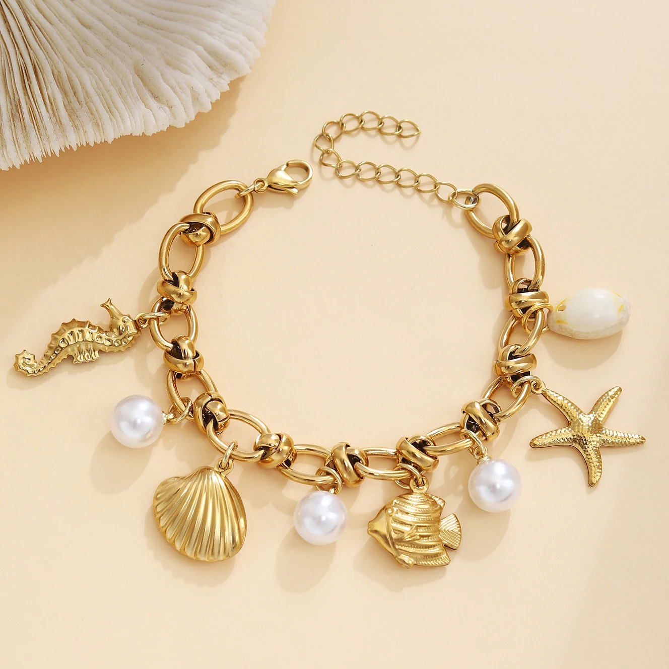 Caratteristiche intricate ciondoli marini (cavalluccio marino, stella marina, conchiglia) e perle lucenti, evocando la tranquillità dei paesaggi costieri.