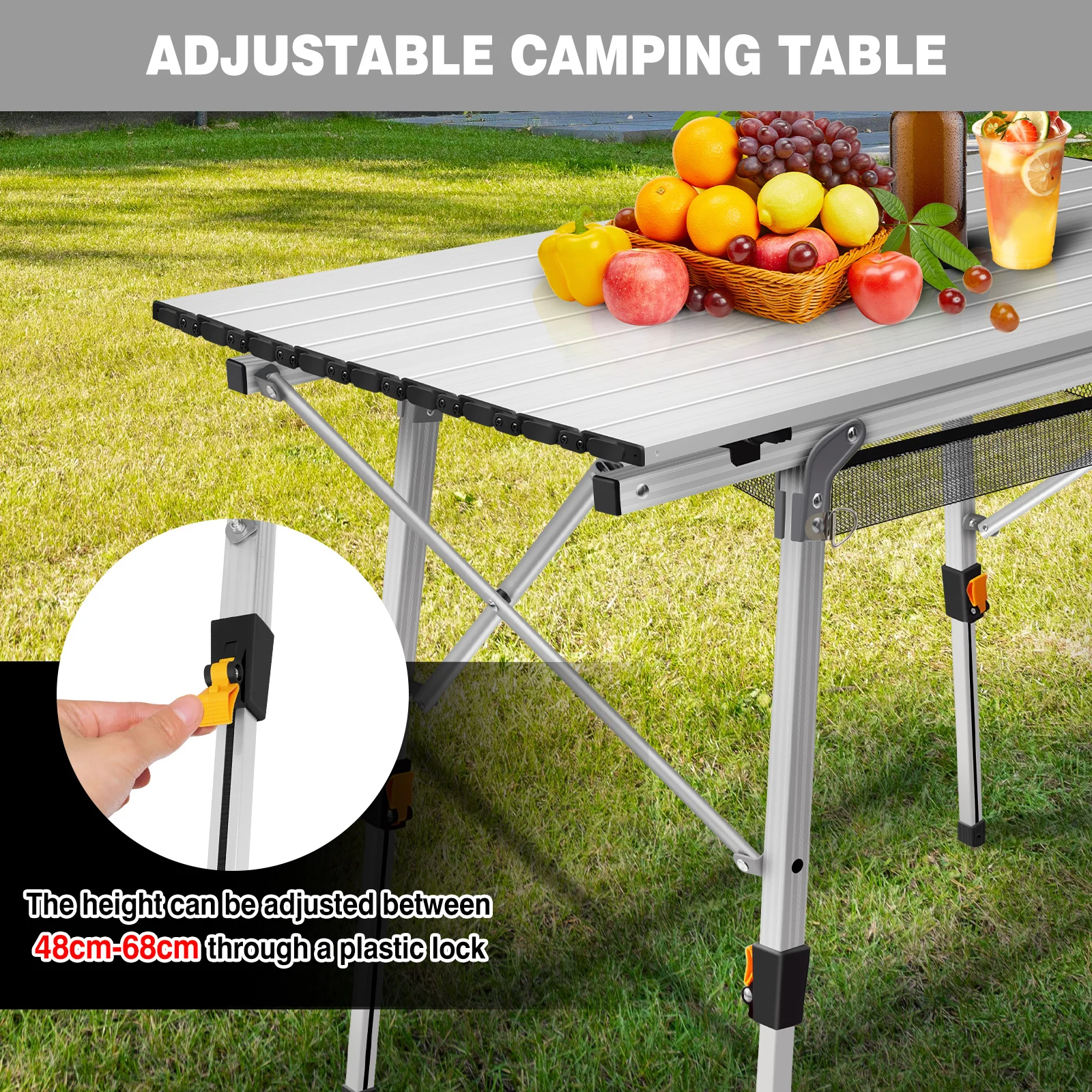 Ampia area da tavolo: il tavolo pieghevole può contenere cibo e forniture da campeggio.La superficie è liscia e facile da pulire.Basta pulire gentilmente con un tessuto bagnato.