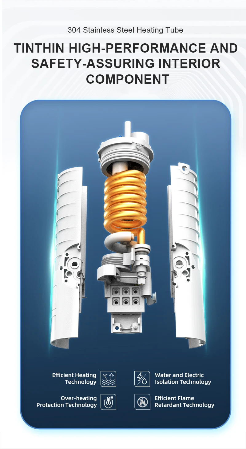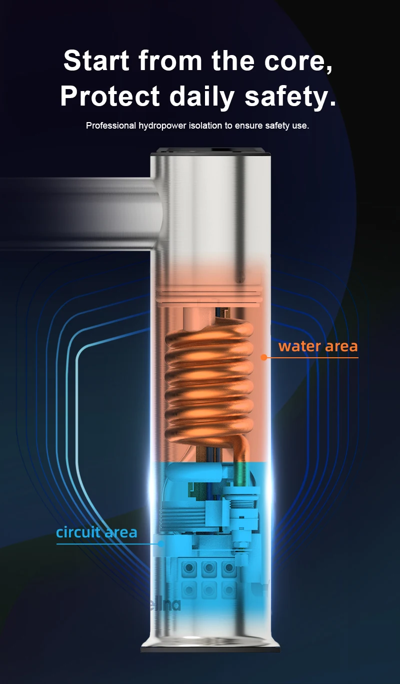 Varie protezioni: protezione dalle perdite, impermeabile IPX4, protezione del riscaldamento a secco, isolamento dell’elettricità dell’acqua, spegnimento automatico ad stato inactivo, spegnimento automatico su temperatura.