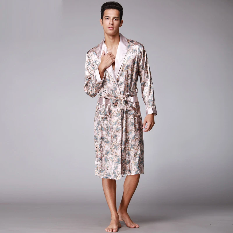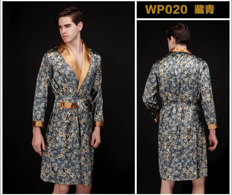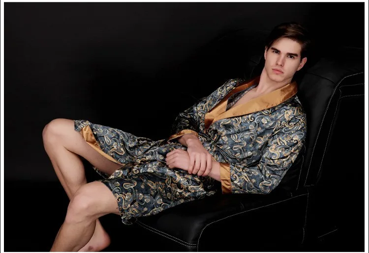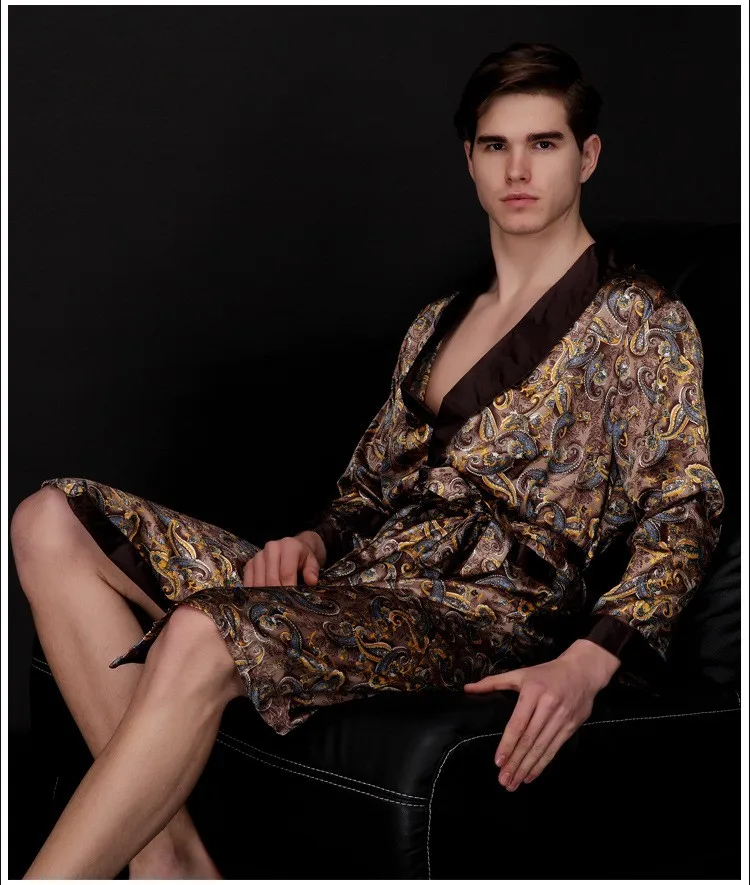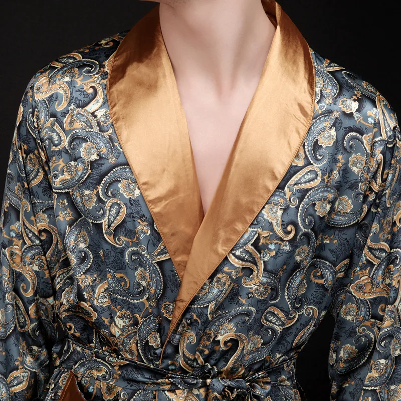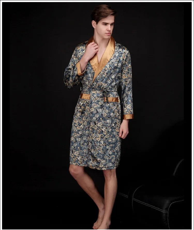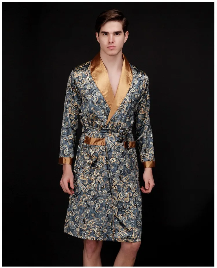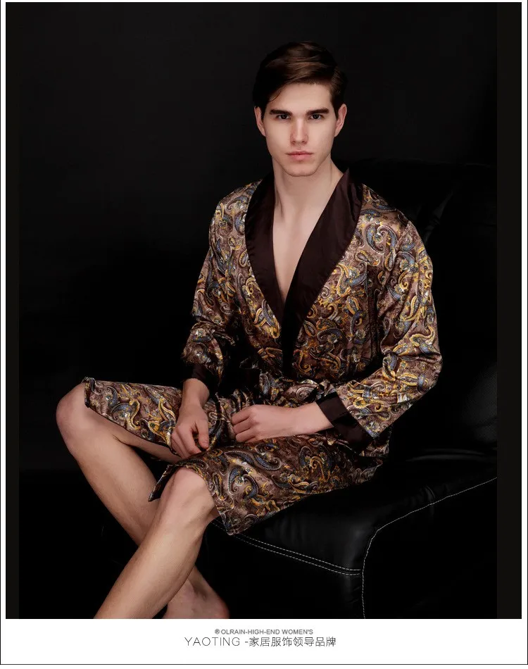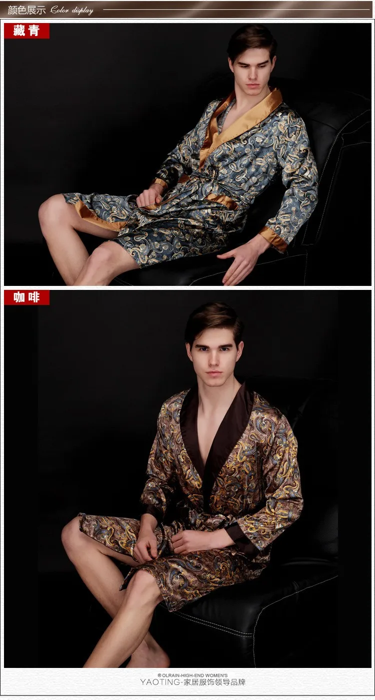 Caffè e blu navy uomo abiti di seta 2016 maschio senior raso indumenti da notte estate lungo modello paisley vestaglia set maniche lunghe camicia da notte
