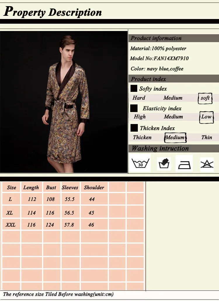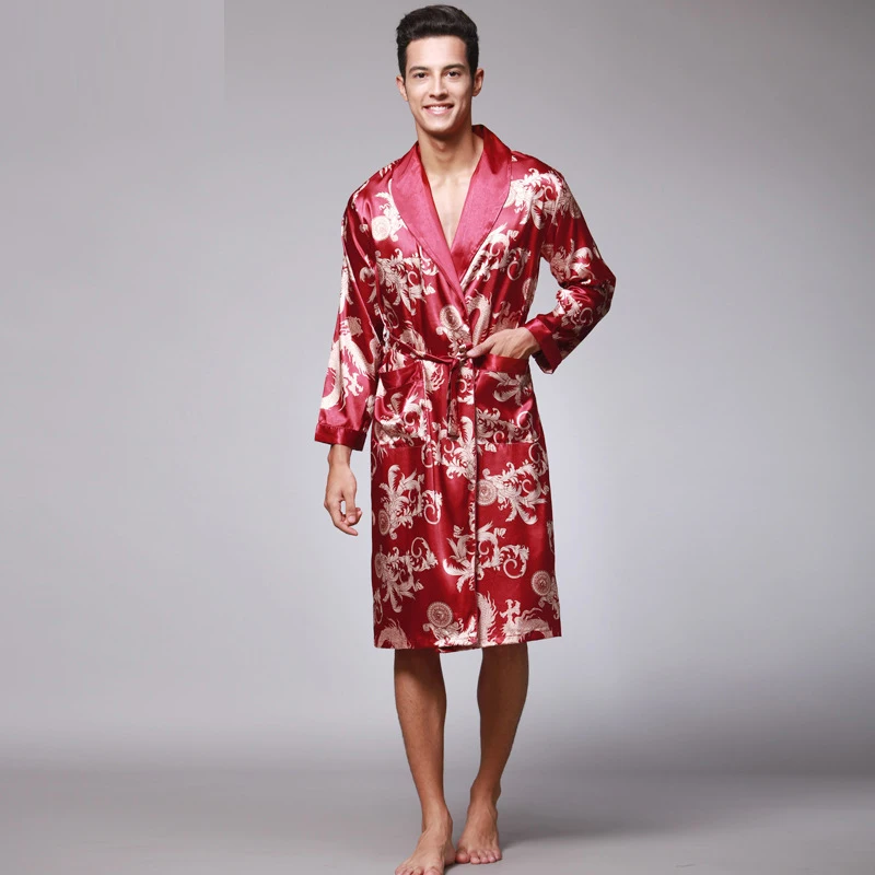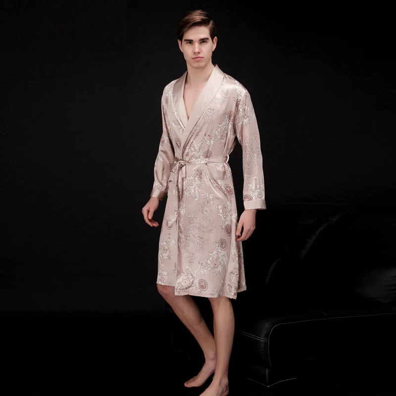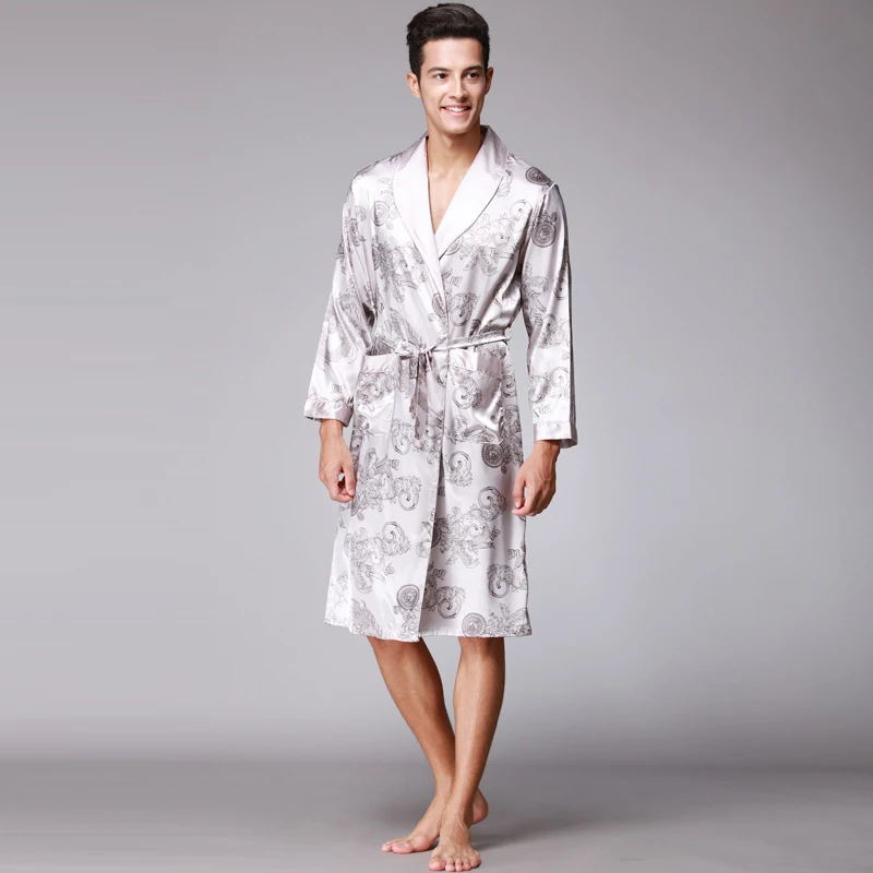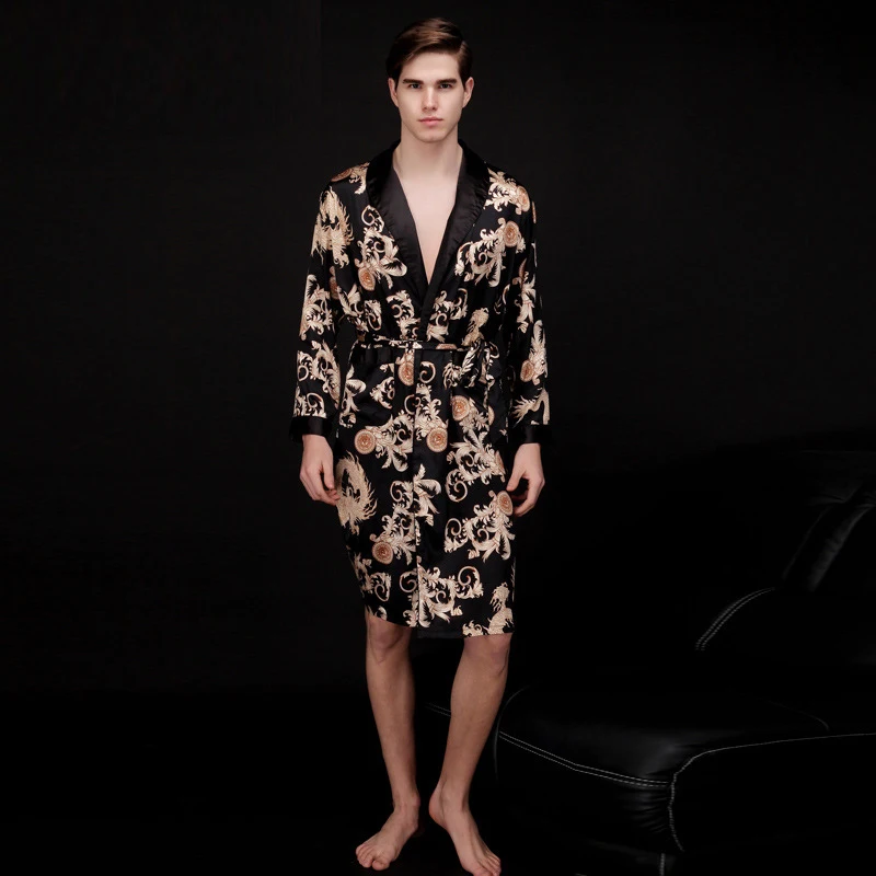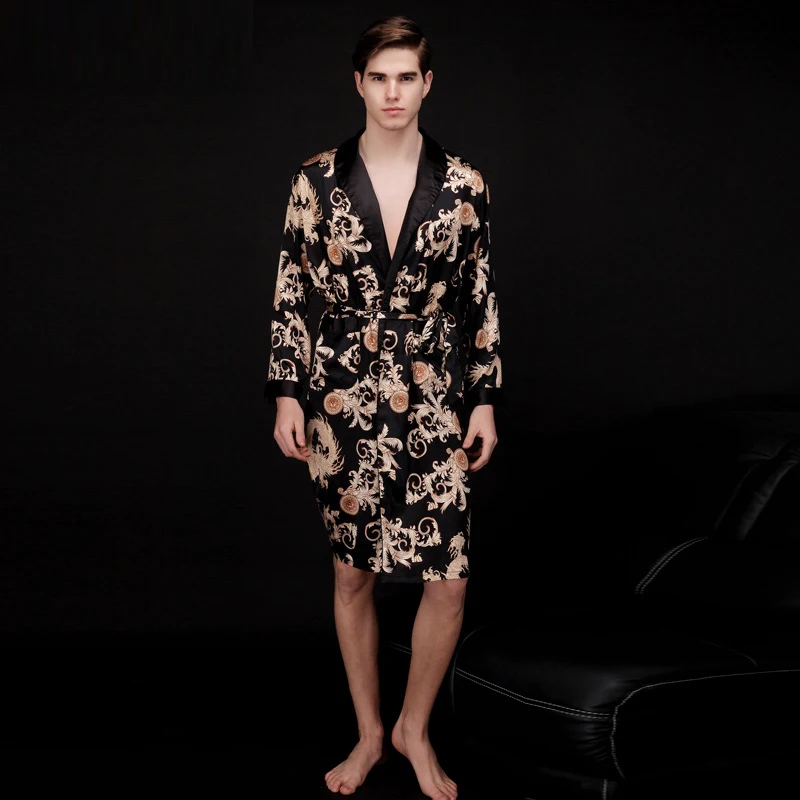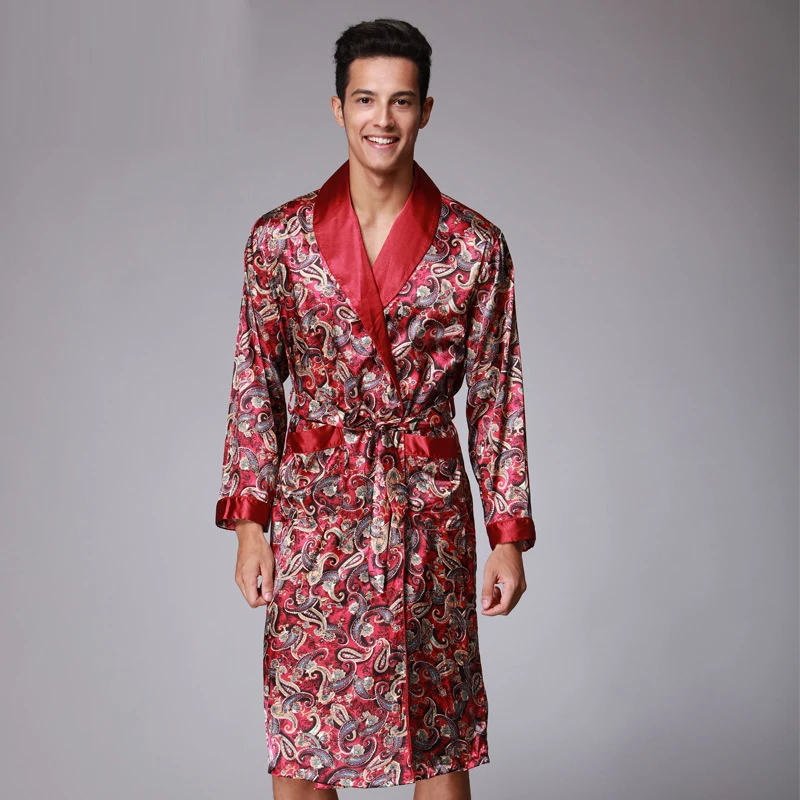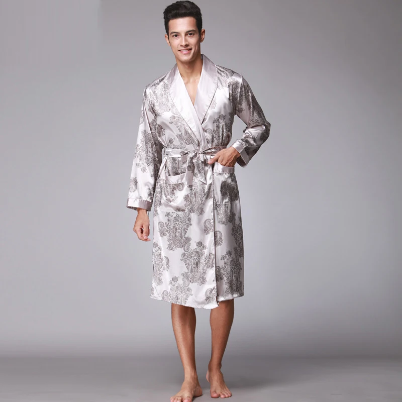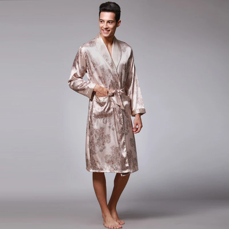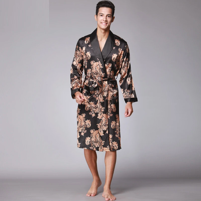 Caffè e blu navy uomo abiti di seta 2016 maschio senior raso indumenti da notte estate lungo modello paisley vestaglia set maniche lunghe camicia da notte