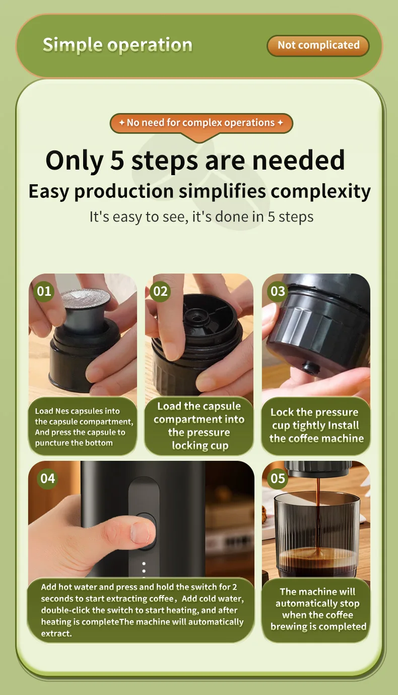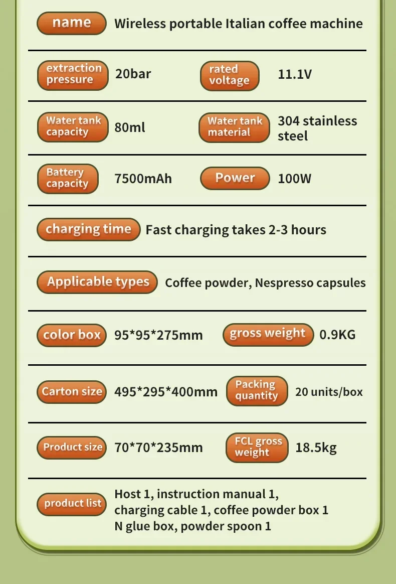 Che tu sia un professionista impegnato, un avventuriero all’aria aperta o un corpo a casa che apprezza la qualità, questa macchina combina estetica, potenza e portabilità è il partner perfetto per il tuo rituale quotidiano del caffè.