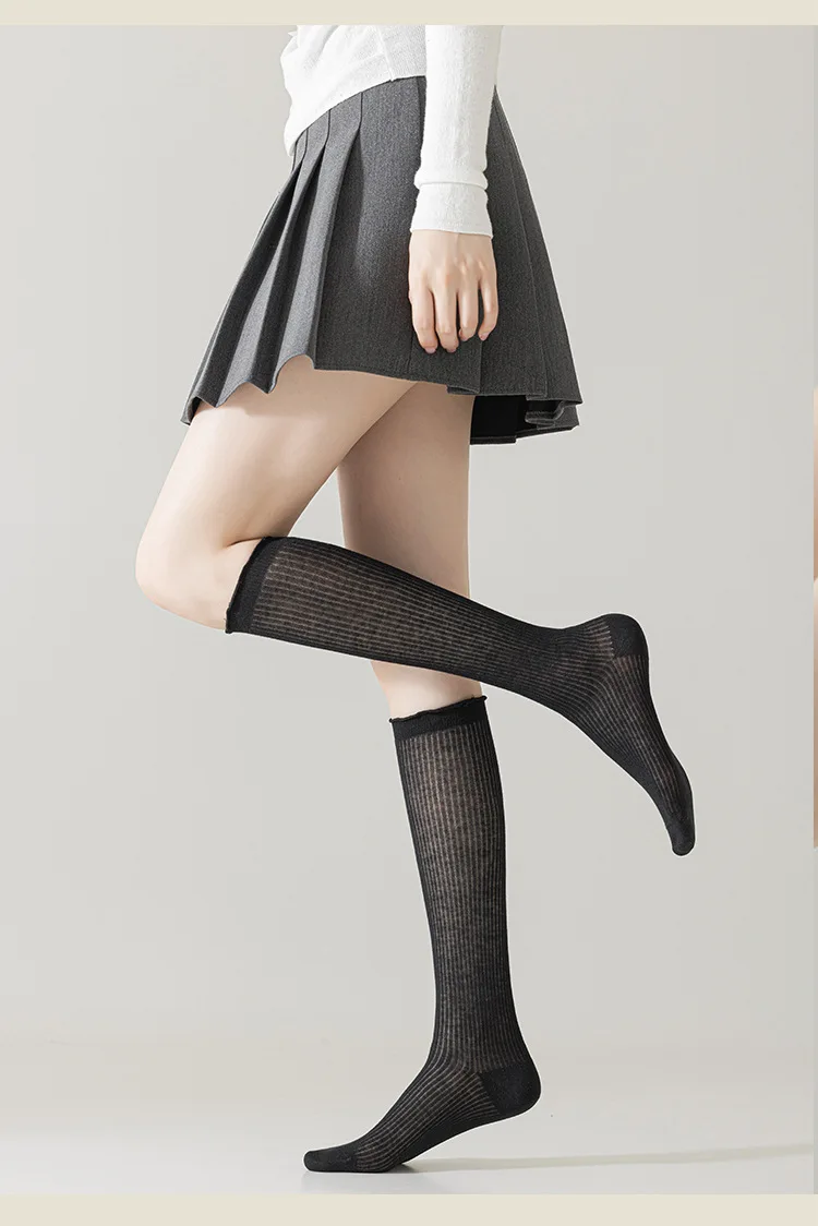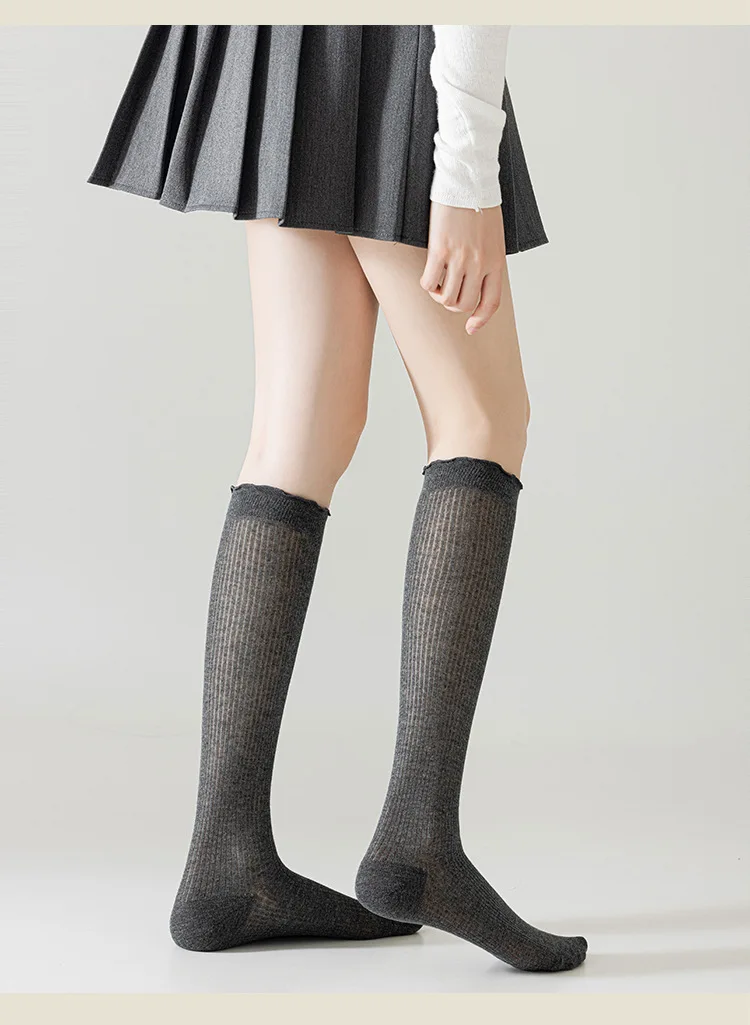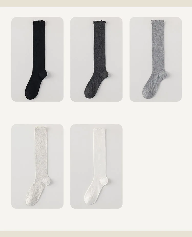 Calze da donna Calzini Primavera Estate Donna Cotone Tinta unita Bordo lattuga Roll-edge Sottile Calzino lungo casual al ginocchio