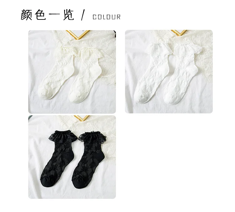 Calzini da donna Stile Lolita Calzini con volant bianchi neri Maglia sottile in pizzo Ragazze dolci Moda giapponese Lolita Calzini carini Calcetin Medias