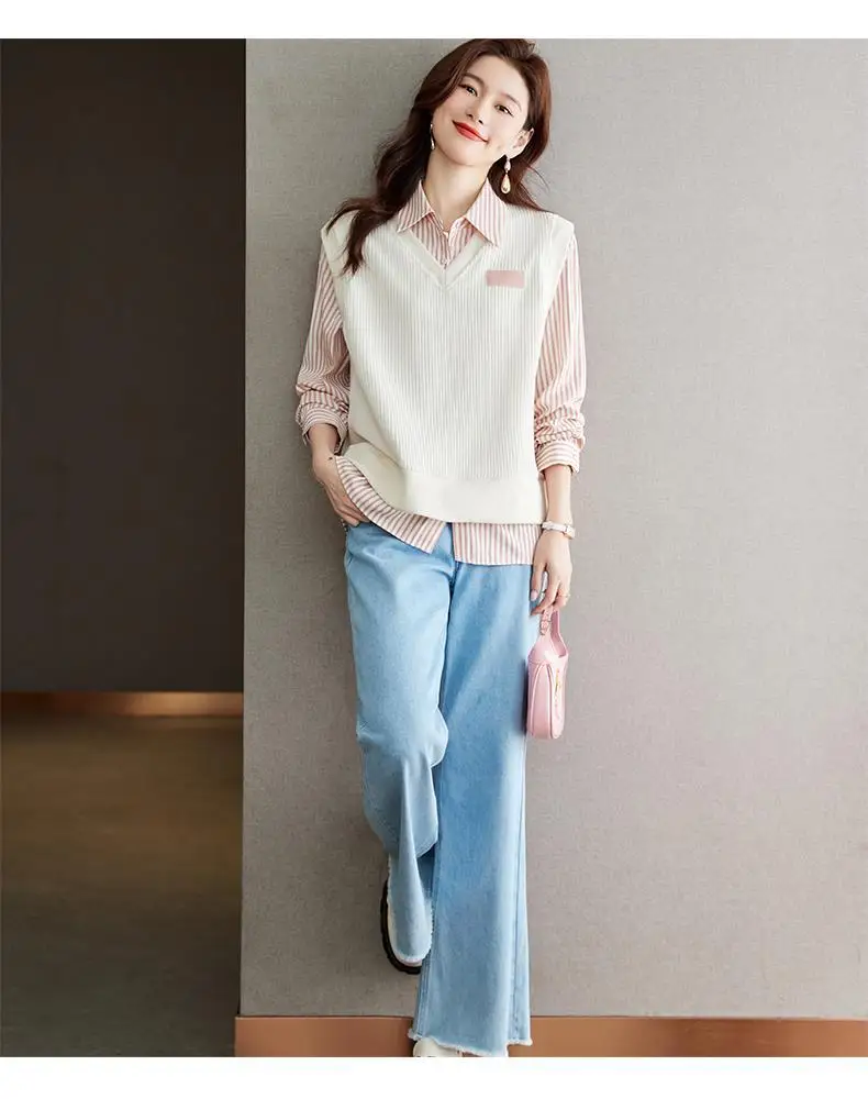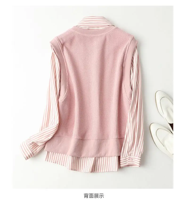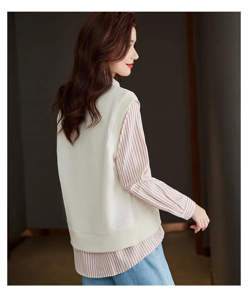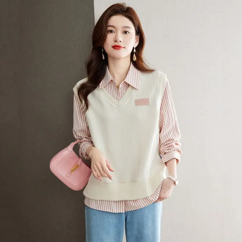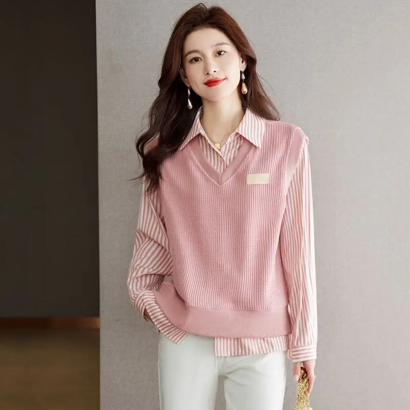 Camicetta casual patchwork a due righe finte a contrasto Primavera Autunno Nuova manica lunga ampia ed elegante top da ufficio abbigliamento donna coreana