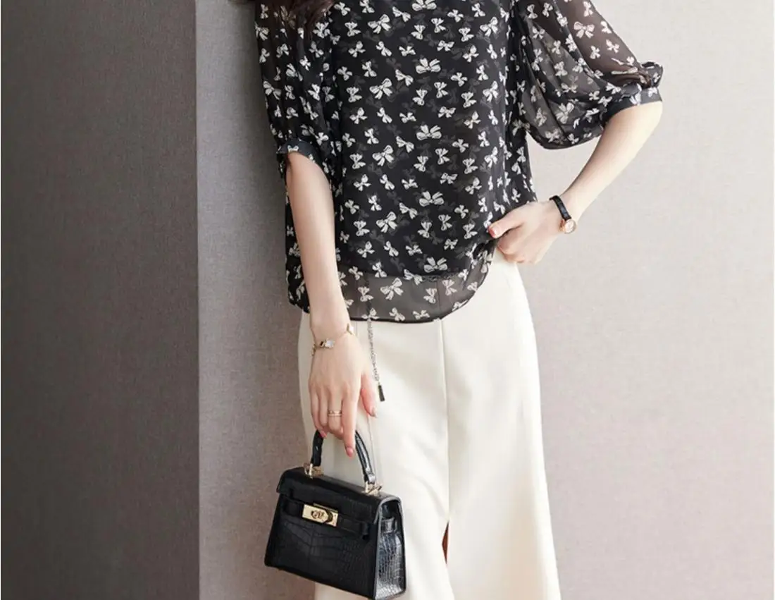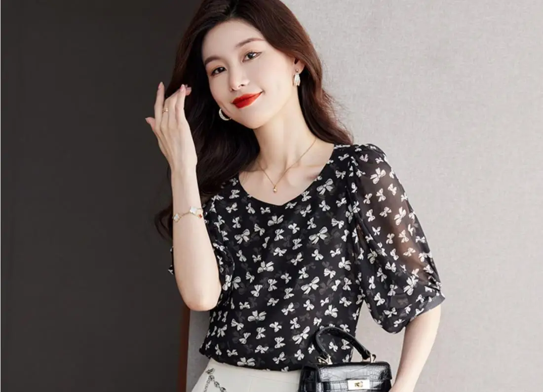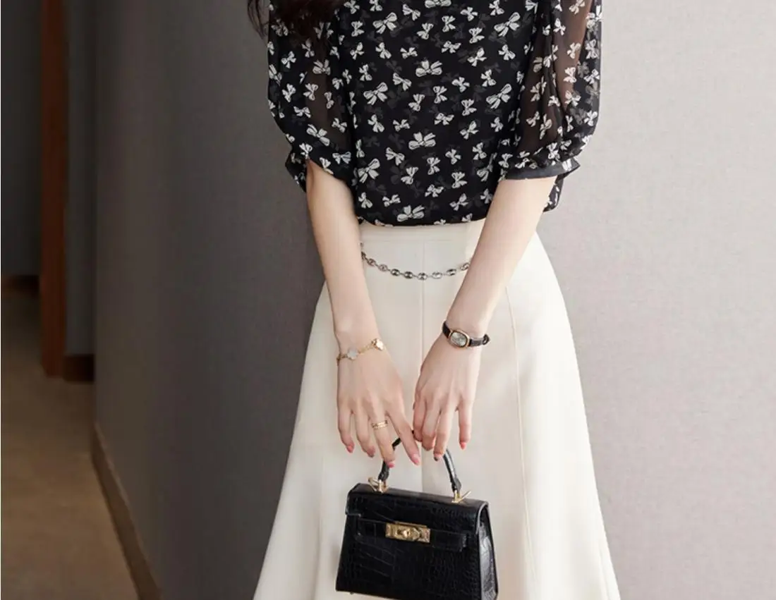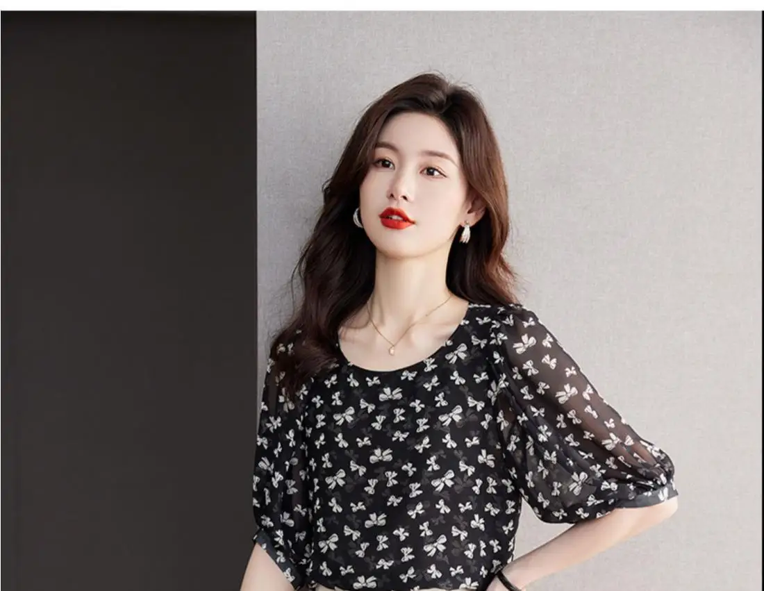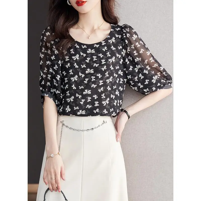 Camicetta di chiffon pullover girocollo semplice estivo Camicetta di chiffon alla moda da donna Stile leggero e maturità Elegante design con fiocco Top sottile