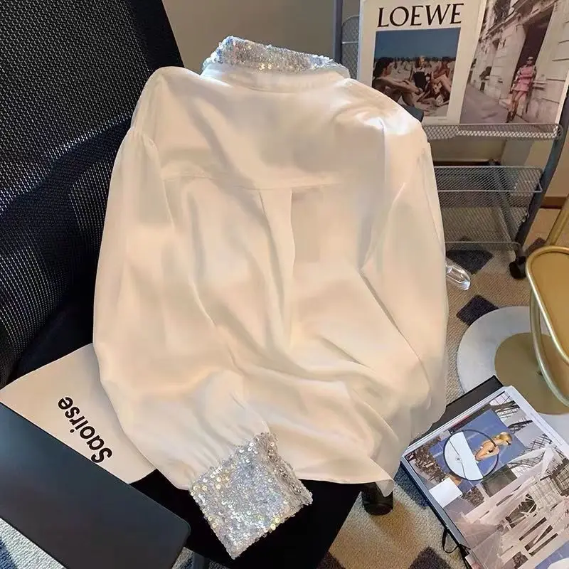 Camicette a maniche lunghe con colletto rovesciato moda primavera autunno Abbigliamento da donna Camicie all-match con bottoni in paillettes stile francese 1Camicette a maniche lunghe con colletto rovesciato moda primavera autunno Abbigliamento da donna Camicie all-match con bottoni in paillettes stile francese