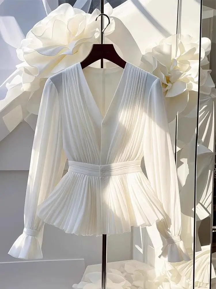 Camicia abbottonata bianca a maniche lunghe pieghettata elegante da donna con scollo a V e tunica con volant Camicetta basic in chiffon Lady Office Casual
