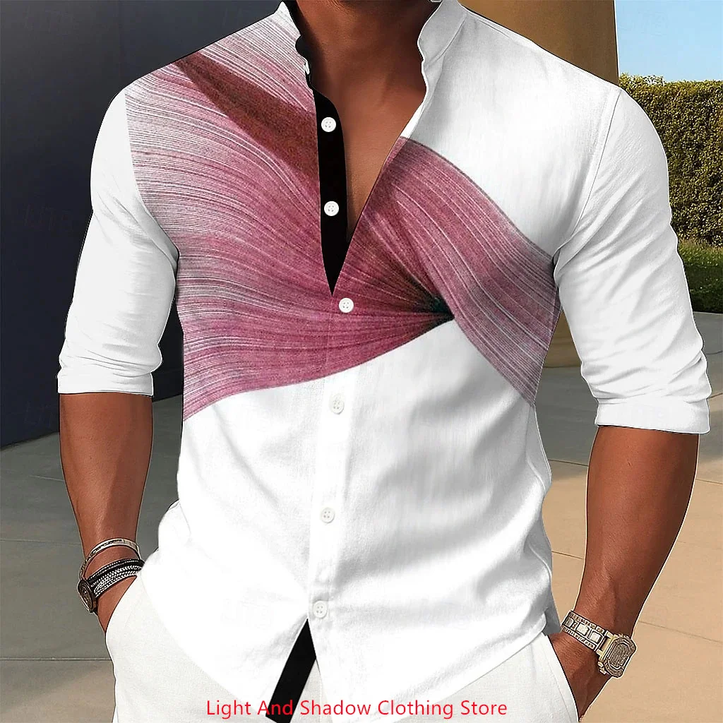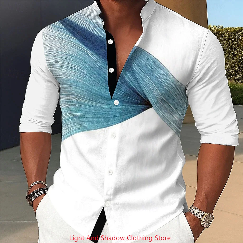 Camicia da uomo con colletto rialzato, camicia stampata geometrica, camicia monopetto, abbigliamento da uomo a maniche lunghe alla moda di strada
