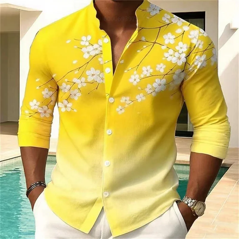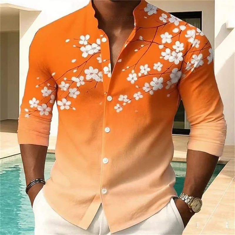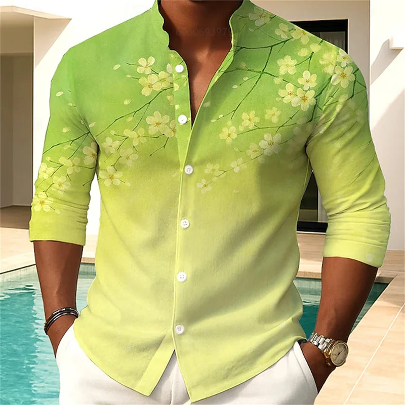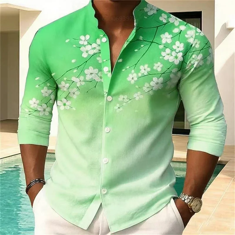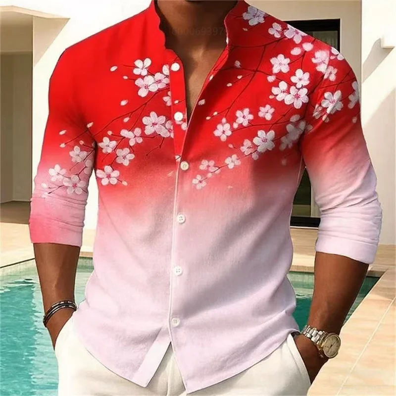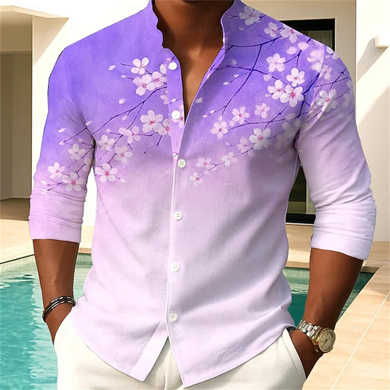 Camicia da uomo con stampa floreale moda casual vacanza all’aria aperta quotidiana primavera e autunno camicia con colletto alla coreana in stile cinese rosa blu