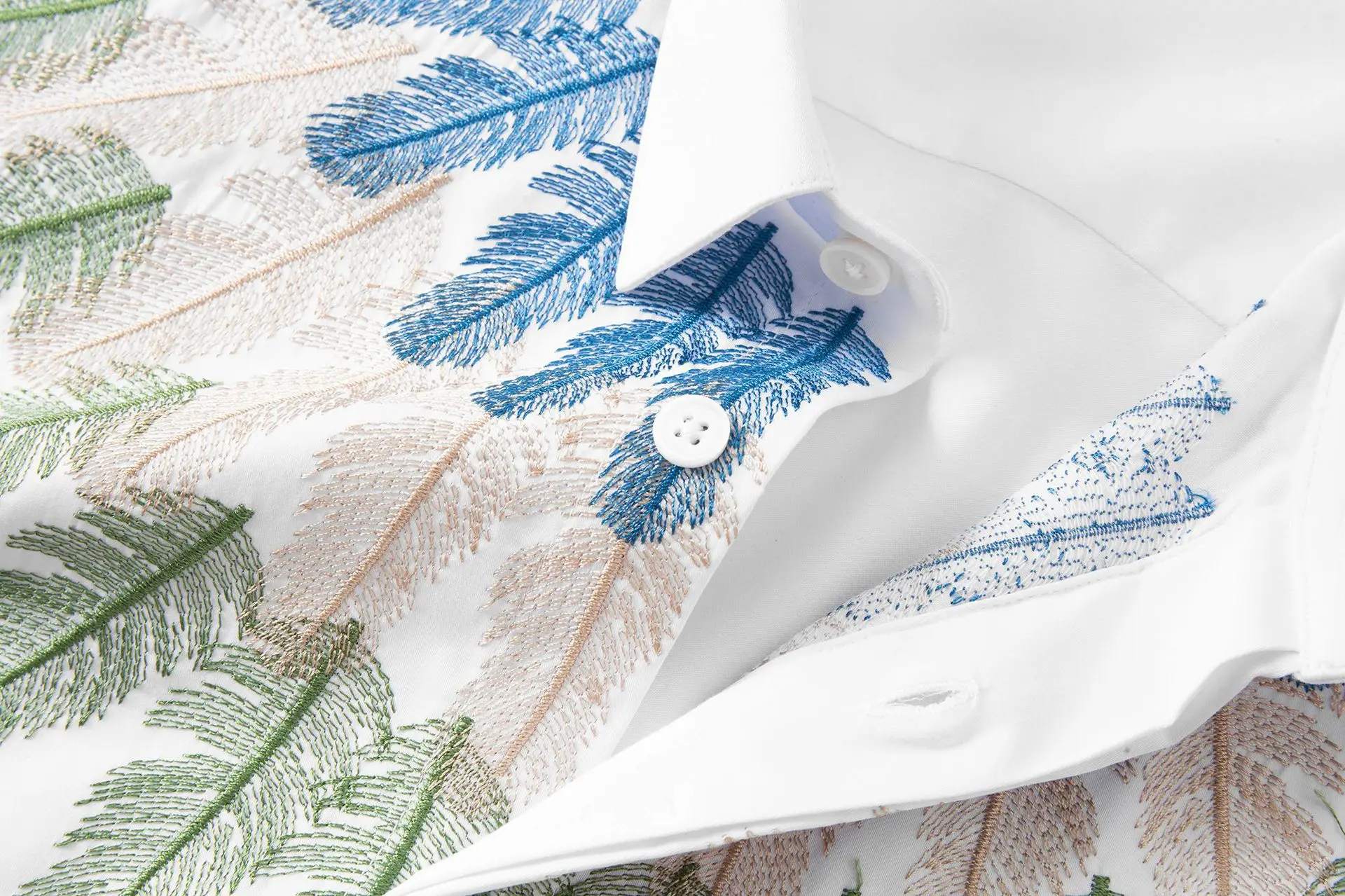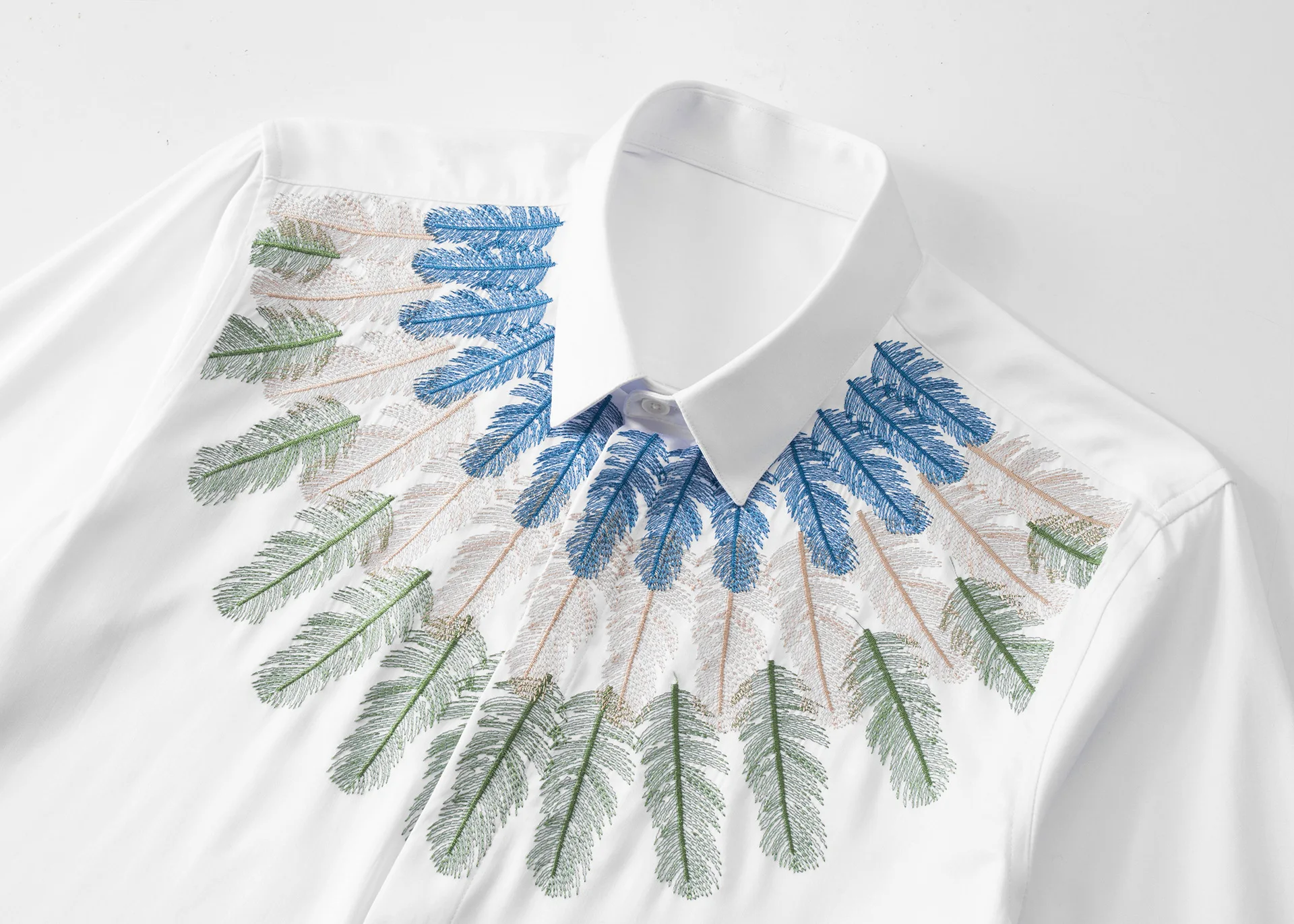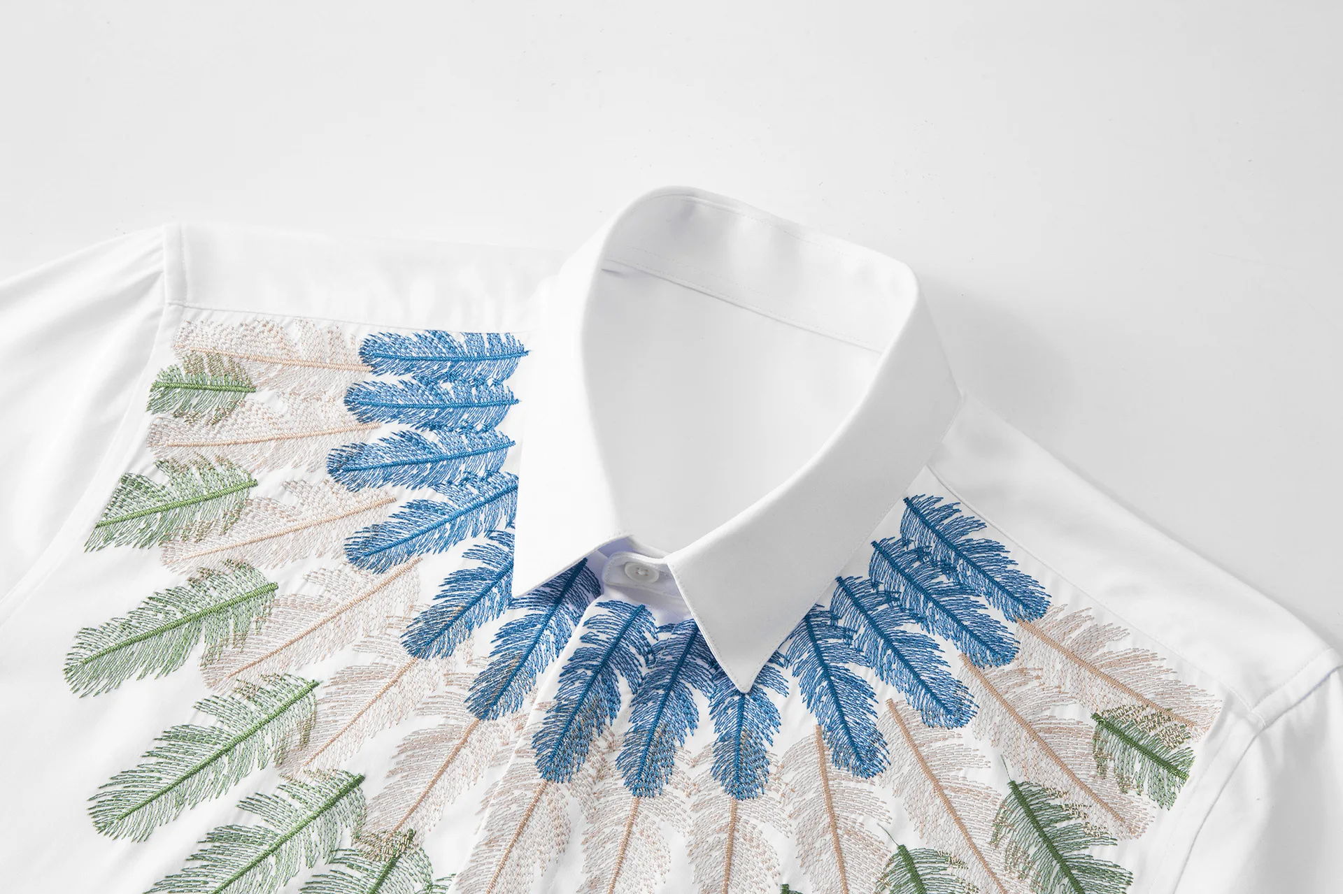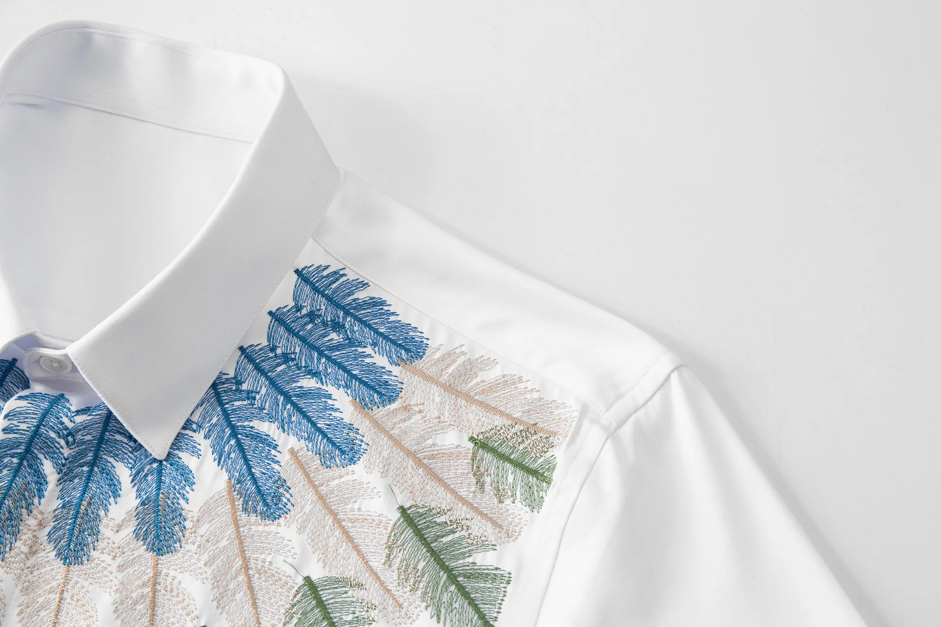 Camicia da uomo ricamata con piume a maniche lunghe autunno inverno Moda casual Camicia per performance sul palco sociale Streetwear Abbigliamento uomo