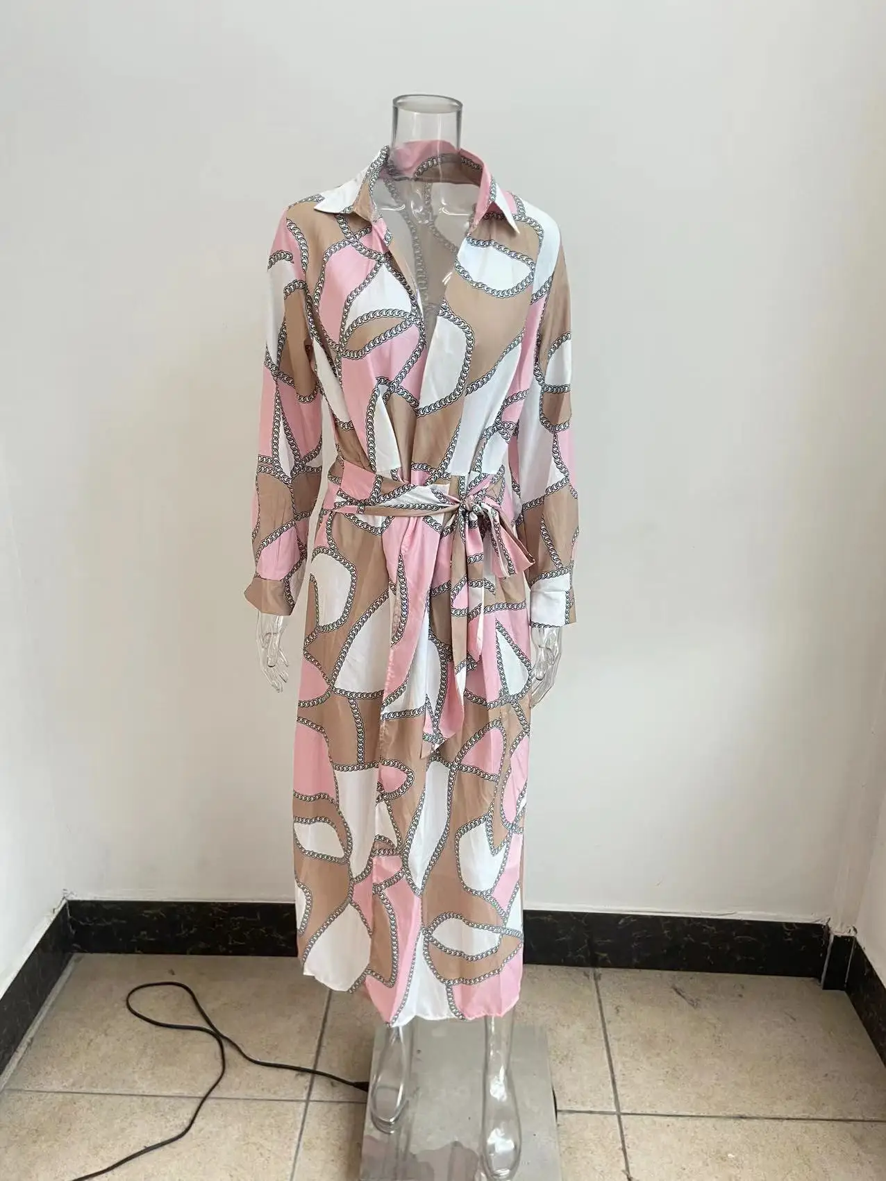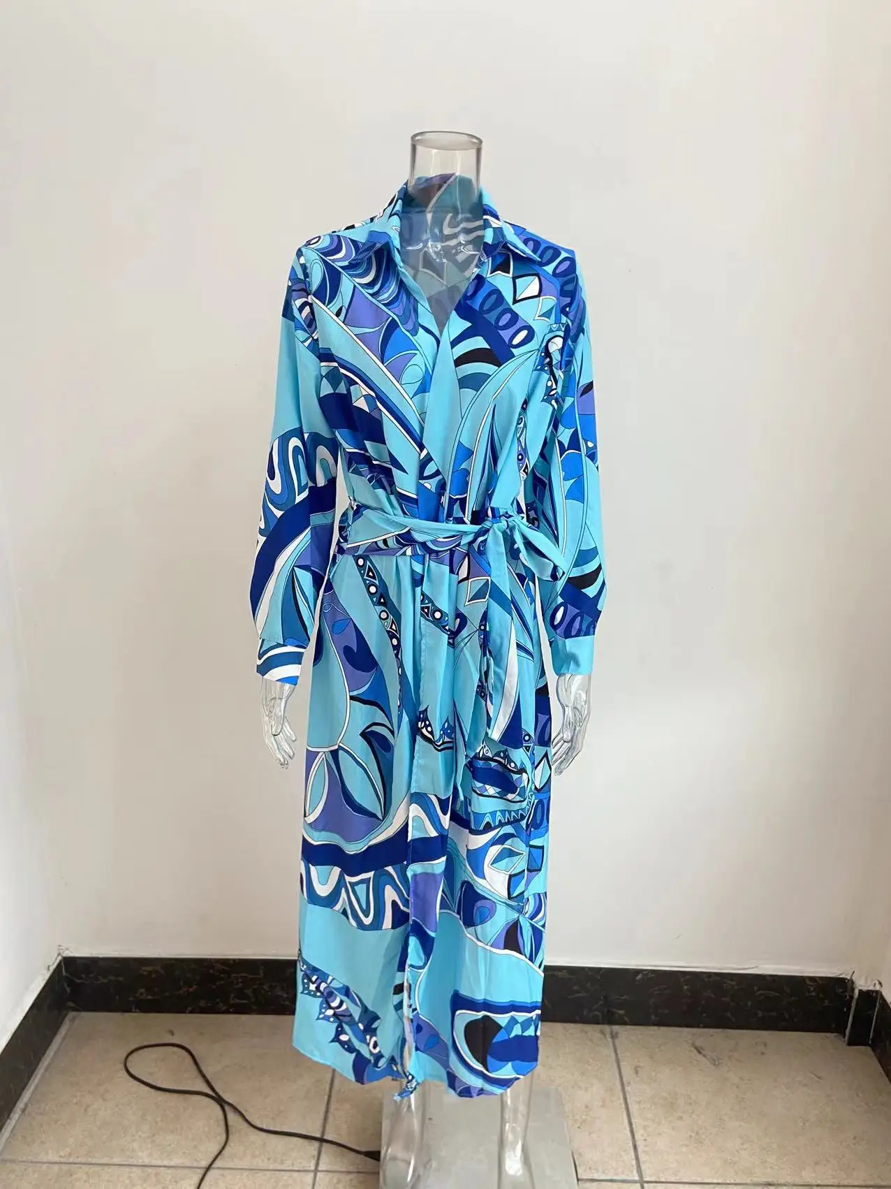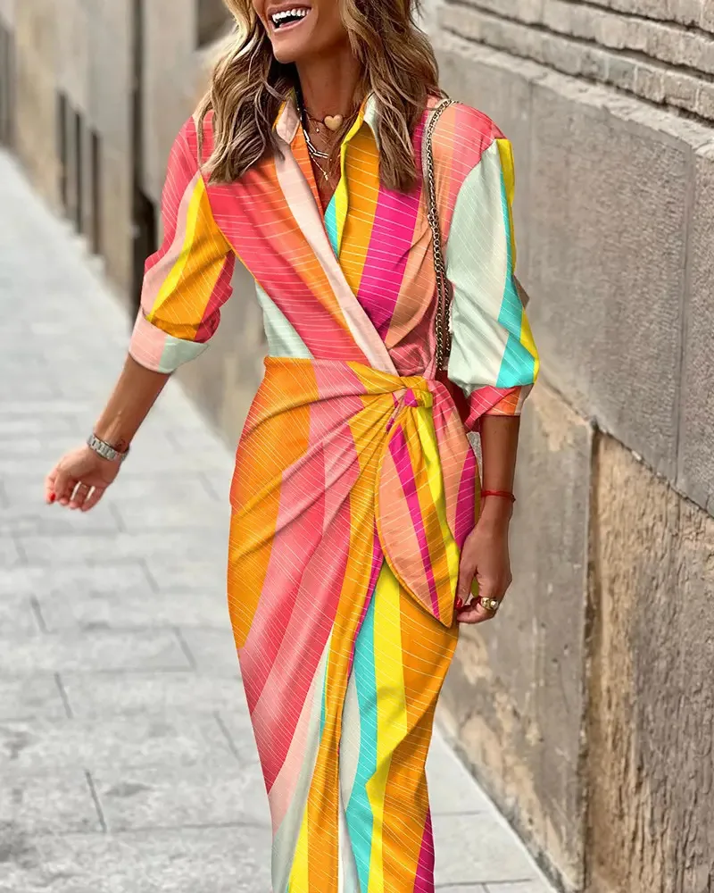 Camicia stampata alla moda da donna primavera estate nuovo prodotto con colletto cinturino in vita abito casual a righe medio-lunghe