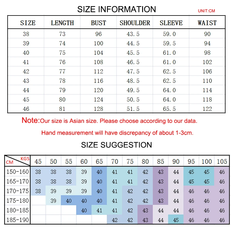 2) Our size is Asian size , all measures Exist 1-2cm error !Normally, the shirt size should be bigger than your body size. you can check your usual shirt. if your body chest is 100cm, we suggest you choose shirt with 104cm or 108cm.