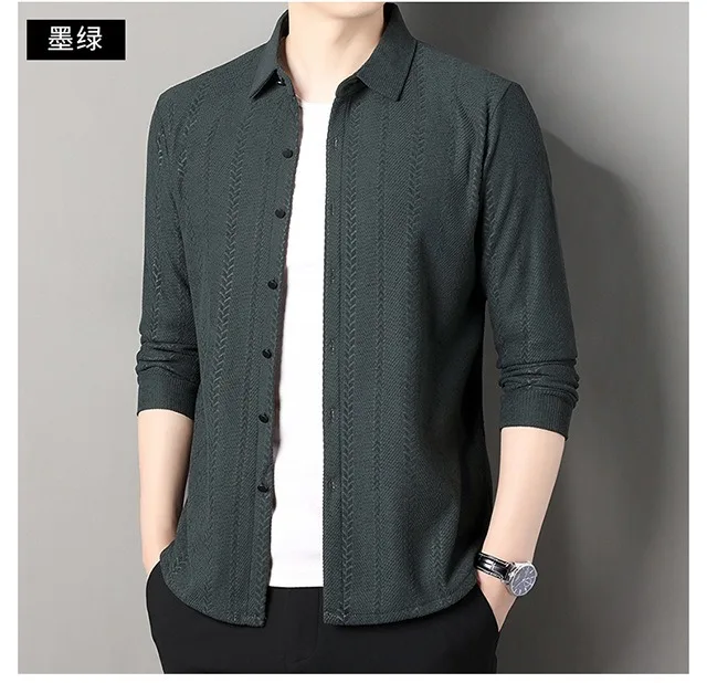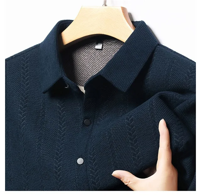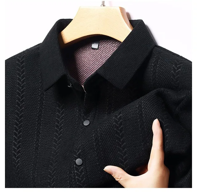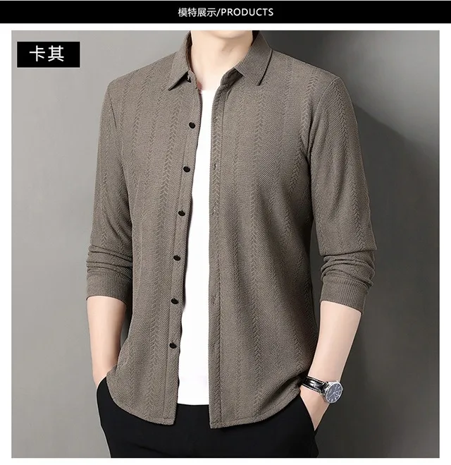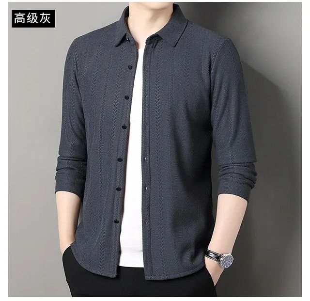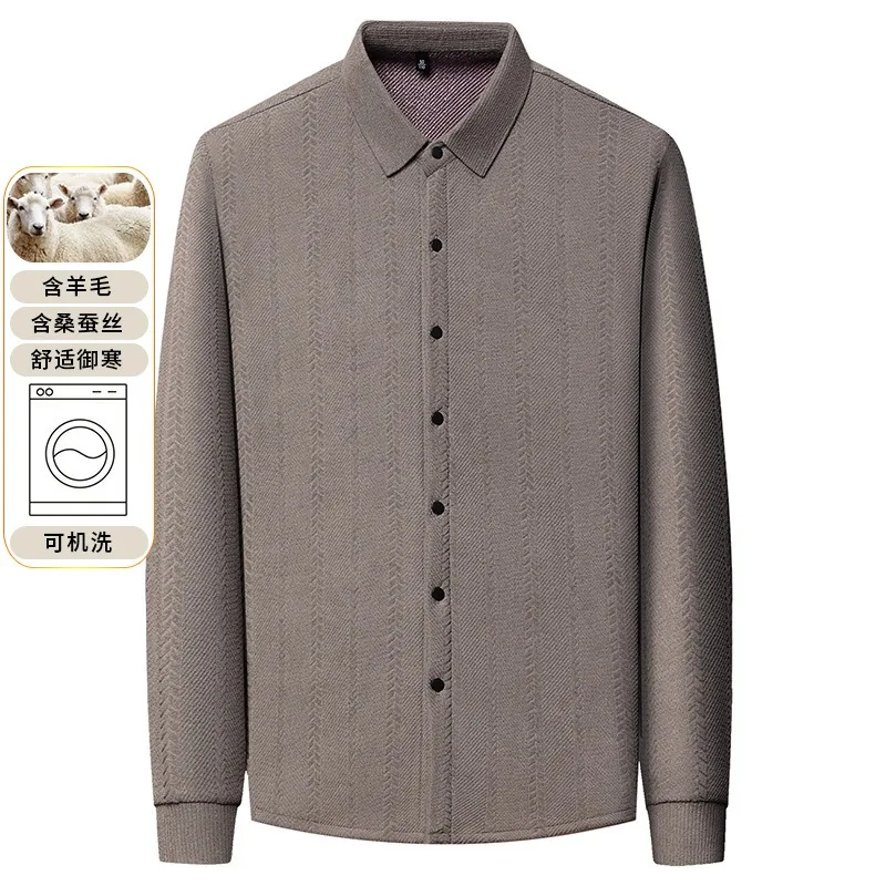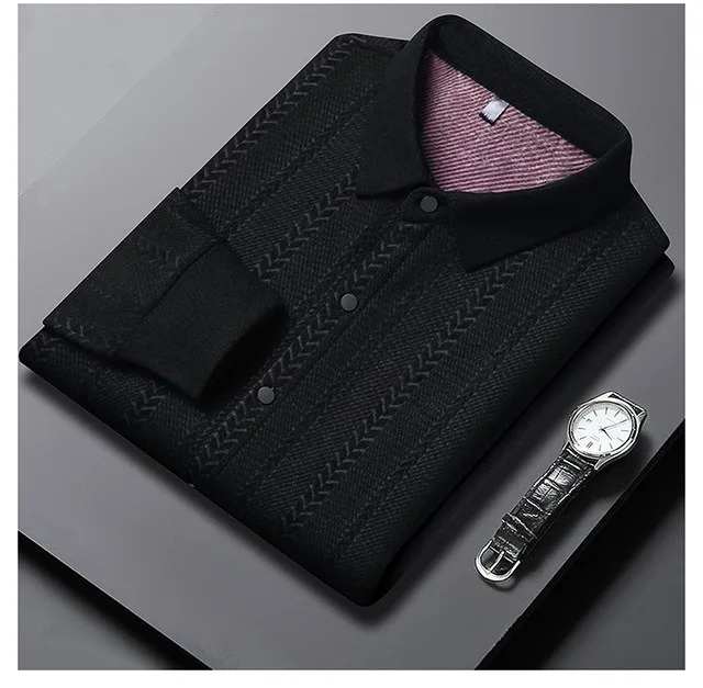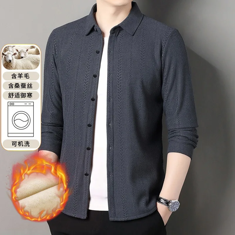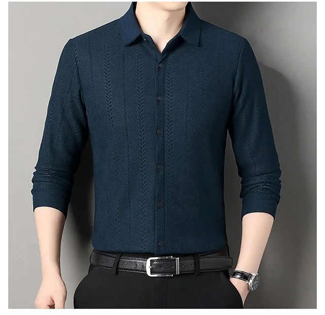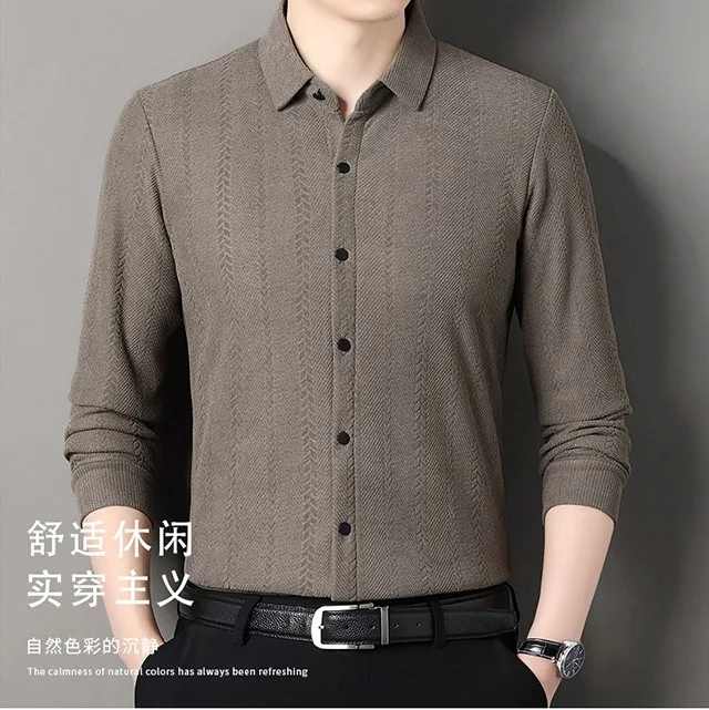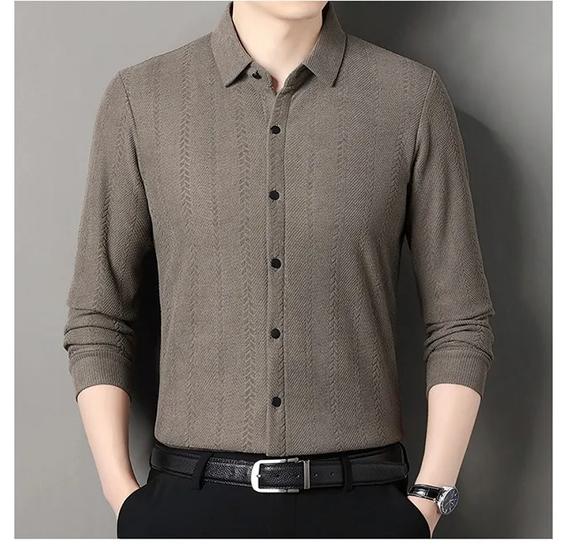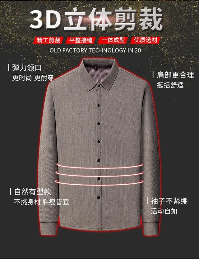 Men’s Wool Winter Dress Shirts Casual Long Sleeve Fleece Tee & Tops Non Iron Elastic Business Skin Friendly Luxurious Silk Shirt