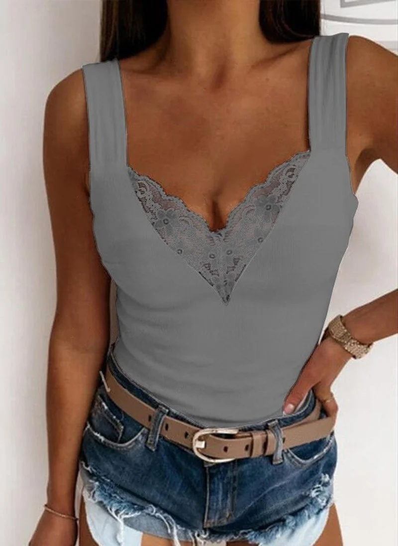 Camicie sexy senza maniche in pizzo tinta unita casual con scollo a V moda estiva da donna Top slim