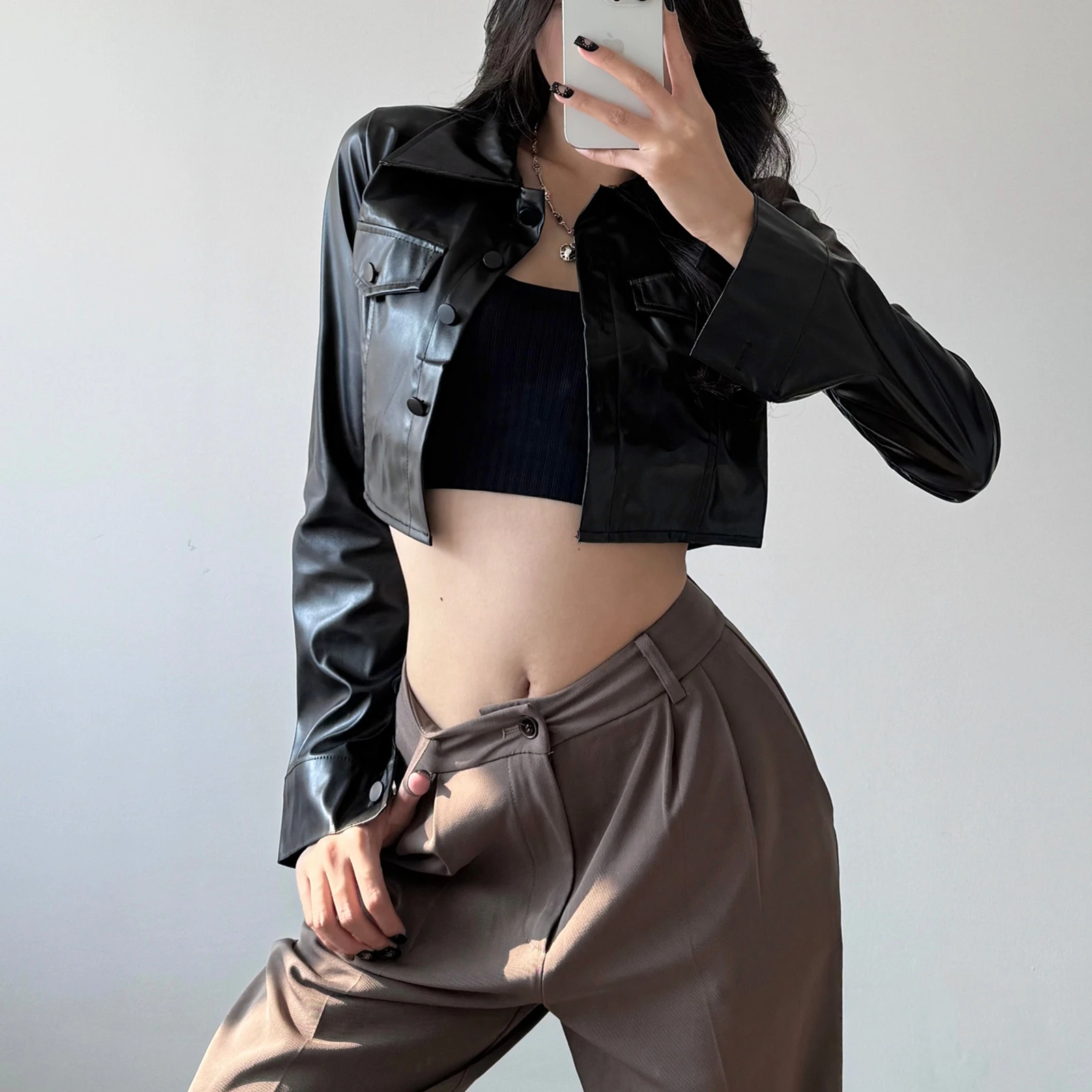 Candyhot Giacca corta sexy in ecopelle Y2K Colletto rovesciato Decorazione bottoni moda Cappotto in PU Cappotti casual da donna vintage da strada