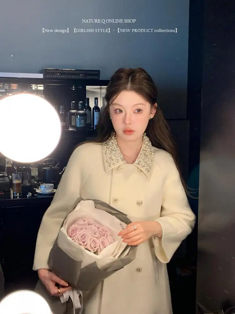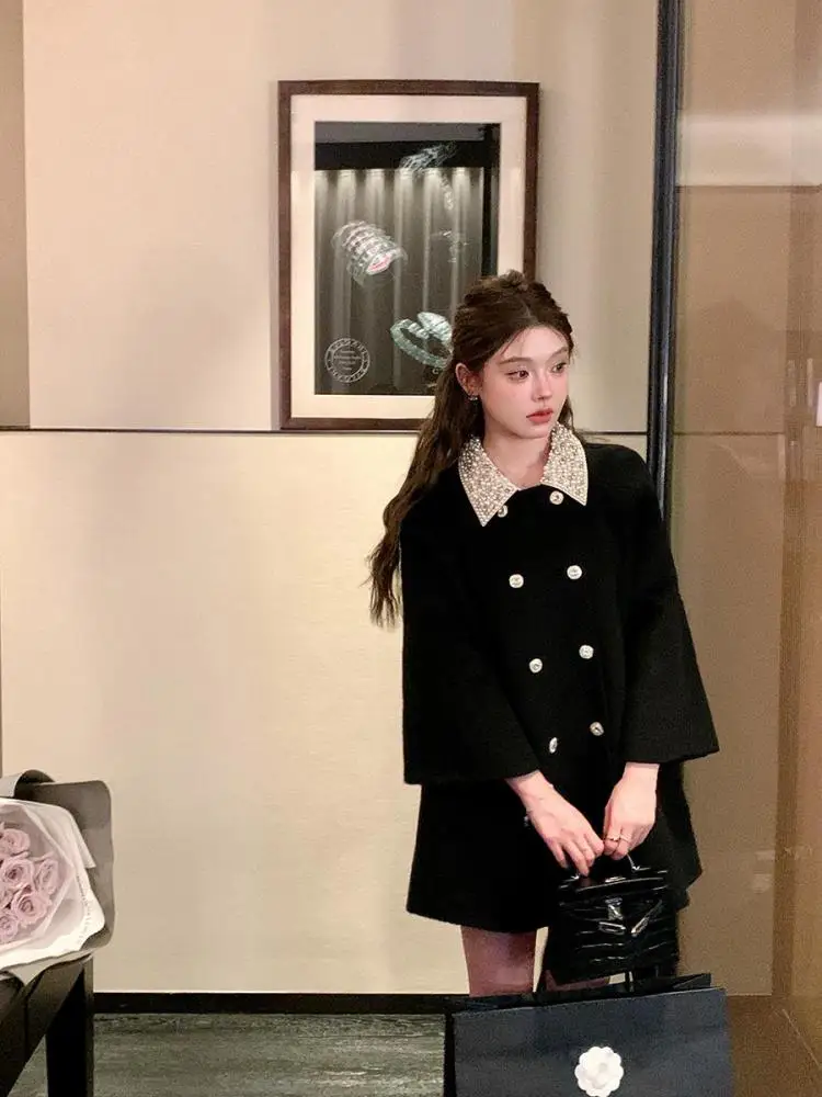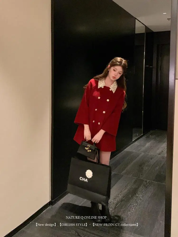 Cappotti larghi a maniche lunghe patchwork nero beige rosso da donna francese 2025 Autunno Inverno Nuovo doppio petto Festival Top Streetwear