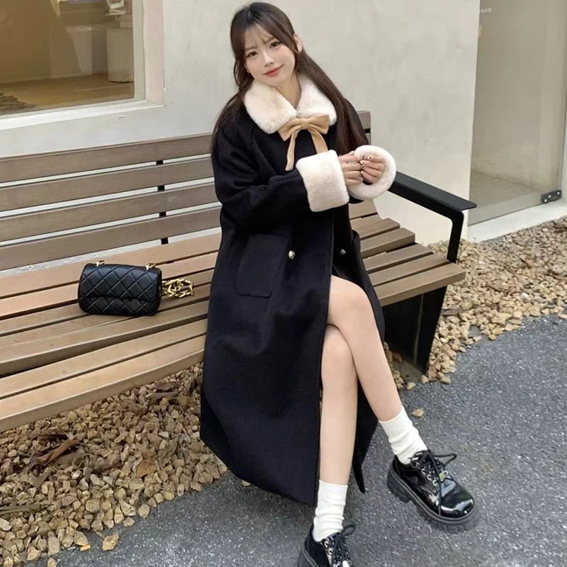 Cappotti midi da donna con fiocco dolce collo di pelliccia patchwork elegante autunno inverno capispalla spesso piccola fragranza estetica top da donna da ufficio novità