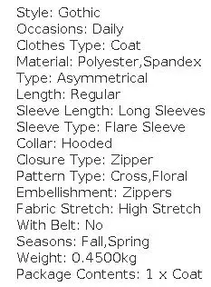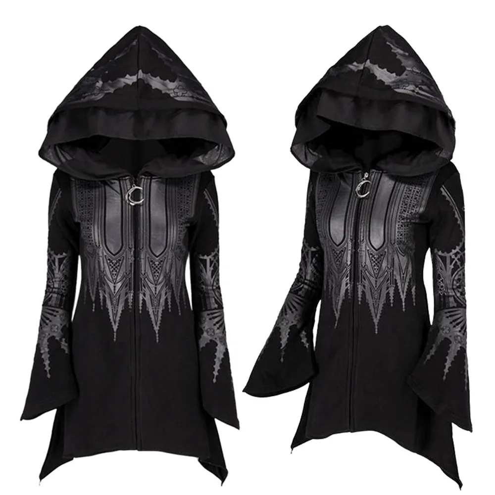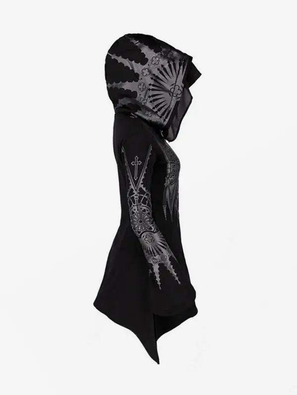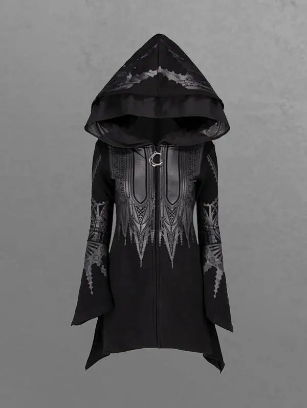 Cappotto con cappuccio asimmetrico con zip gotica da donna primavera autunno Top con stampa floreale incrociata Giacca outwear con maniche svasate nere