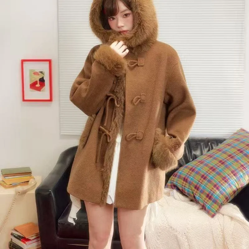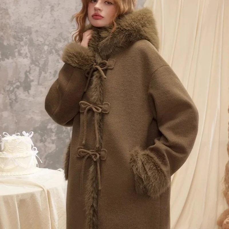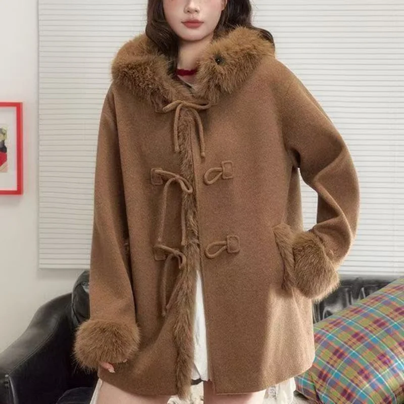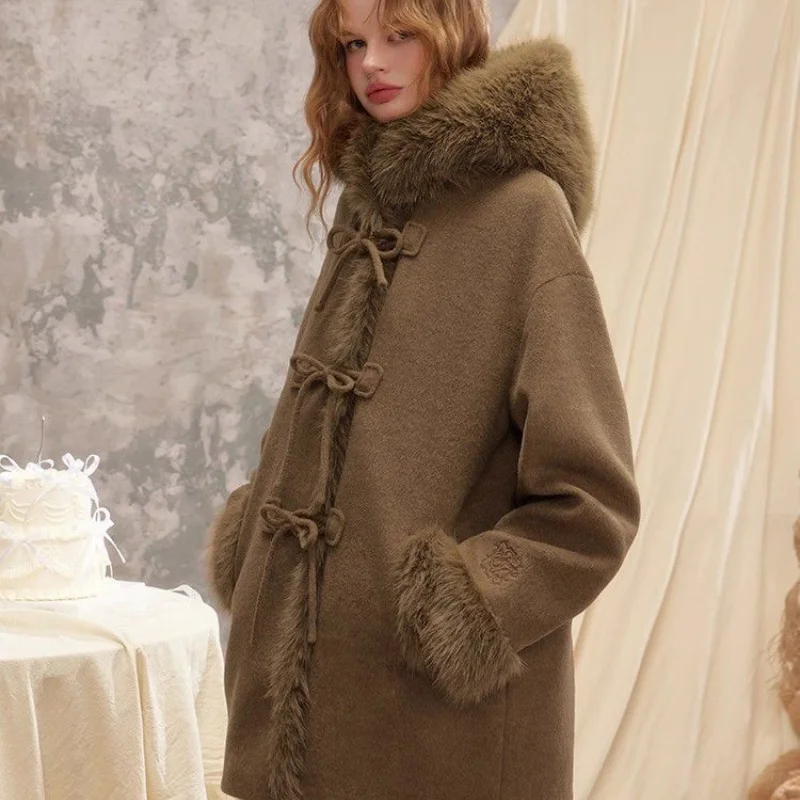 Cappotto con cappuccio da donna stile college, retrò e alla moda, con bordi in peluche e papillon, cappotto di lana