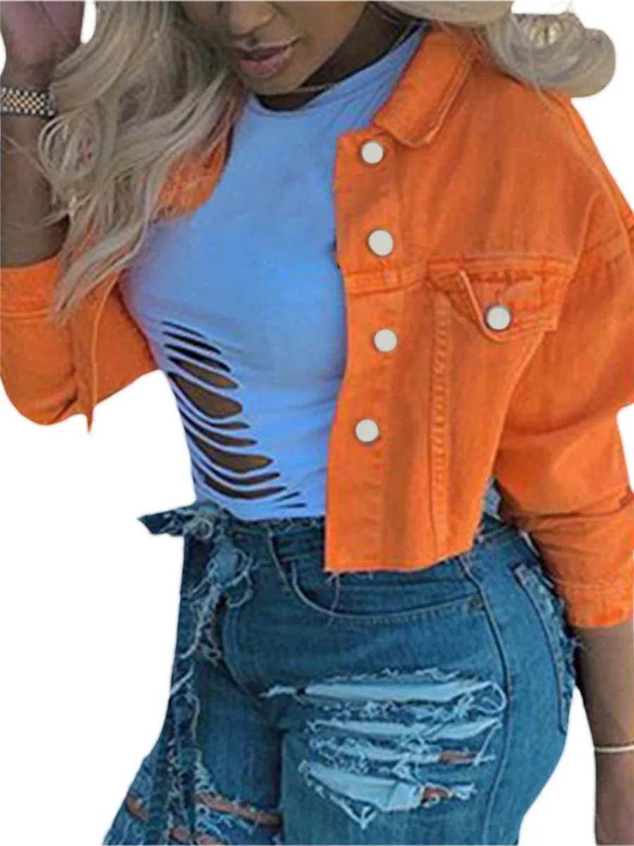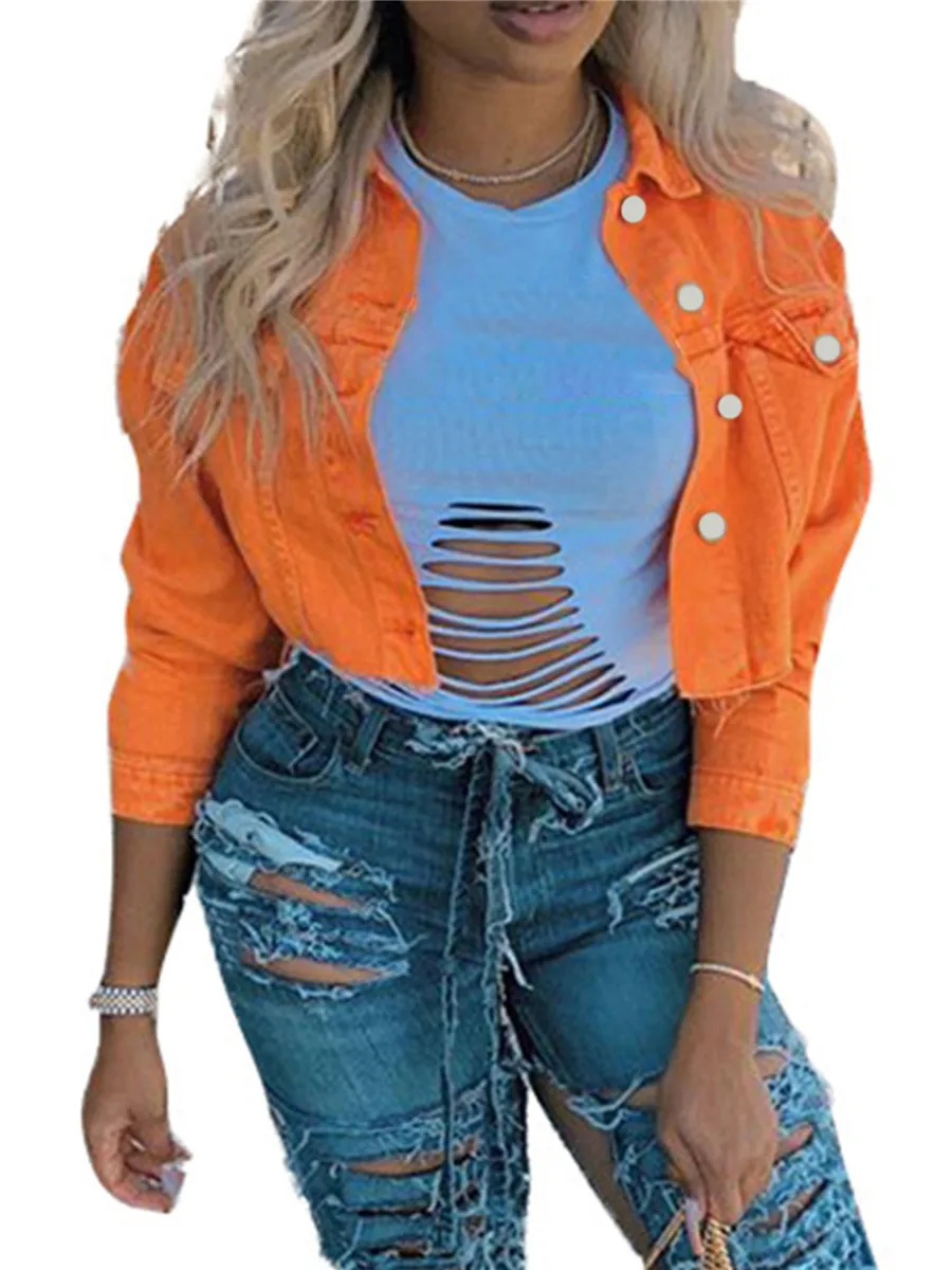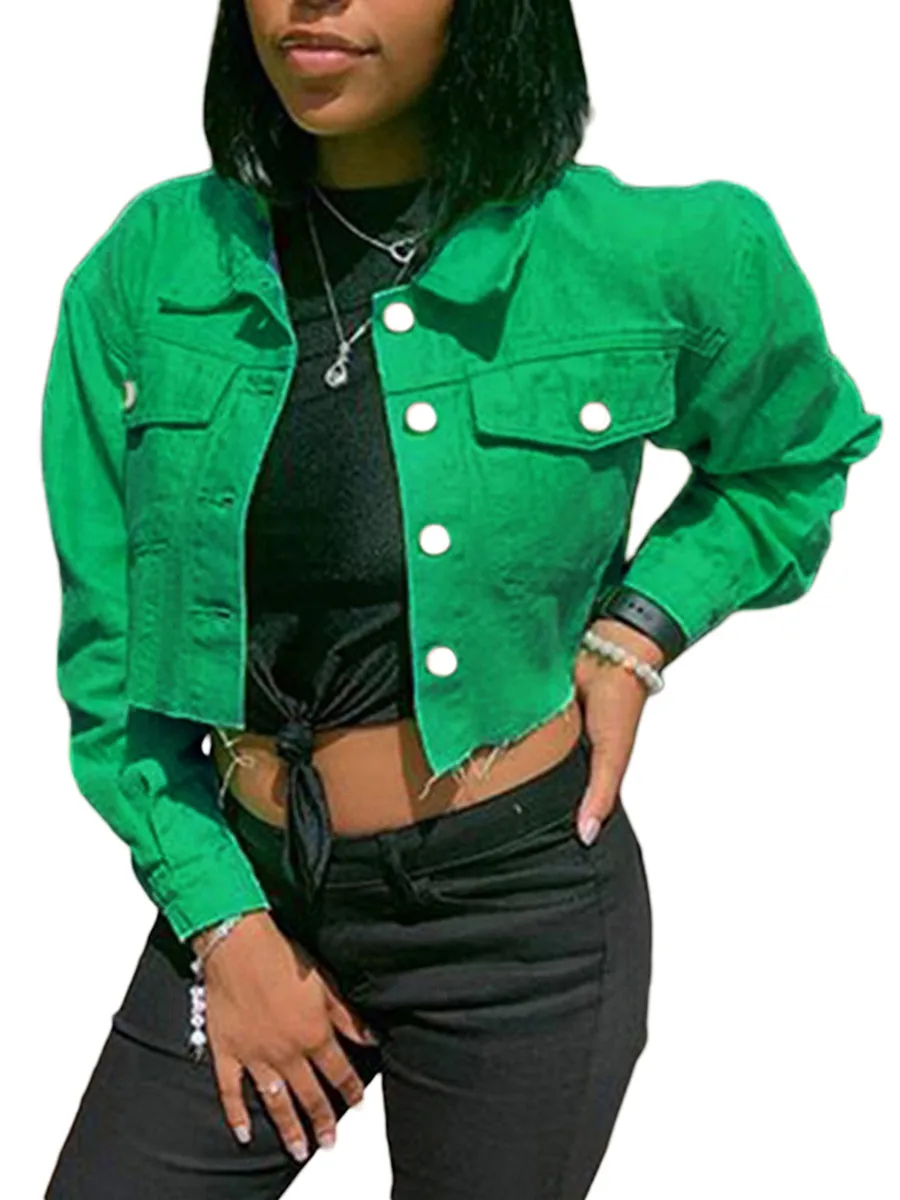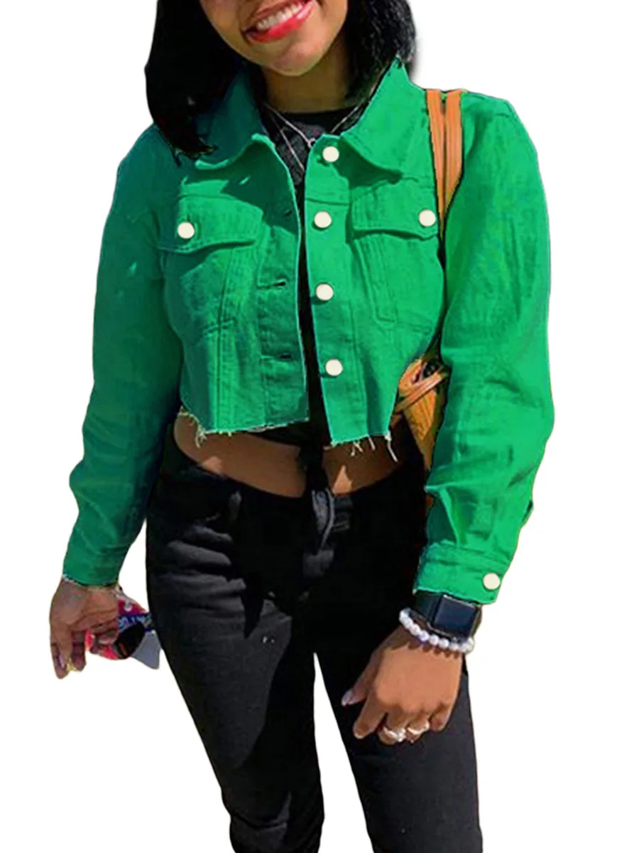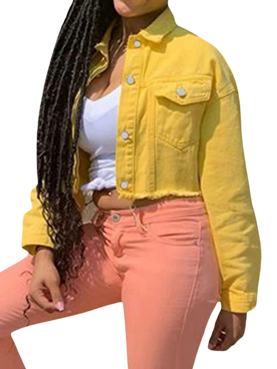 Caratteristiche: Tinta unita, maniche lunghe, design con risvolto, chiusura con bottoni sul davanti, 2 tasche, design con orlo sfilacciato, semplice giacca di jeans corta casual da donna.