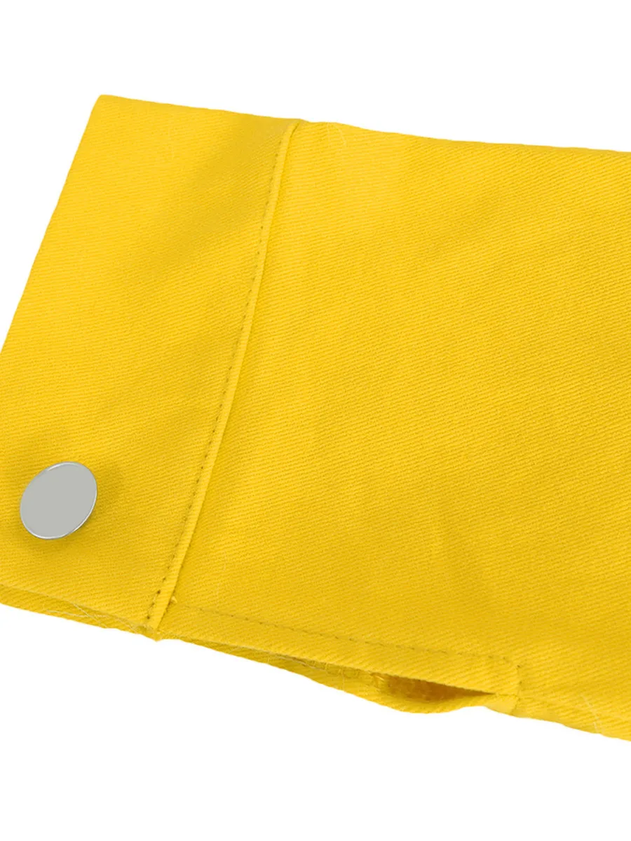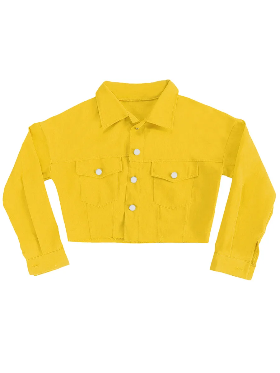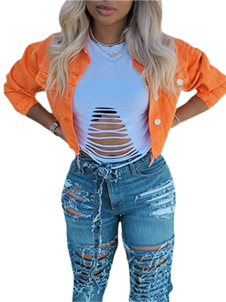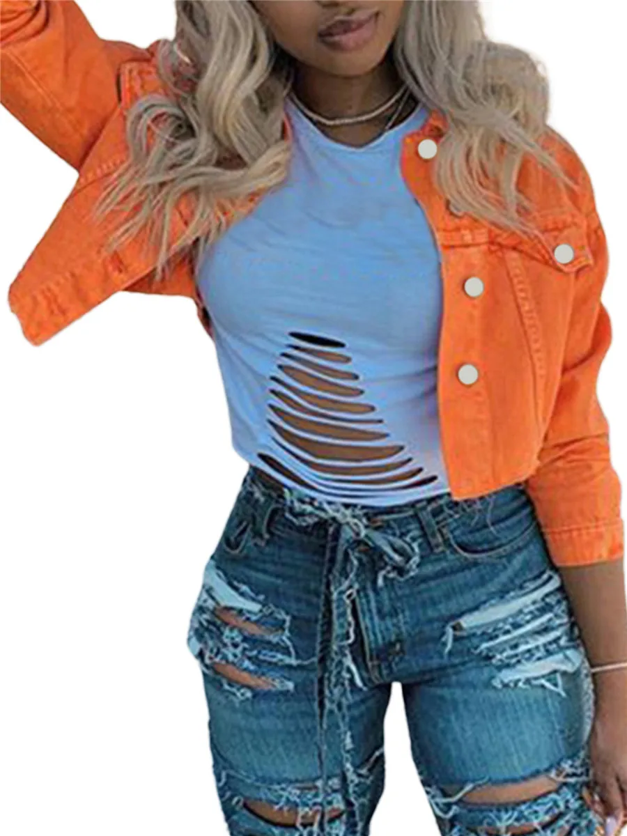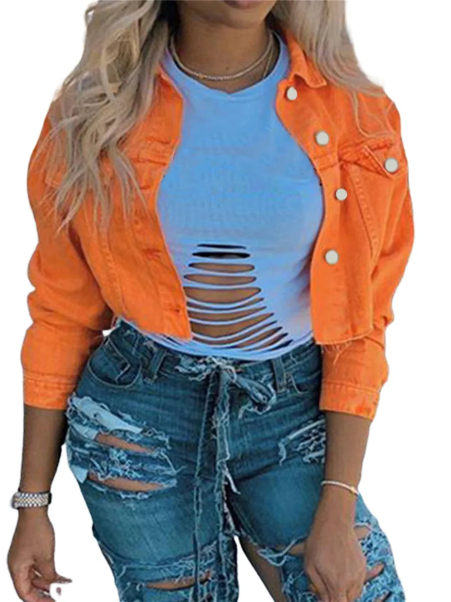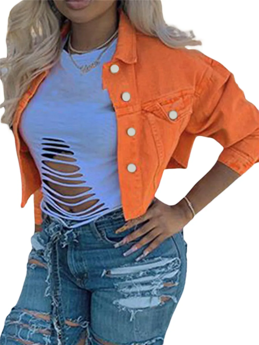 Caratteristiche: Tinta unita, maniche lunghe, design con risvolto, chiusura con bottoni sul davanti, 2 tasche, design con orlo sfilacciato, semplice giacca di jeans corta casual da donna.
