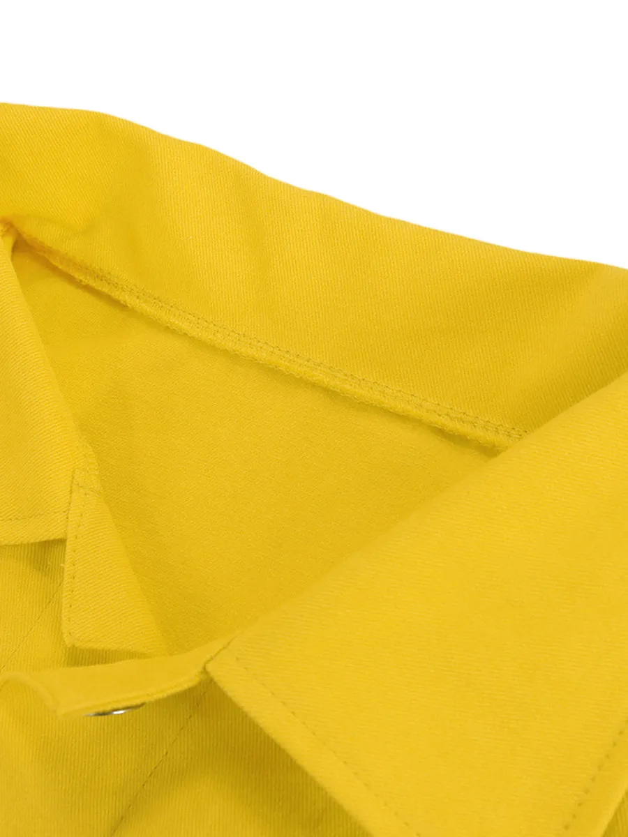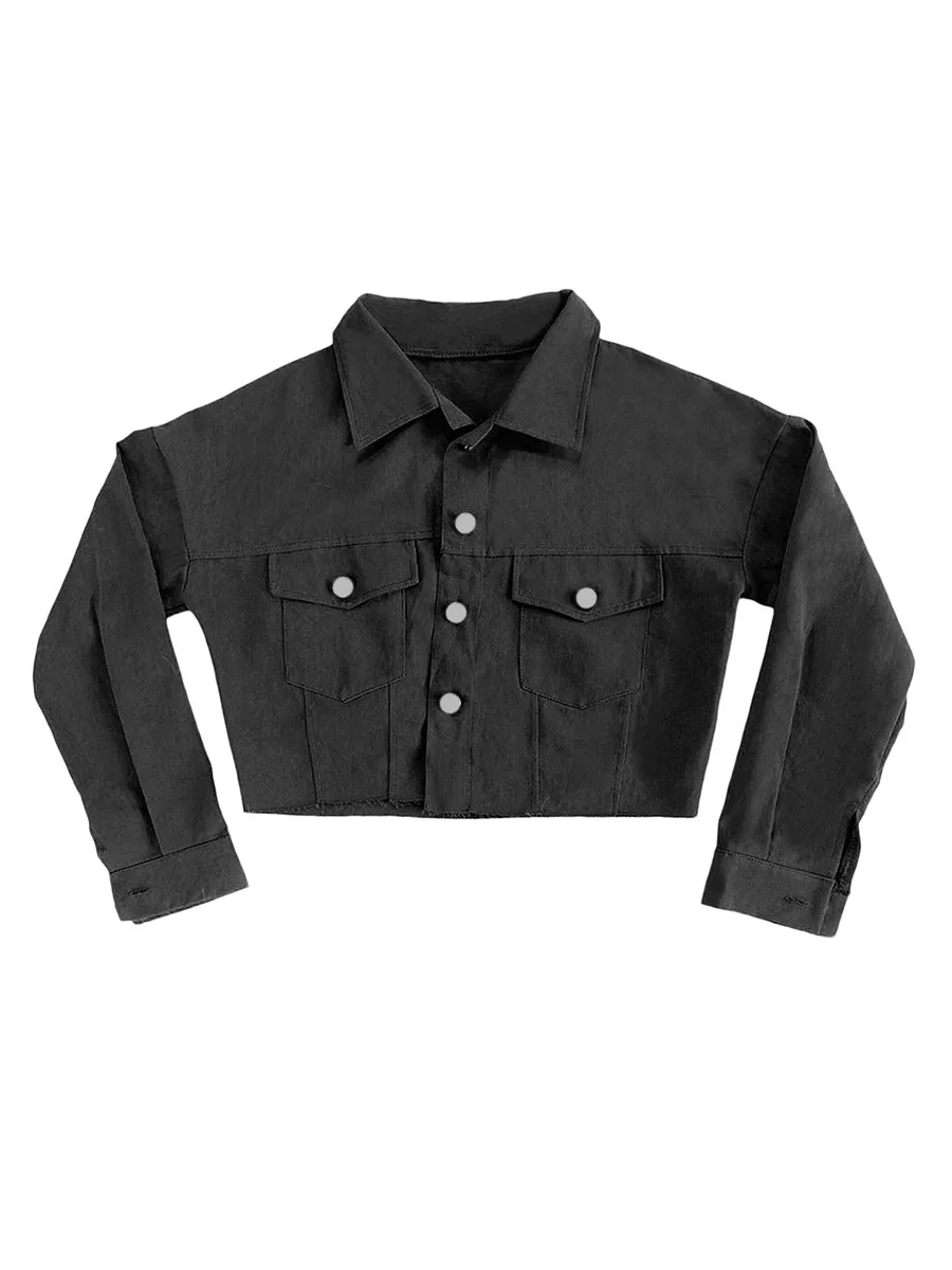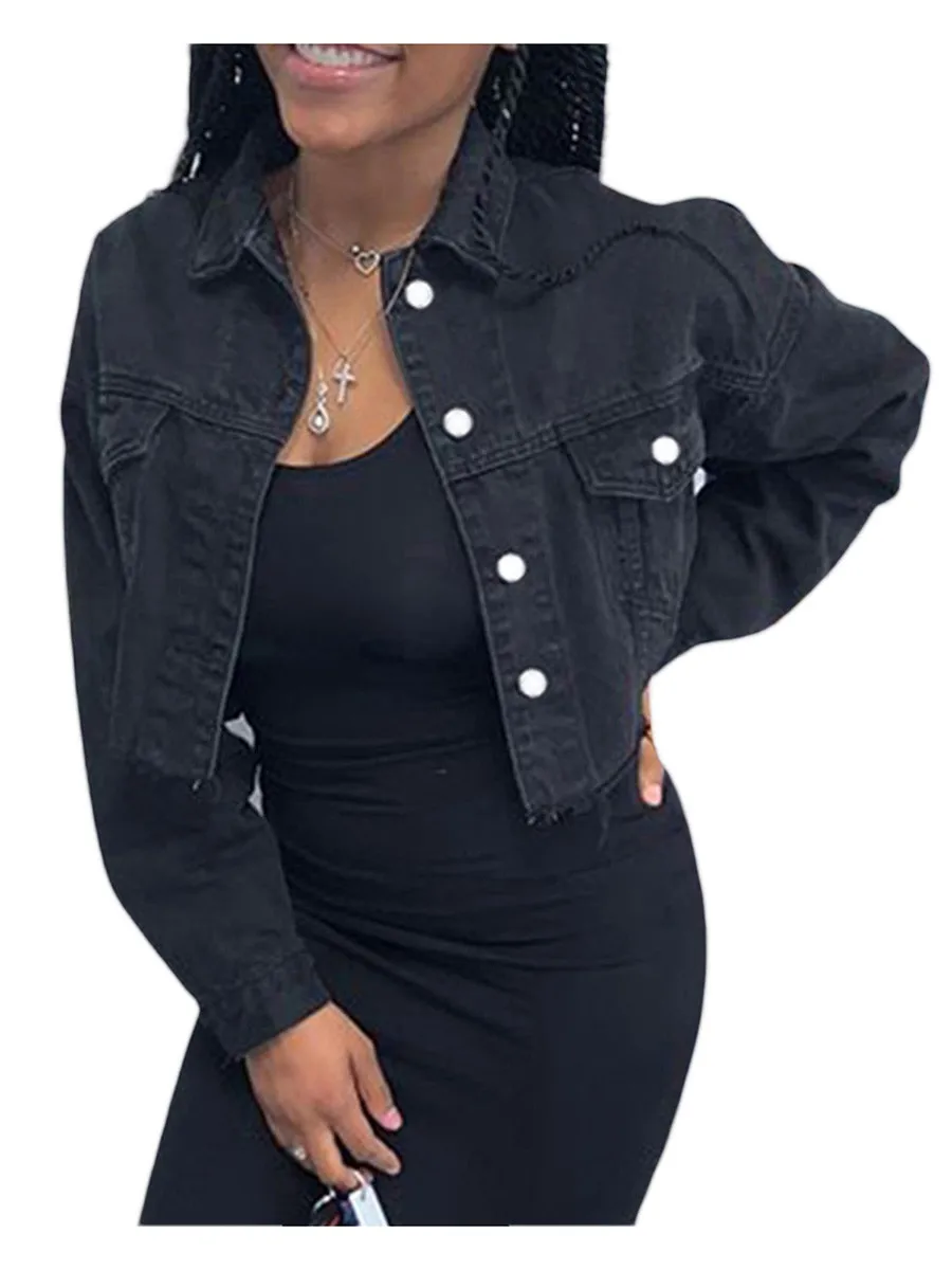 Cappotto corto in denim da donna, giacca con risvolto a maniche lunghe tinta unita Cappotto corto in jeans con orlo invecchiato abbottonato