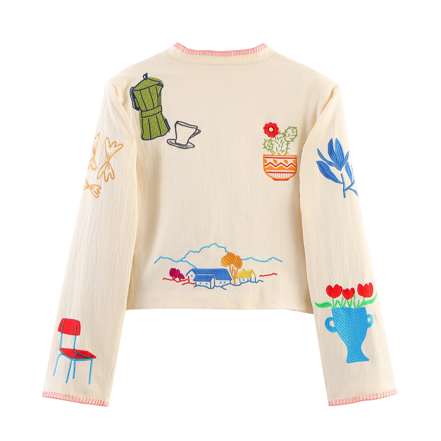 Cappotto corto ricamato a contrasto a maniche lunghe con scollo tondo allentato dolce casual da donna autunno 2025