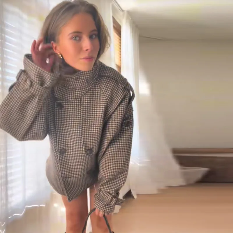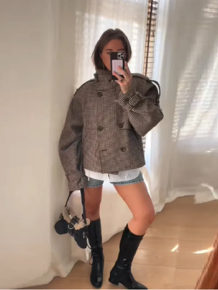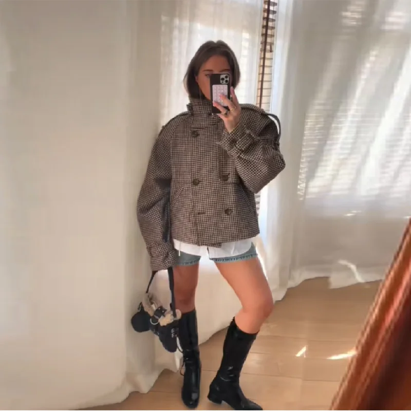 Elegante risvolto scozzese giacca corta moda donna manica lunga tasche doppiopetto cappotto allentato 2025 autunno Lady Street Outwear