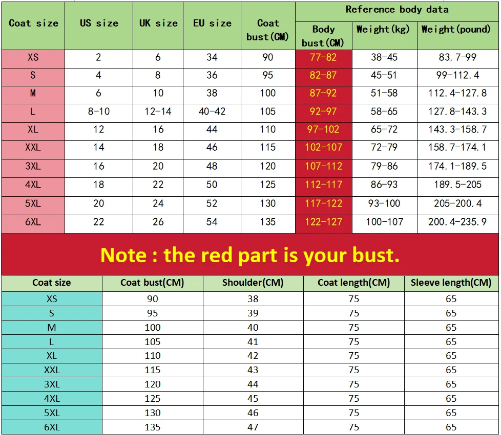 Si prega di attenzione sulla tabella delle taglie, soprattutto il busto.Il tavolo mostra i parametri esterni del cappotto.La dimensione individuale dovrebbe essere determinata dalla tua taglia busto più 6-8 cm, per esempio se la dimensione del busto è di 82 cm, 82+8=90 cm, quindi prendi la taglia XS.