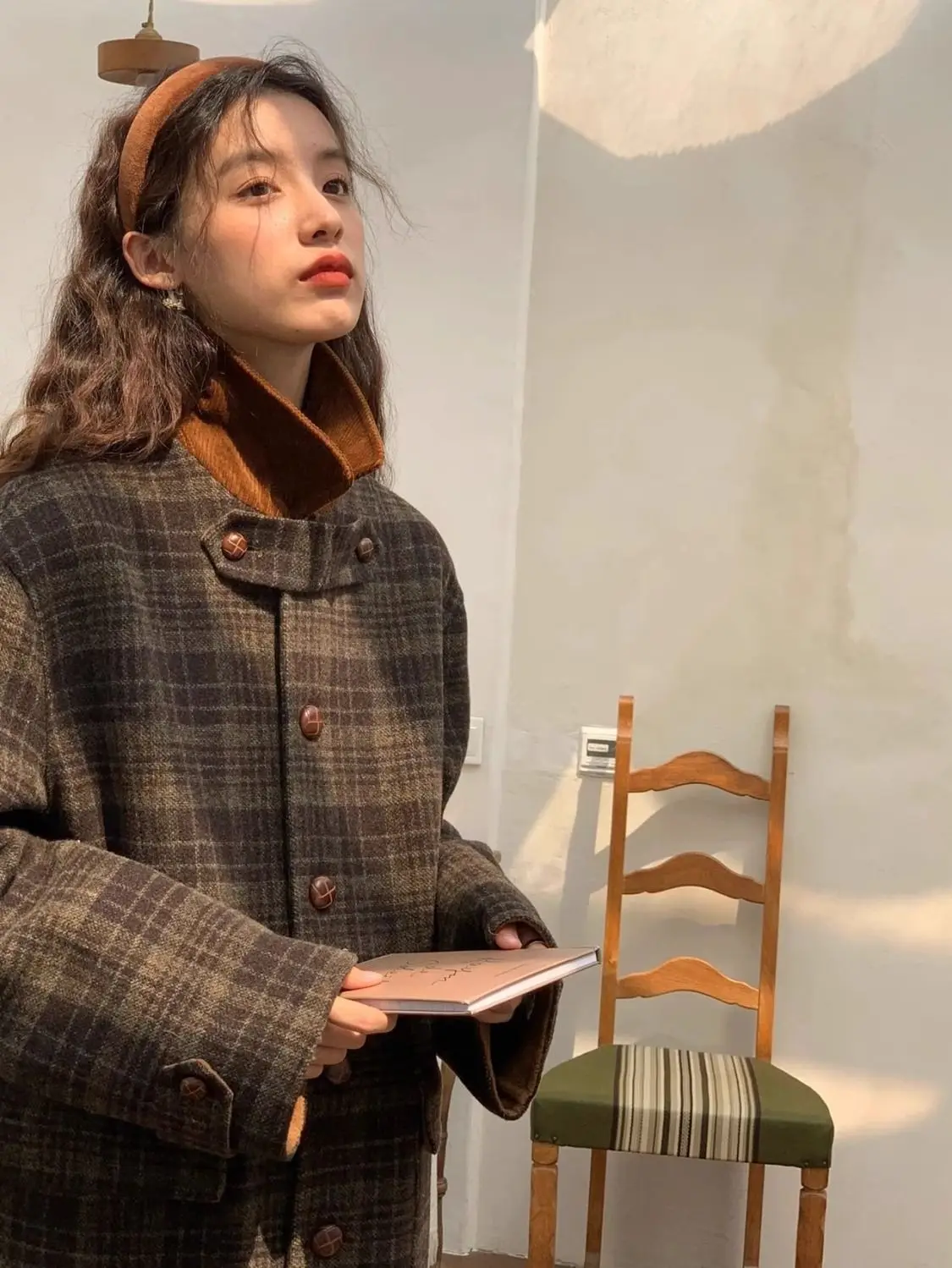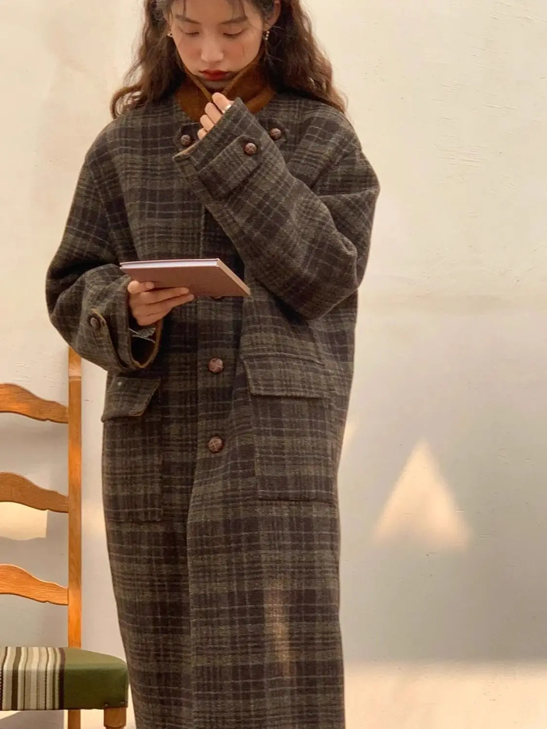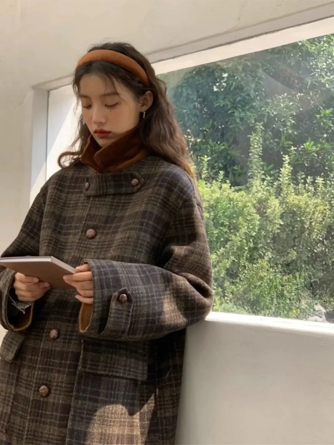 Cappotto di lana scozzese retrò per cappotto di lana spesso alla moda con giunture doppie di nuovo stile autunno e inverno da donna