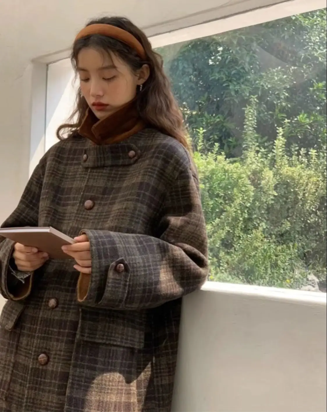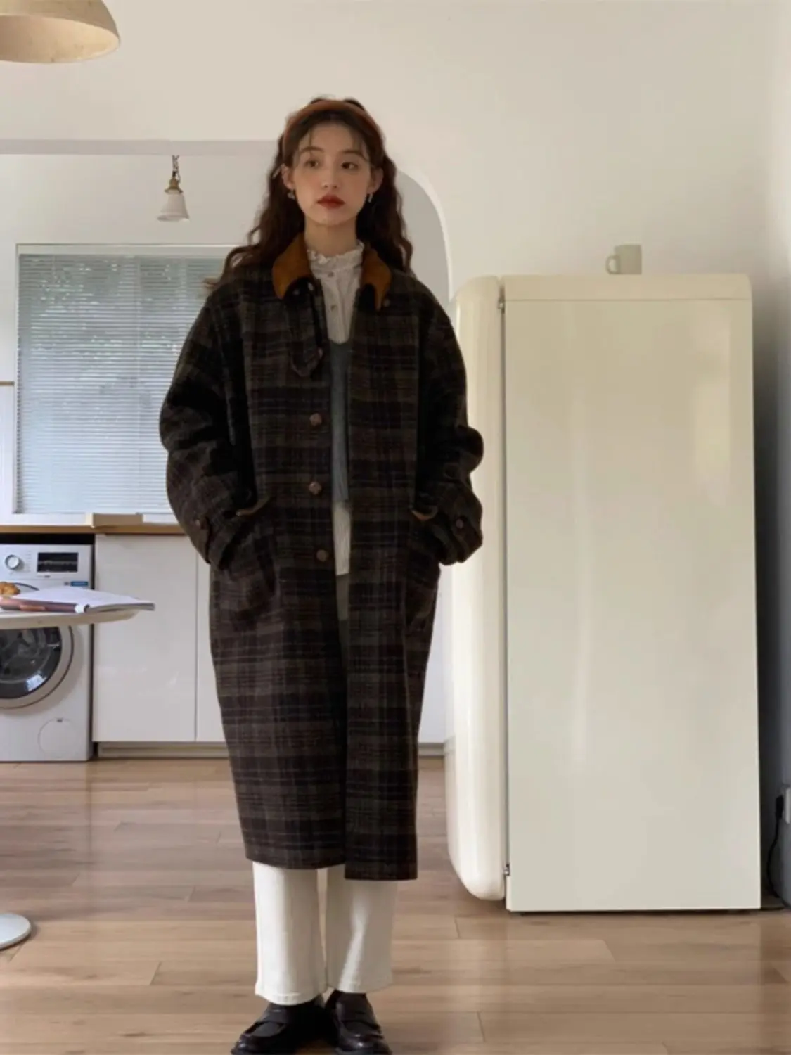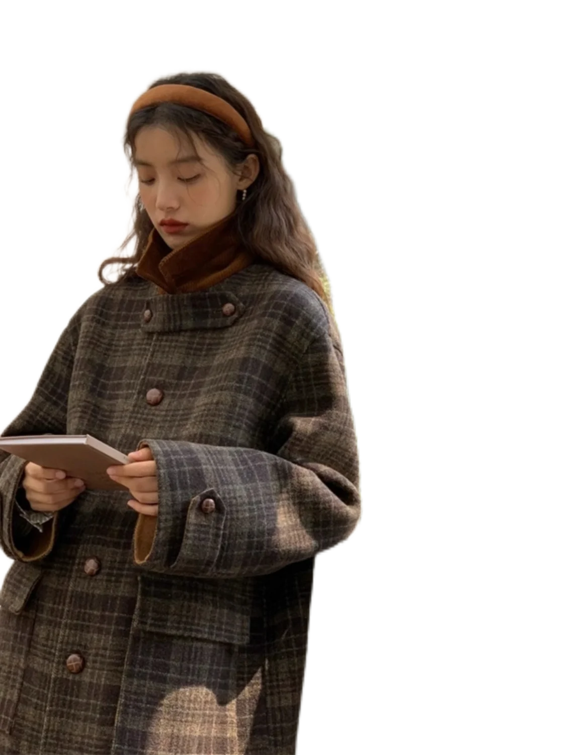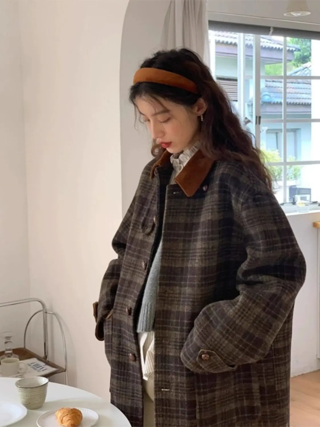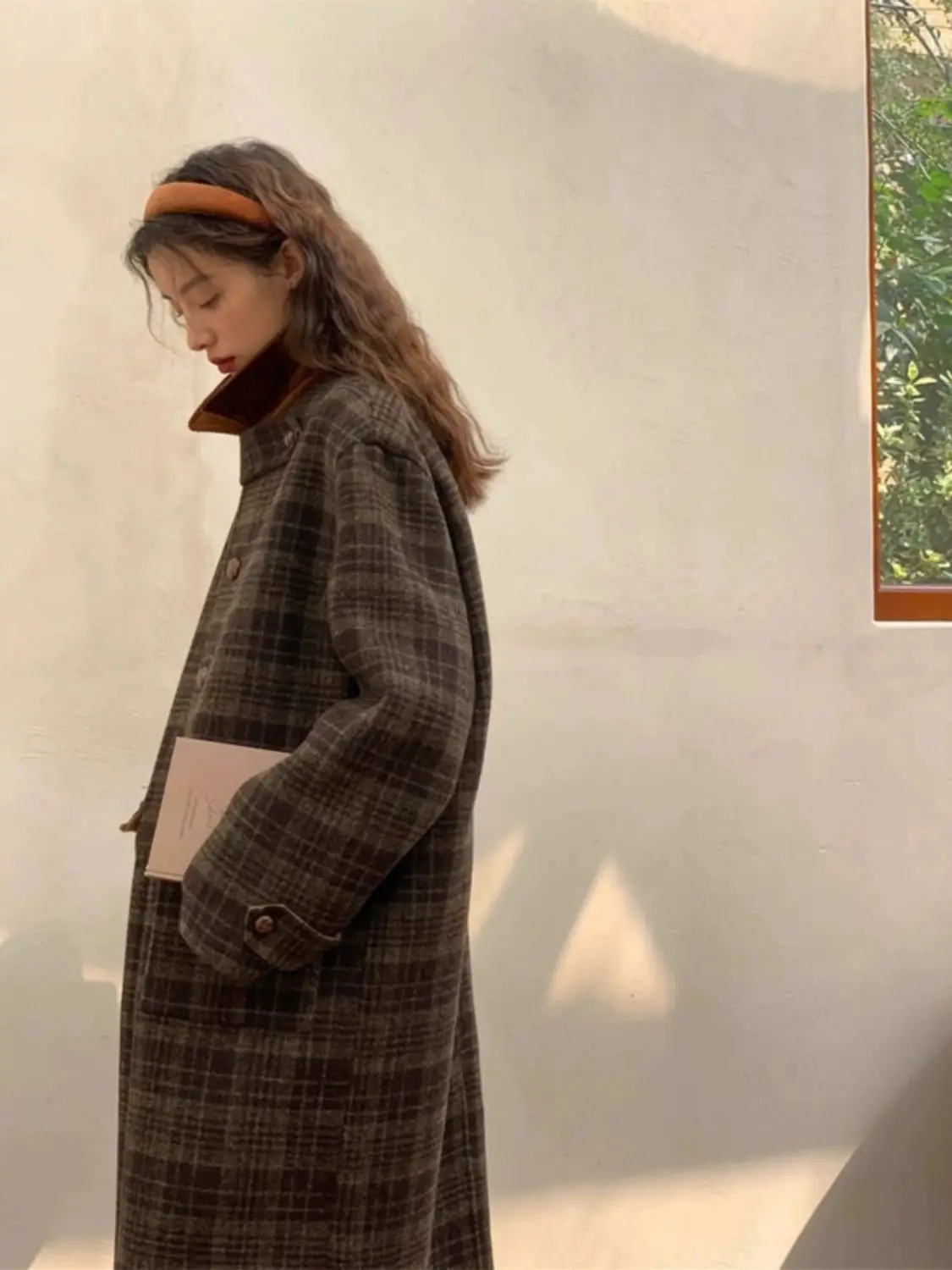 Cappotto di lana scozzese retrò per cappotto di lana spesso alla moda con giunture doppie di nuovo stile autunno e inverno da donna