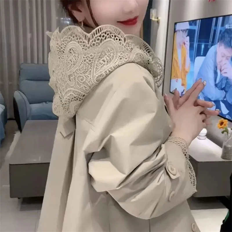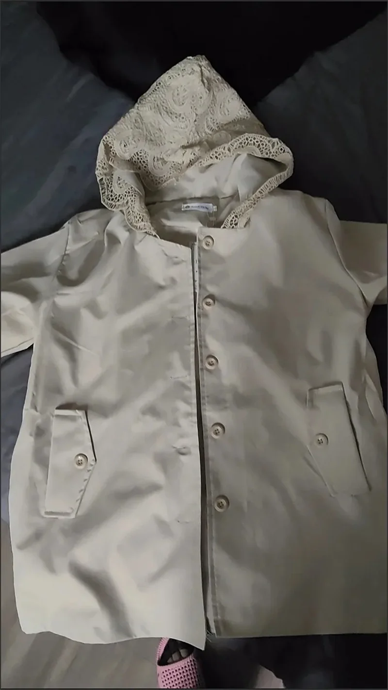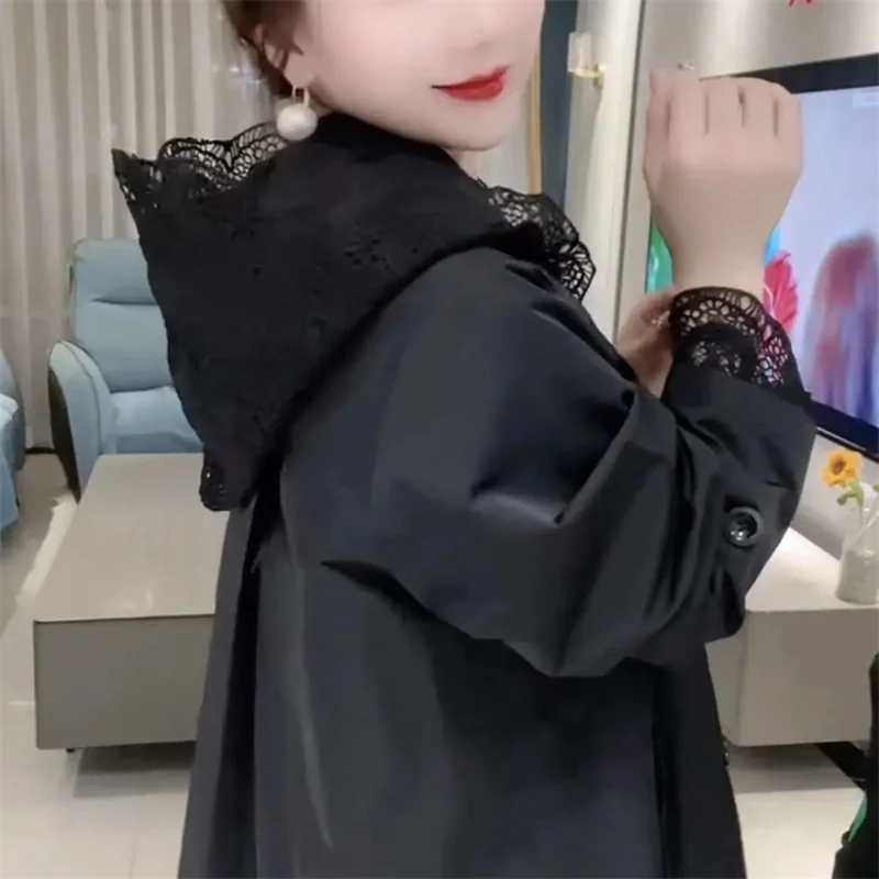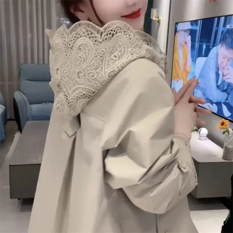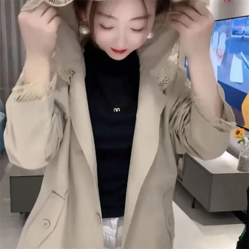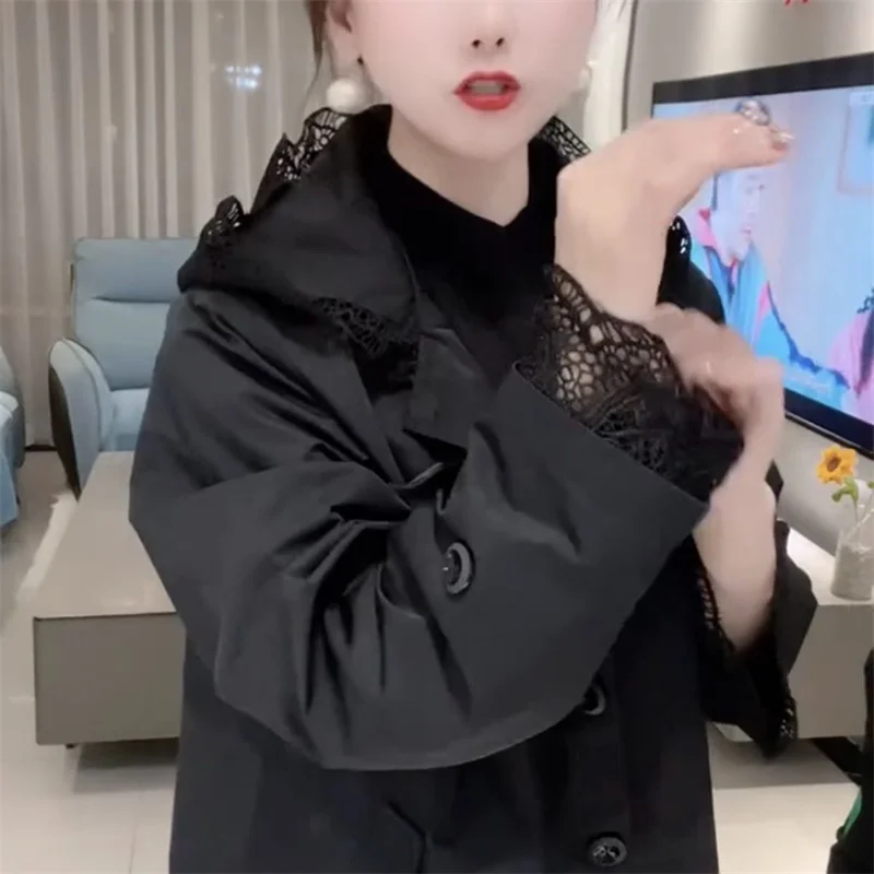 Cappotto giacca a vento europeo da donna Primavera Autunno 2025Nuova giacca temperamento Cuciture con cappuccio in pizzo Capispalla Moda donna Overwear