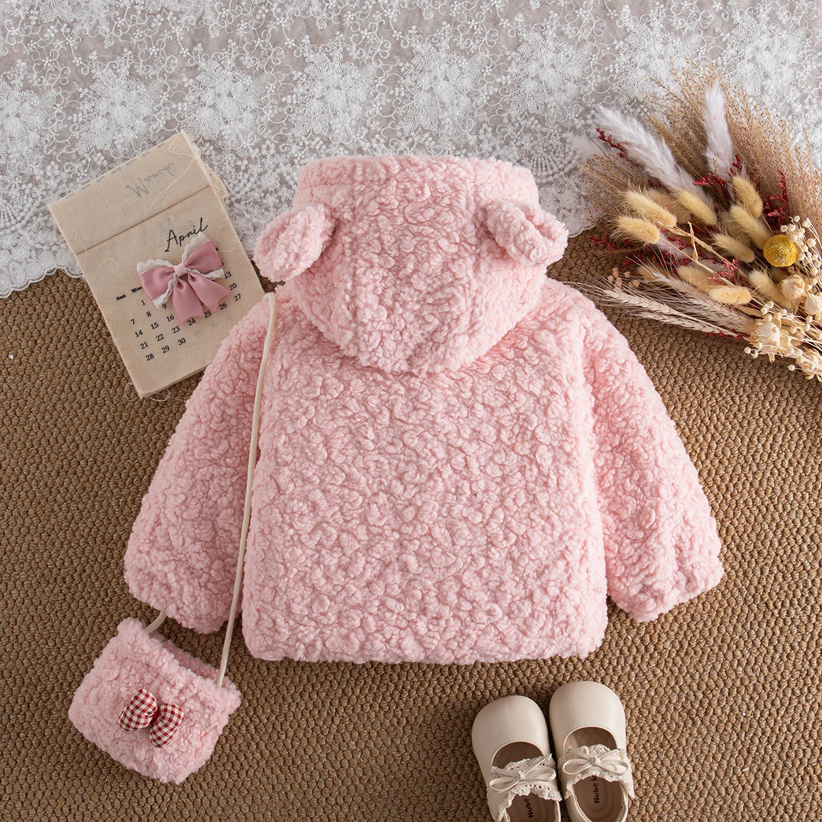 Cappotto invernale in pile per neonata con cappuccio, sacchetto regalo con fiocco dolce, abbigliamento caldo quotidiano per bambini all’aperto (9 mesi a 4 anni)