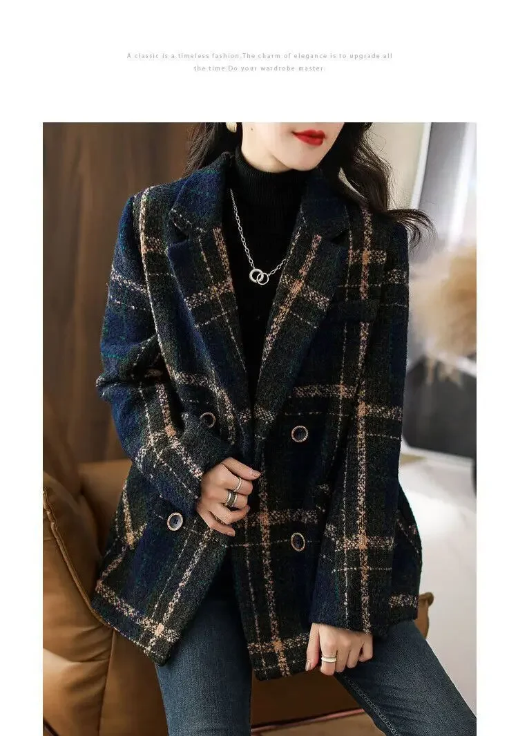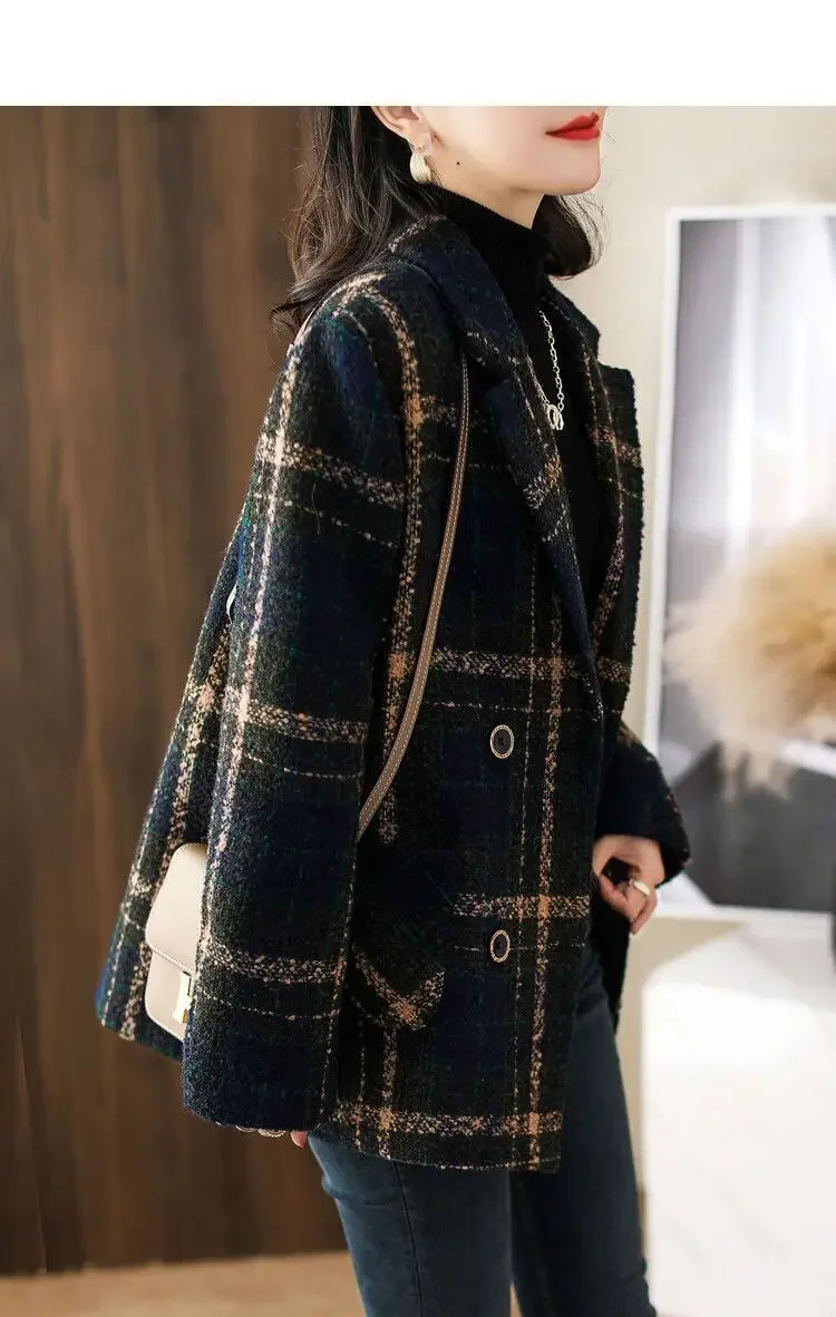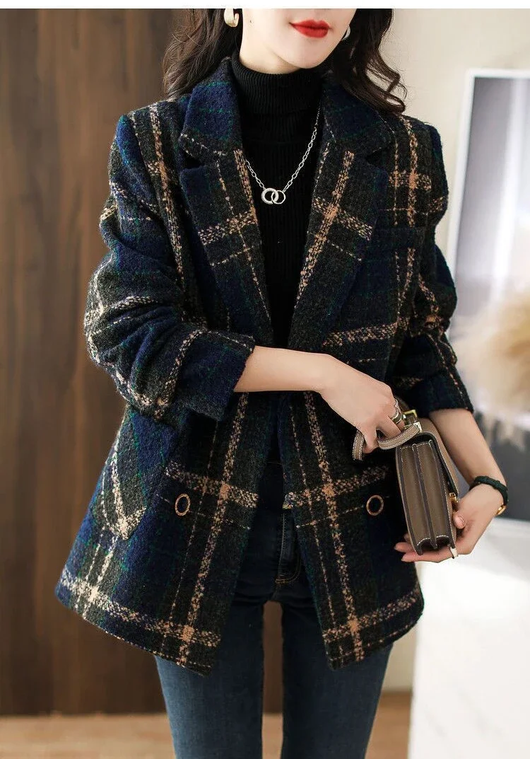 Cappotto invernale retrò da donna Colletto rovesciato Giacche moda doppio petto per donna Cappotto di lana versatile con cuciture a quadri