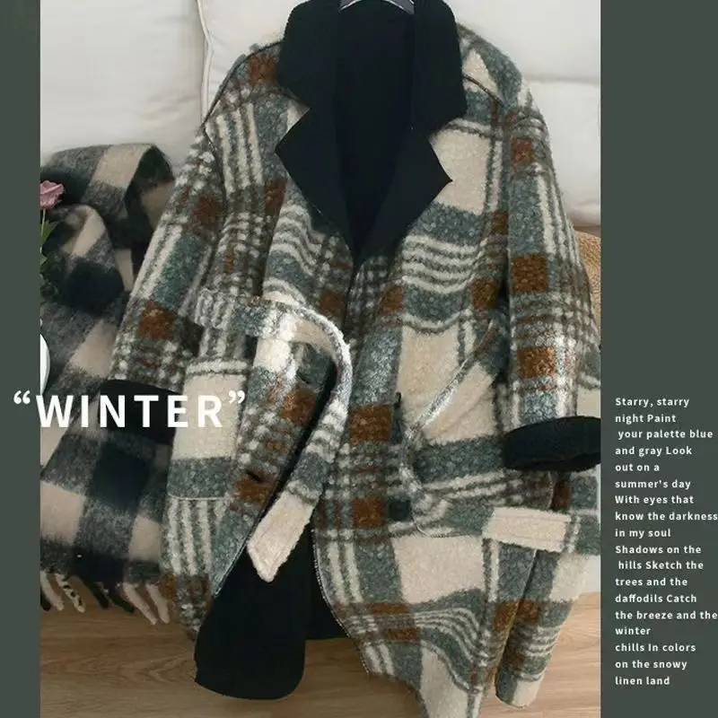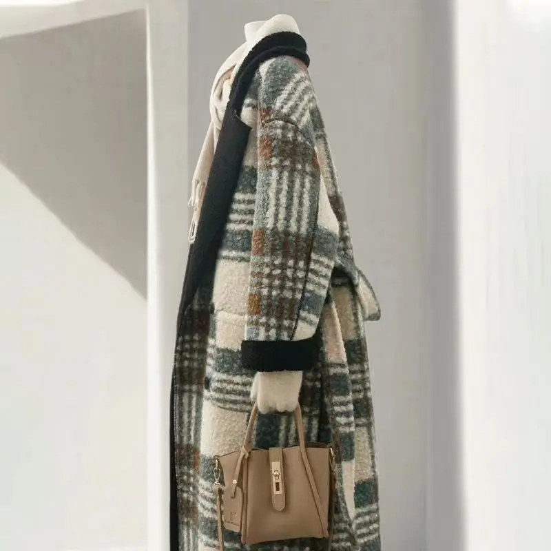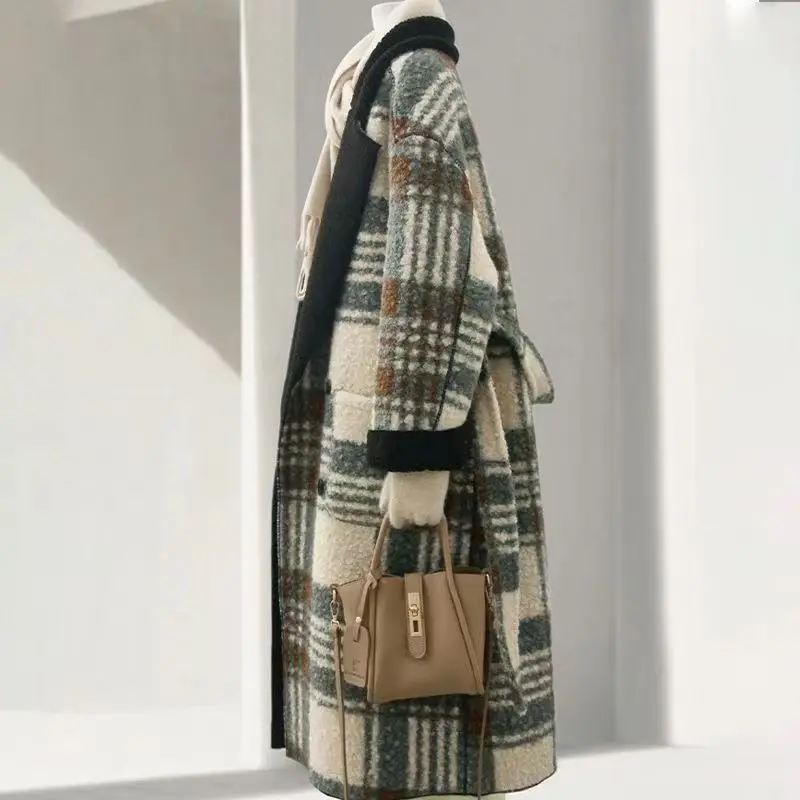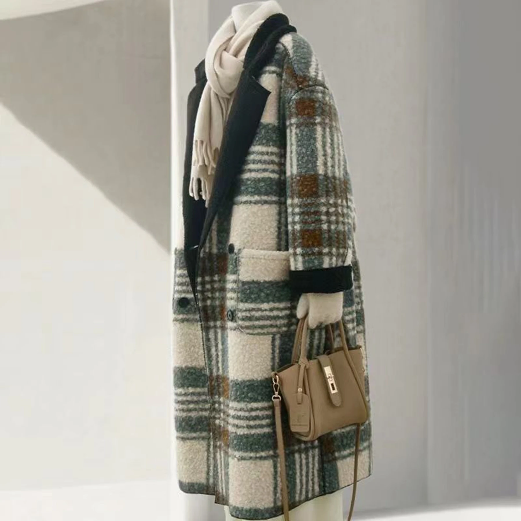 Cappotto lungo scozzese double-face retrò di fascia alta per donna in autunno e inverno, giacca ampia con giunture sul risvolto in pelo di agnello