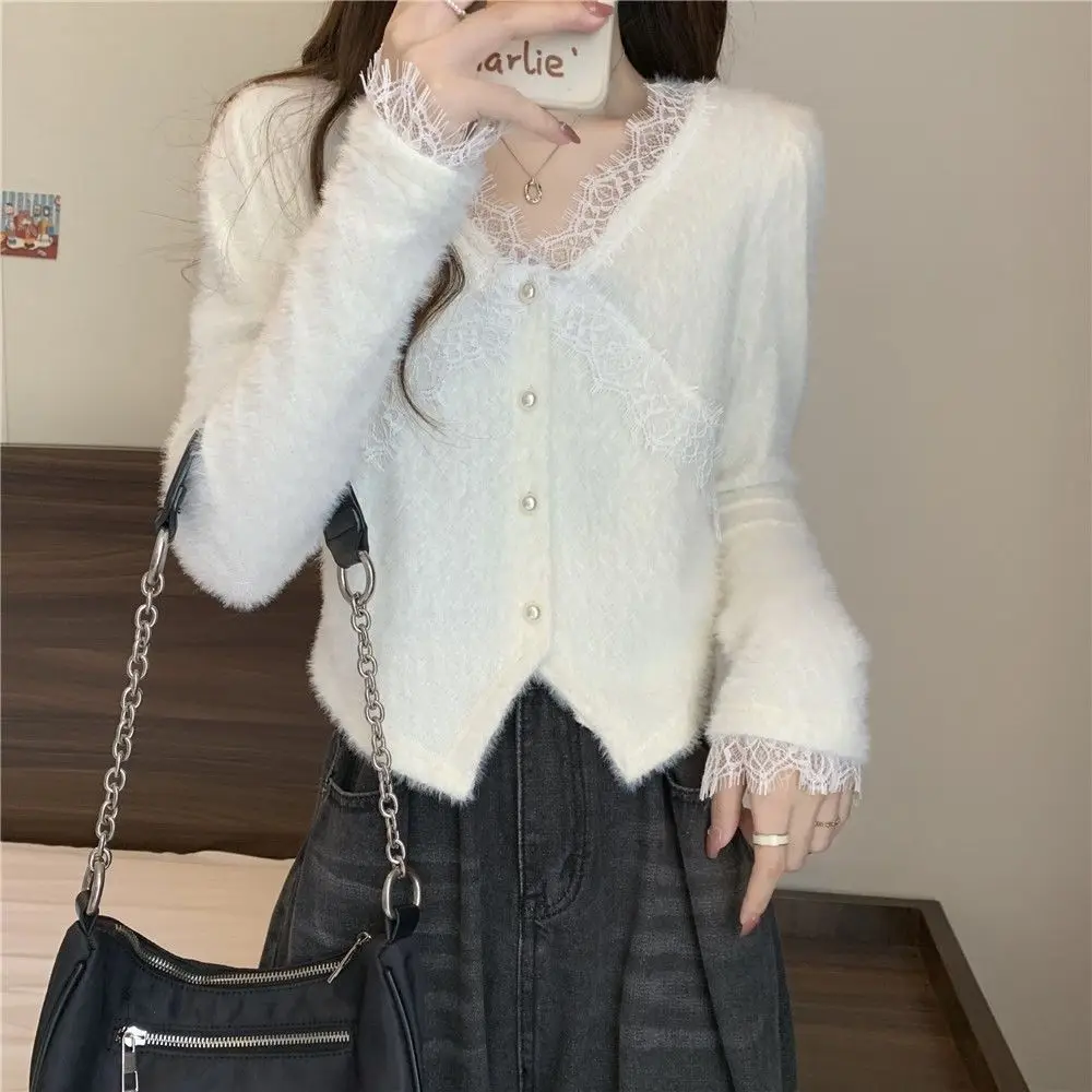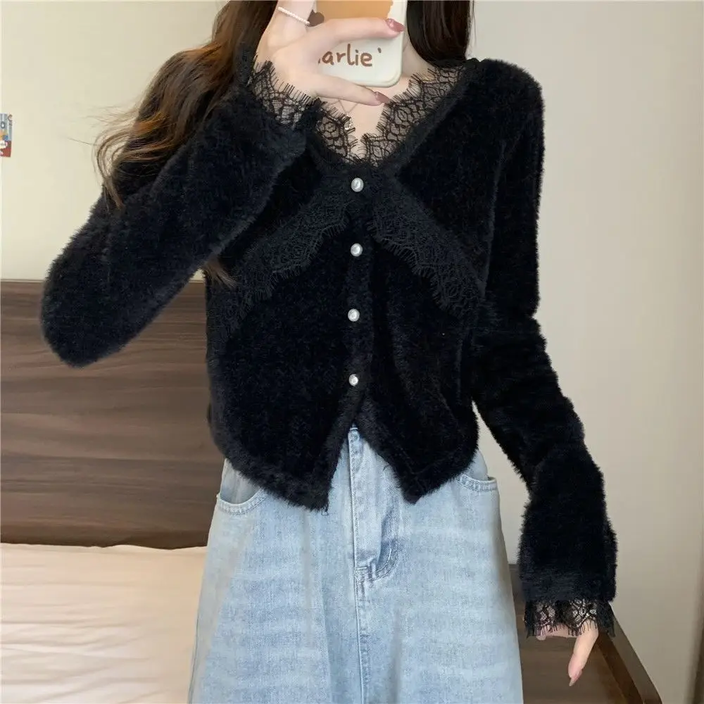 Cardigan coreano irregolare patchwork in pizzo a maniche lunghe autunno inverno nuovo scollo a V solido corto moda top dolce tendenza vestiti da donna