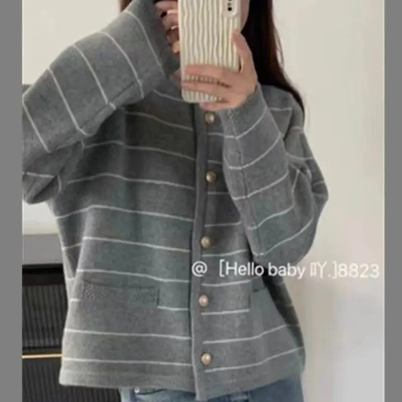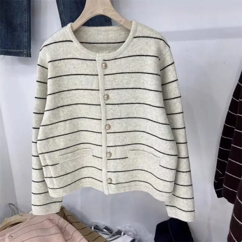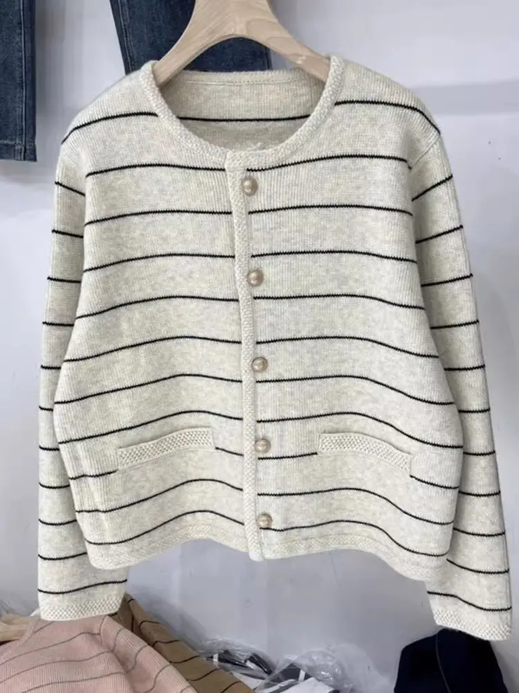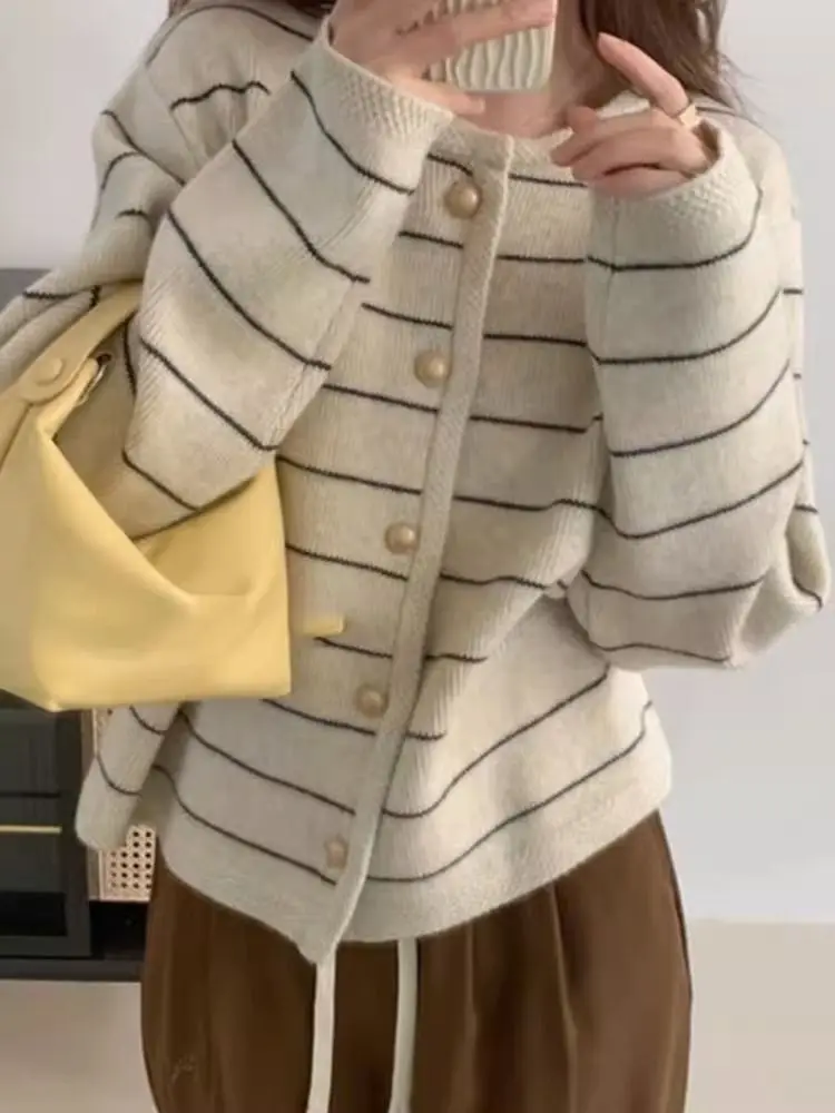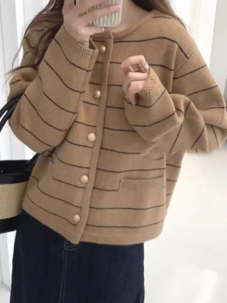 Cardigan lavorato a maglia a righe chic francese da donna invernale ampio morbido girocollo retrò elegante cappotto maglione 1Cardigan lavorato a maglia a righe chic francese da donna invernale ampio morbido girocollo retrò elegante cappotto maglione