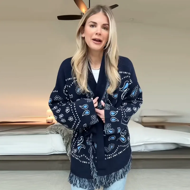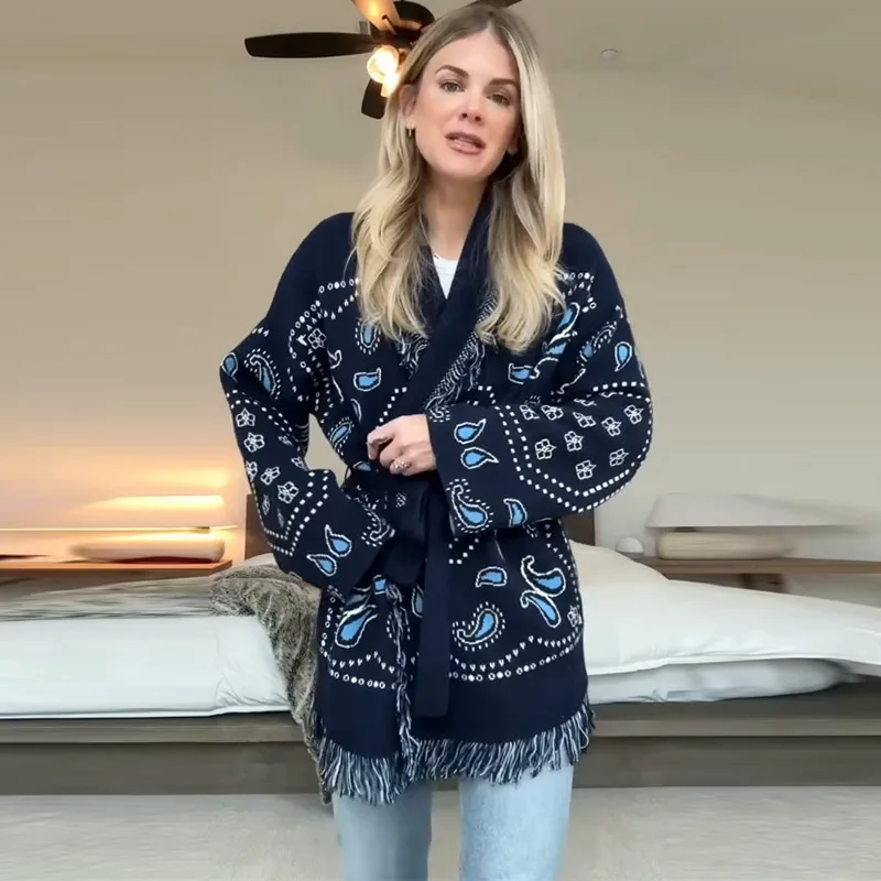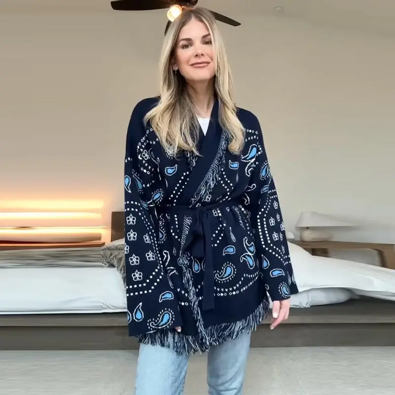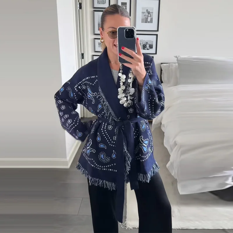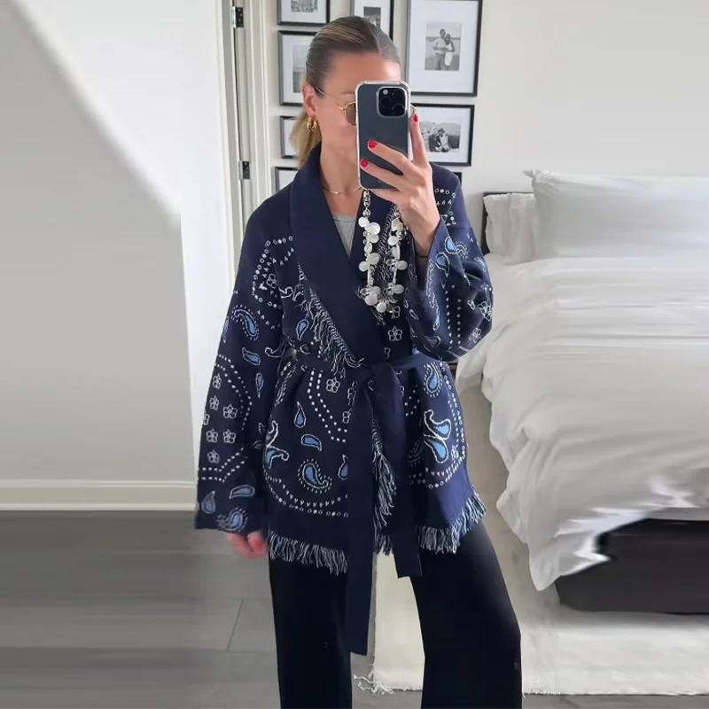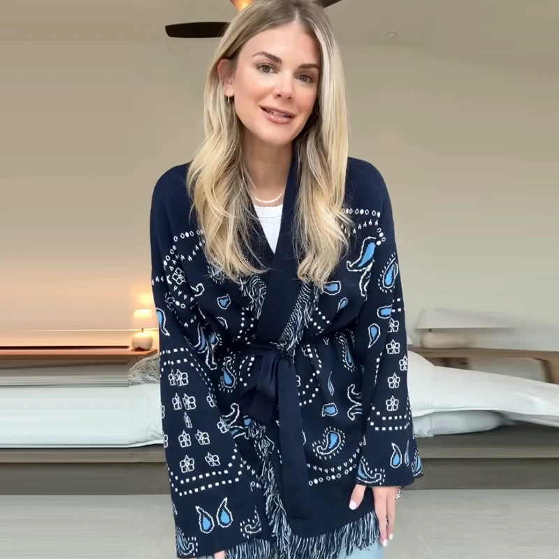 Cardigan lavorato a maglia da donna stampato alla moda Street Chic Nappe Manica lunga con lacci Maglione femminile 2025 Cappotti larghi da donna autunnali