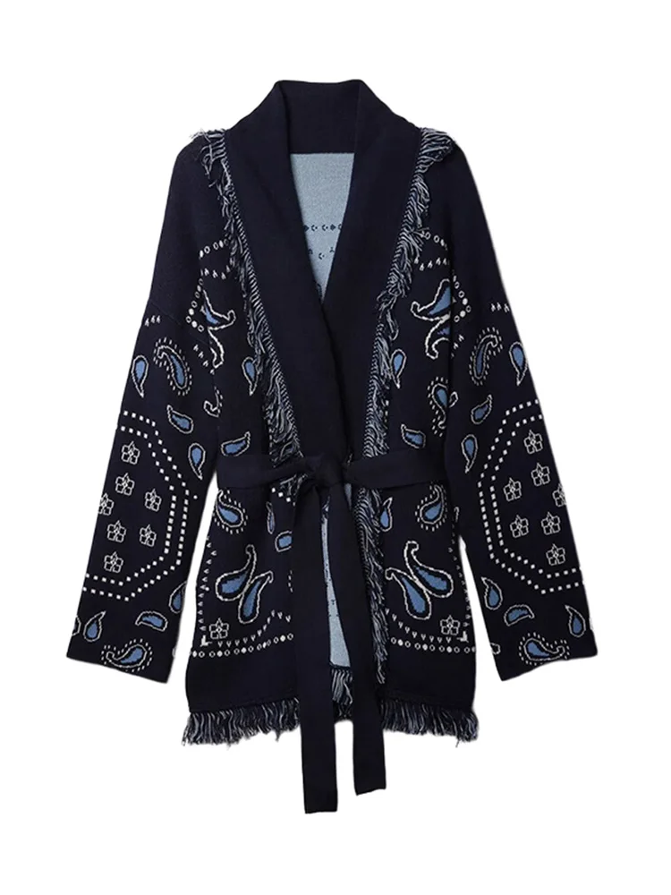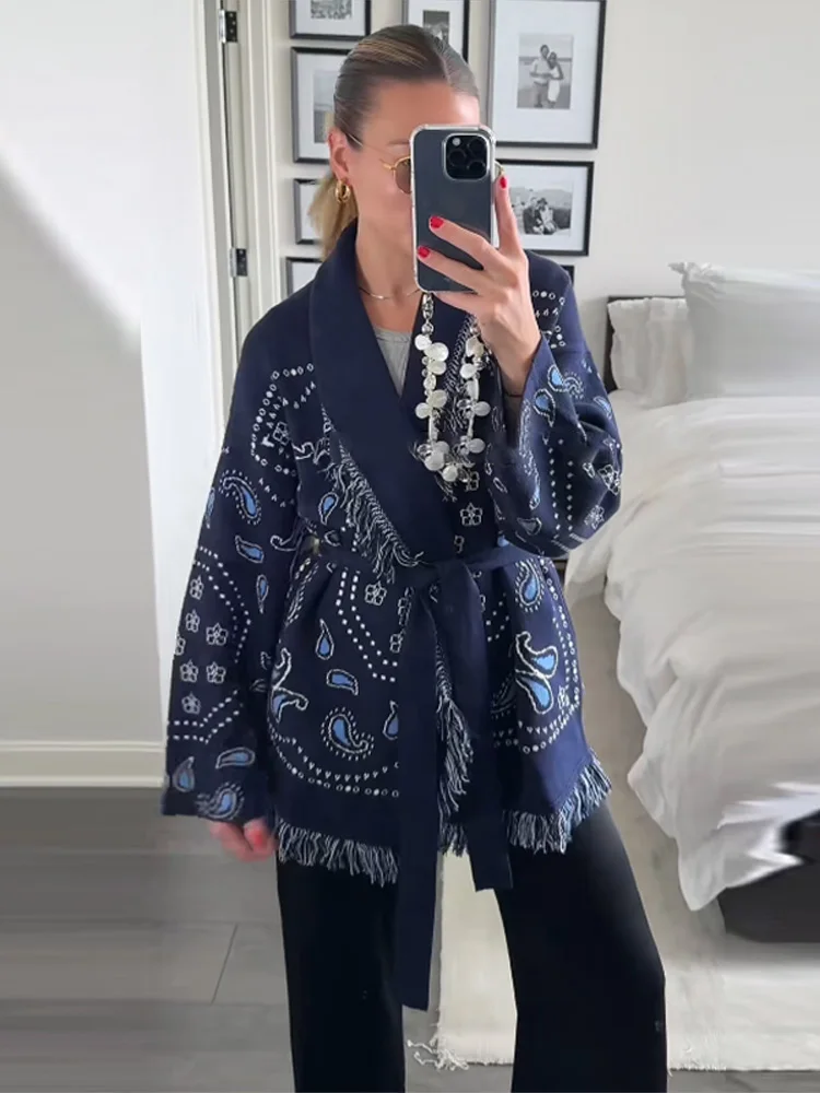 Cardigan lavorato a maglia da donna stampato alla moda Street Chic Nappe Manica lunga con lacci Maglione femminile 2025 Cappotti larghi da donna autunnali