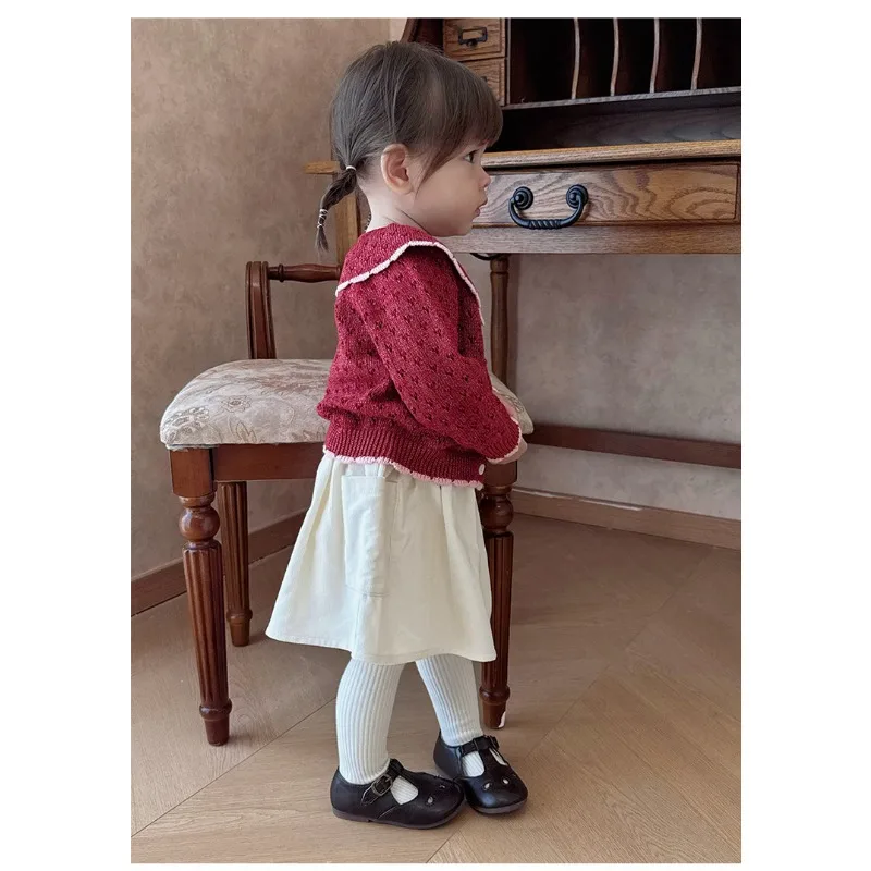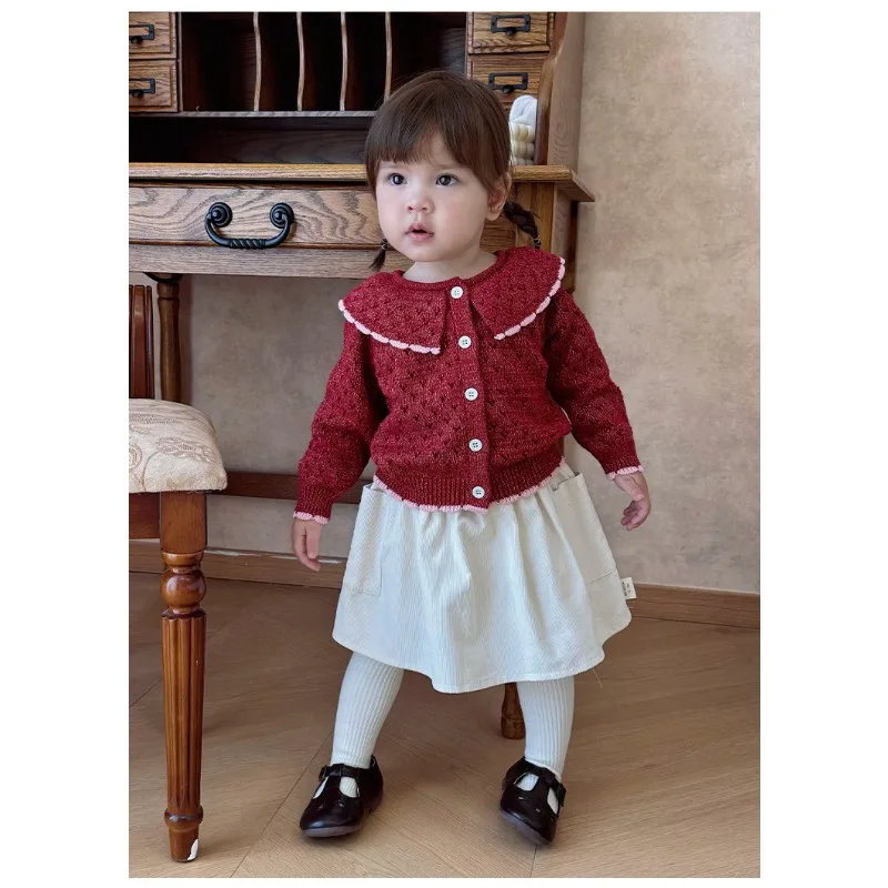 Cardigan lavorato a maglia per bambina con colletto alla Peter Pan Cappotto maglione abbottonato in pizzo scavato per bambini Capispalla autunno inverno D5208 1Cardigan lavorato a maglia per bambina con colletto alla Peter Pan Cappotto maglione abbottonato in pizzo scavato per bambini Capispalla autunno inverno D5208