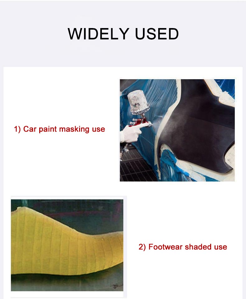 La carta per mascheratura è ampiamente utilizzata nella verniciatura di automobili, la pittura di elettrodomestici, la decorazione di edifici commerciali, l’ufficio, la scrittura, la pittura, la sigillatura dell’industria delle scarpe, ecc.